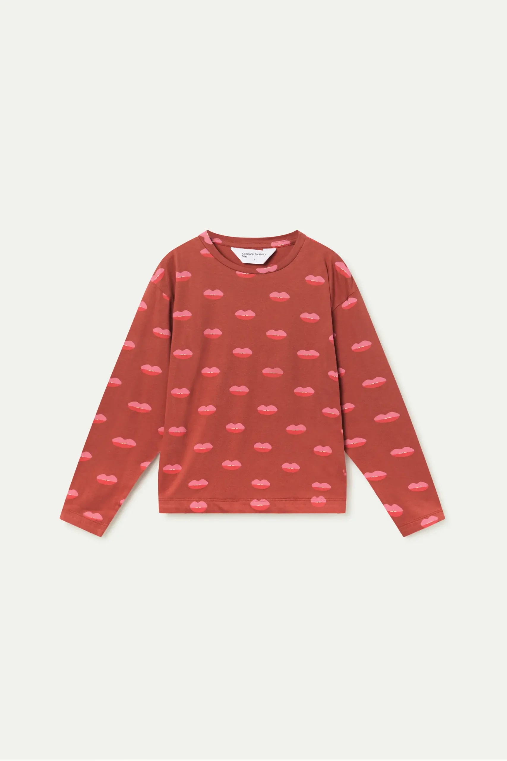 Camiseta de manga larga para niña con estampado Lips en color marrón. Cuello redondo y corte recto.