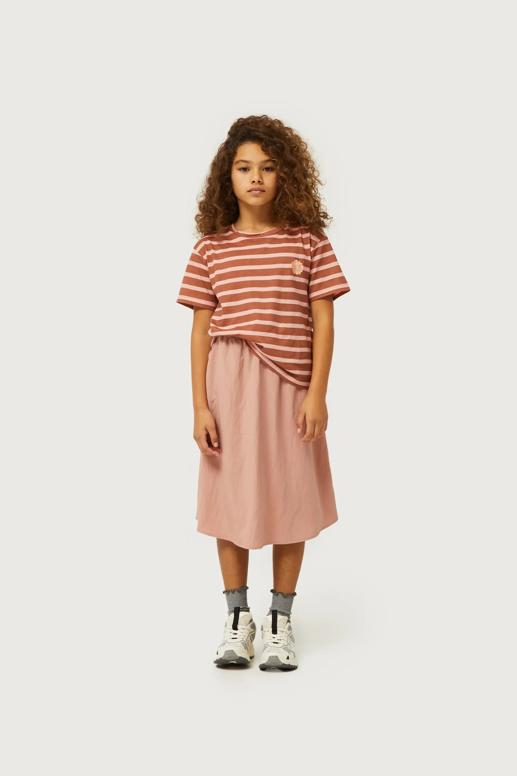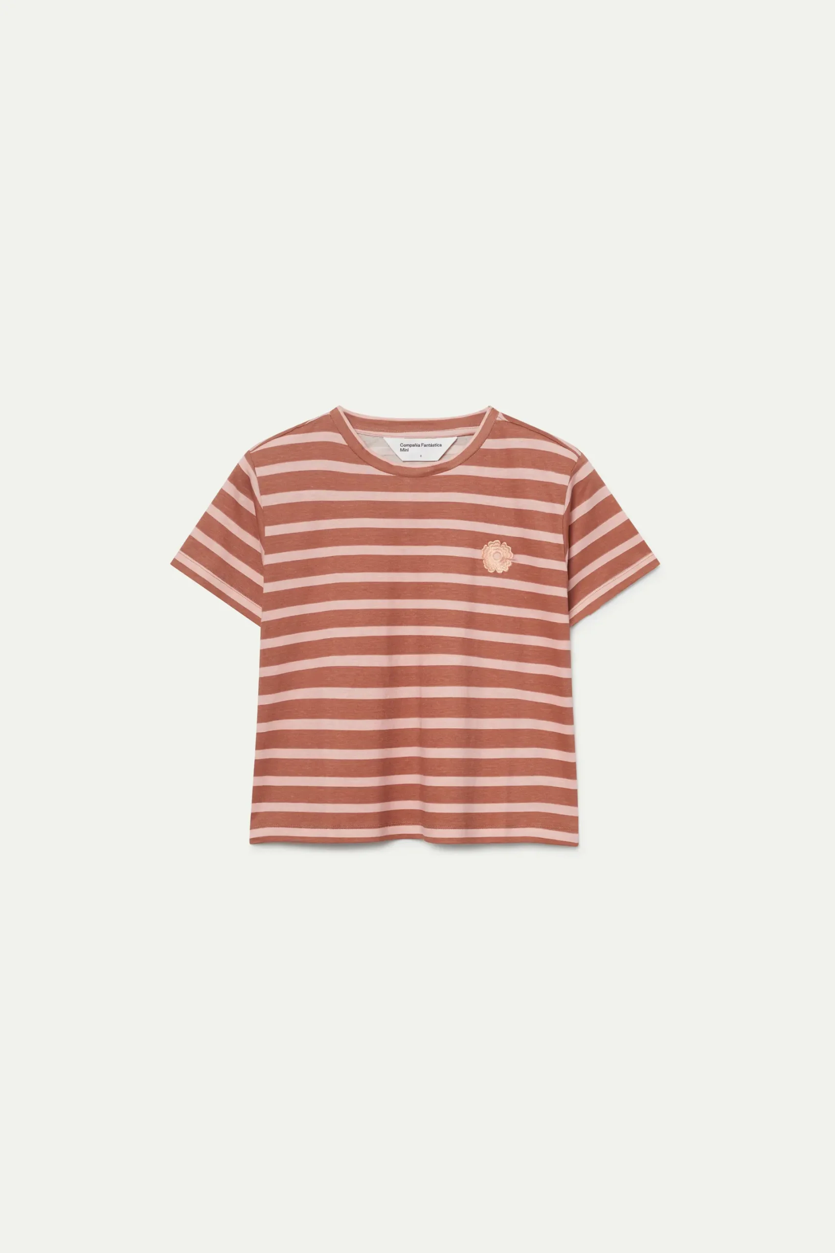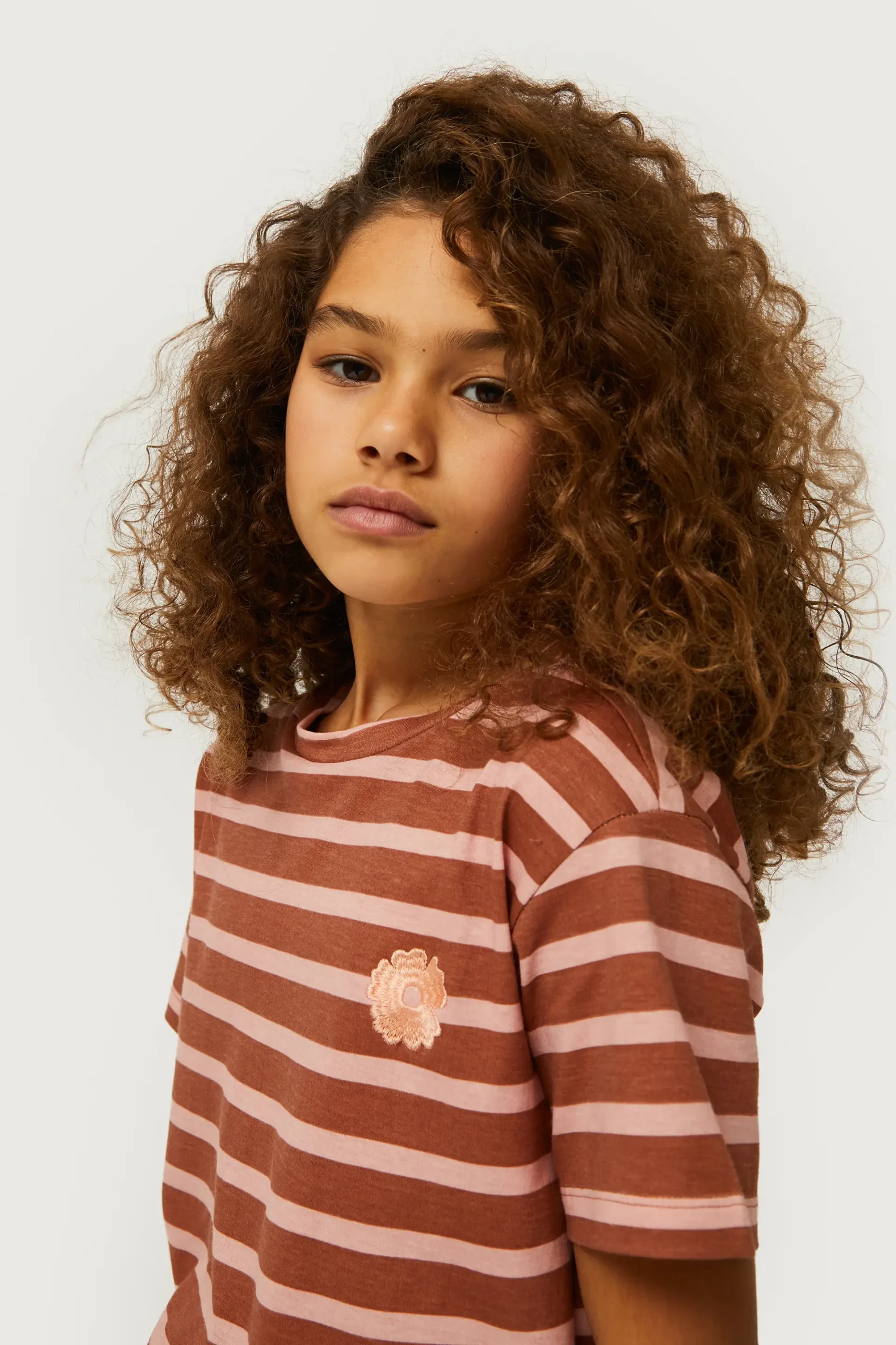 Camiseta de niña con estampado de rayas marrones y rosas. Con cuello redondo y manga corta. Detalle de parche de flor de color crema en el pecho. La modelo mide 134 cm y lleva la talla 8.