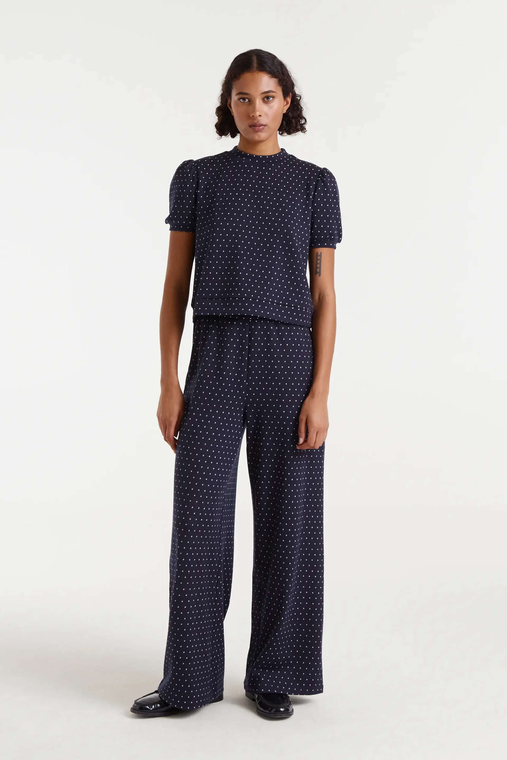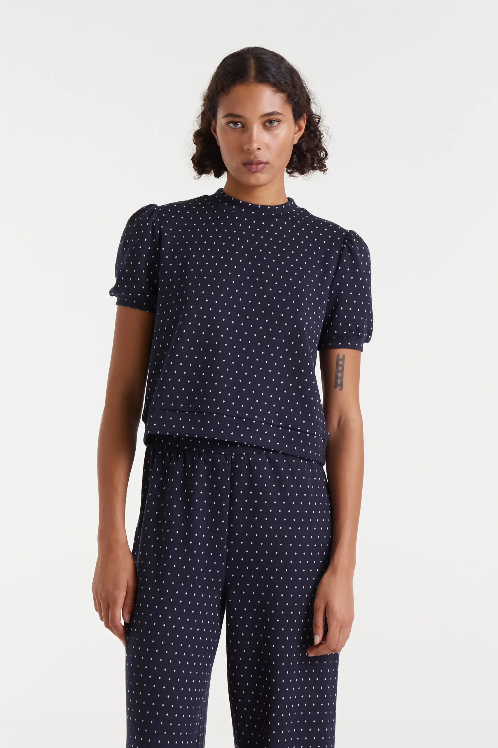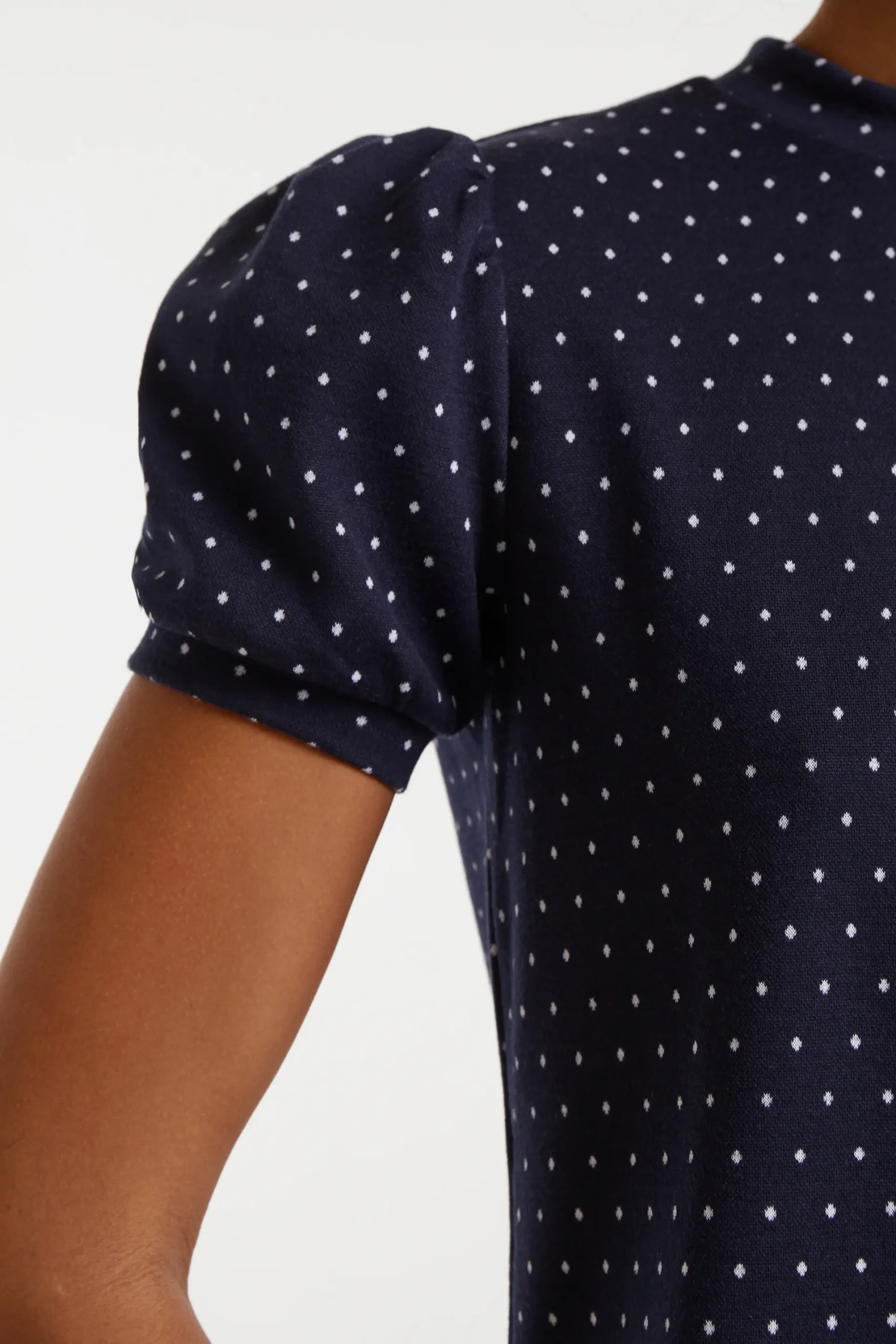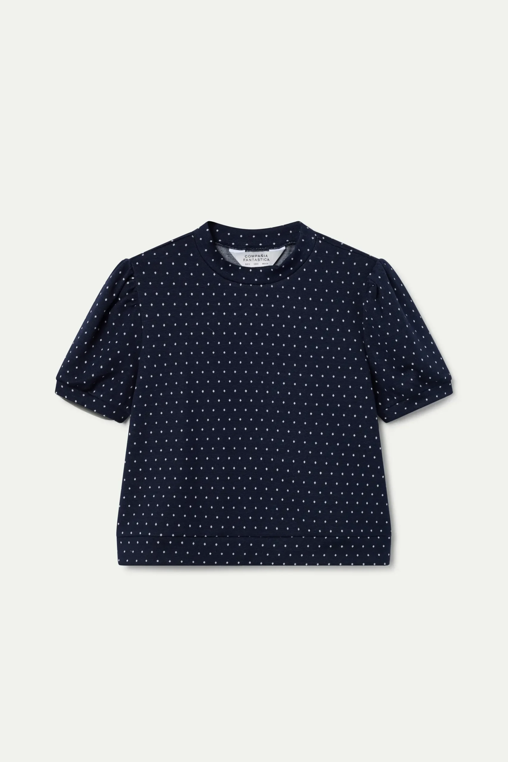 Camiseta de tejido jacquard con estampado Super Mini Dots. Cuello redondo y manga corta abullonada. La modelo mide 175 cm y lleva la talla S.