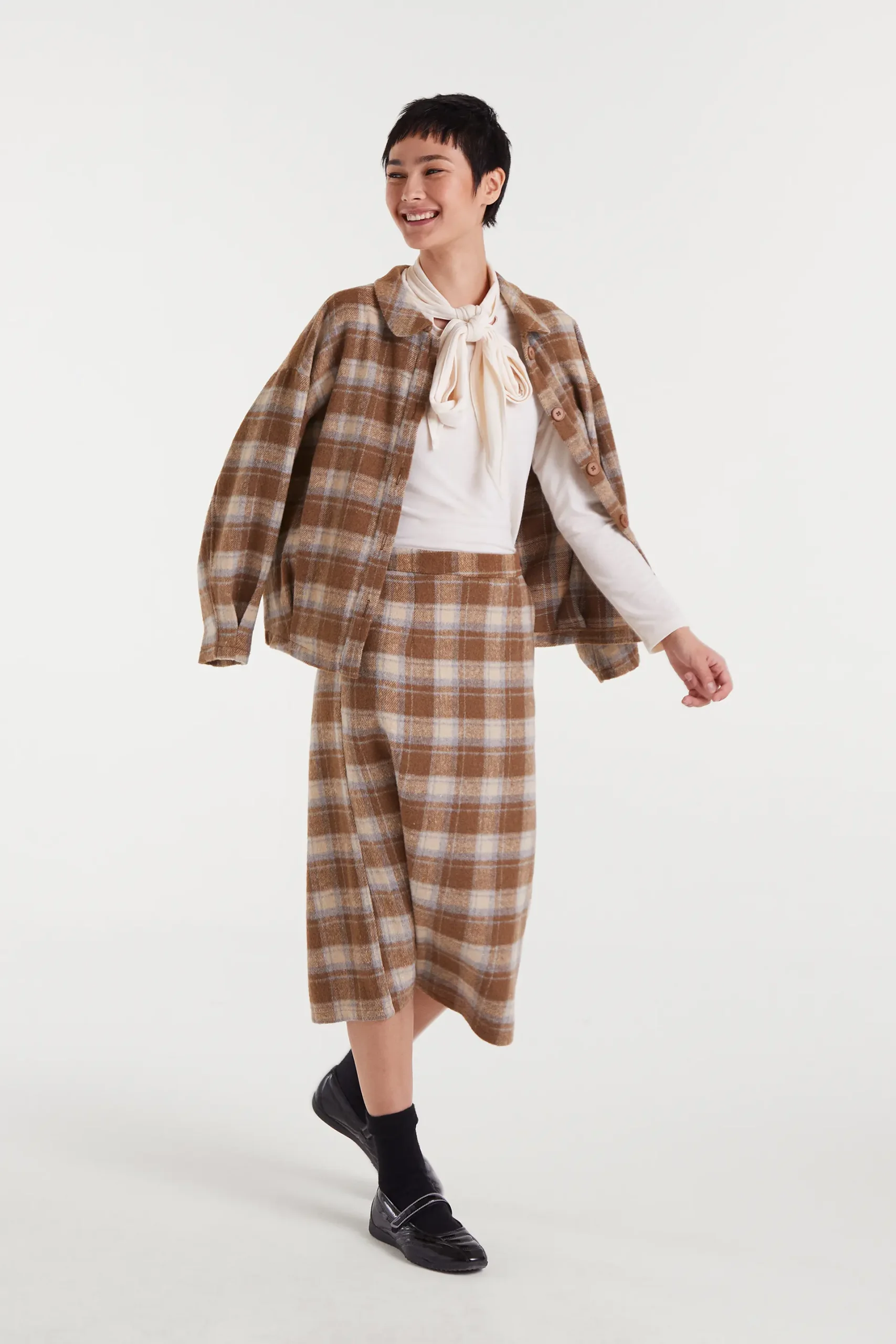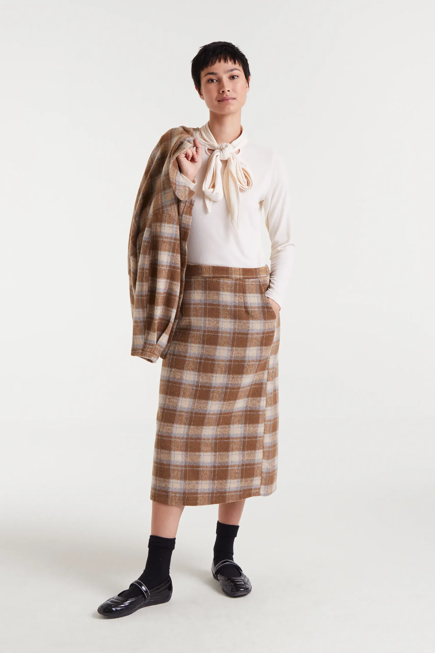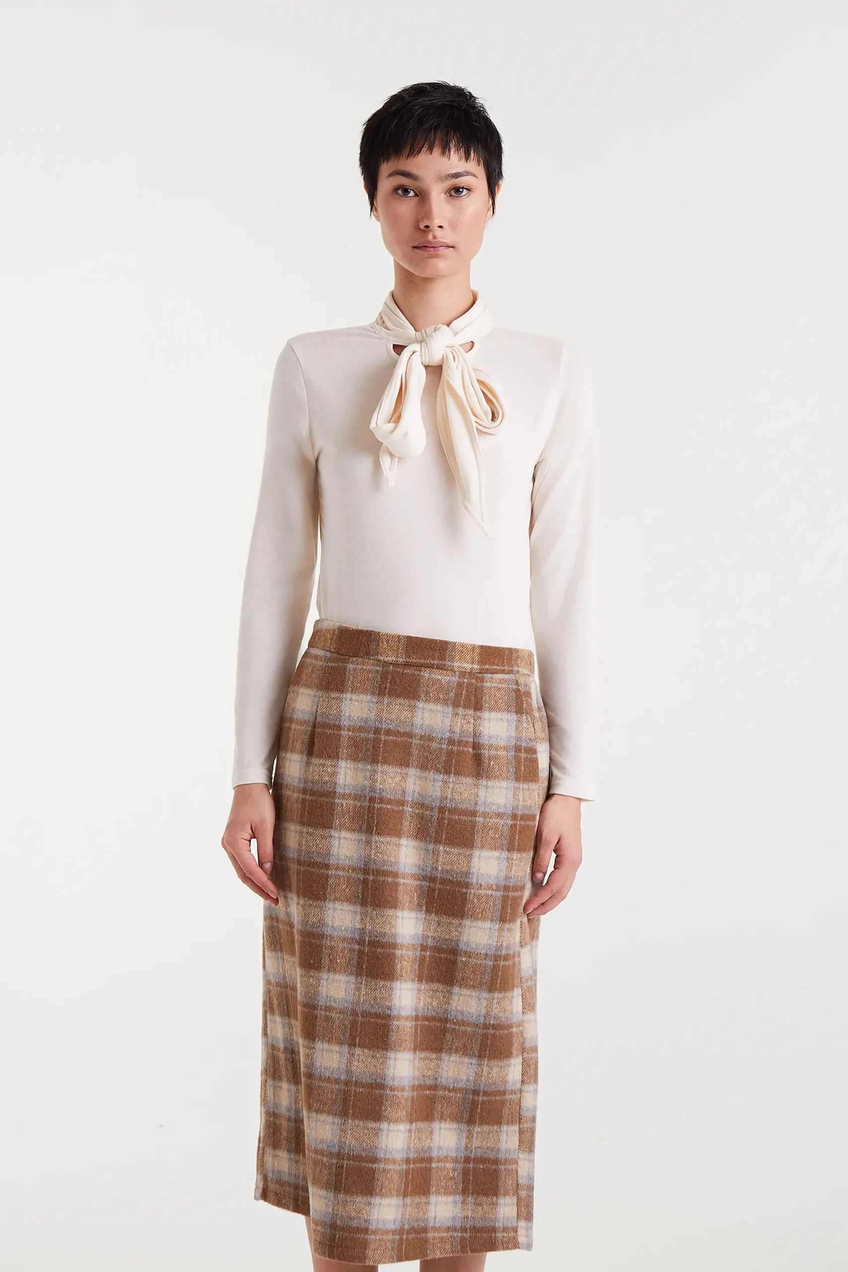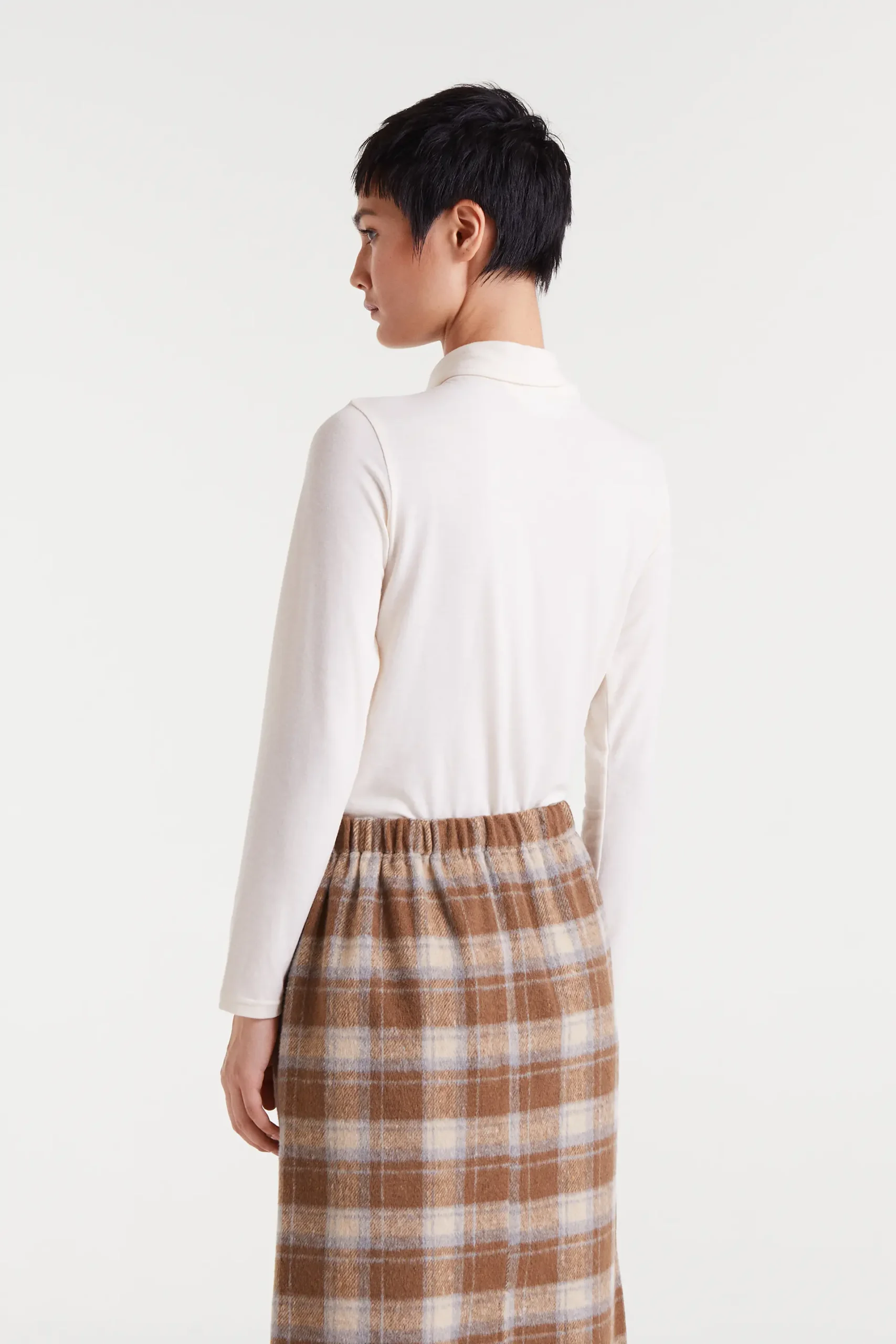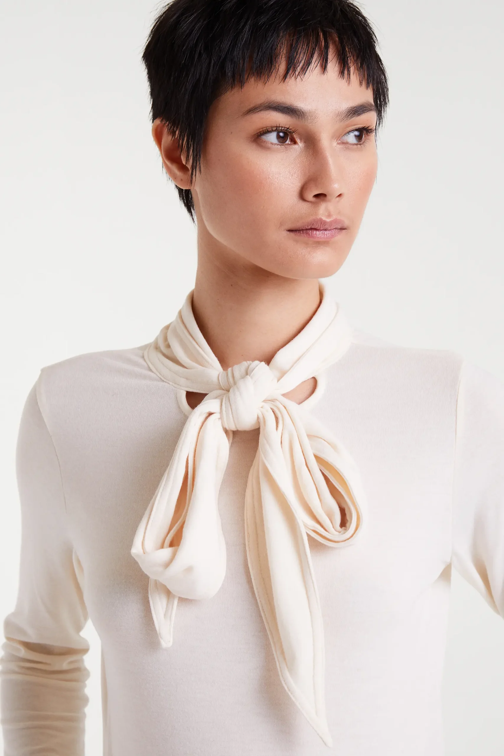 Camiseta con tejido punto ligero de color blanco. Cuello alto con lazada y manga larga. La modelo mide 177 cm y lleva la talla S.