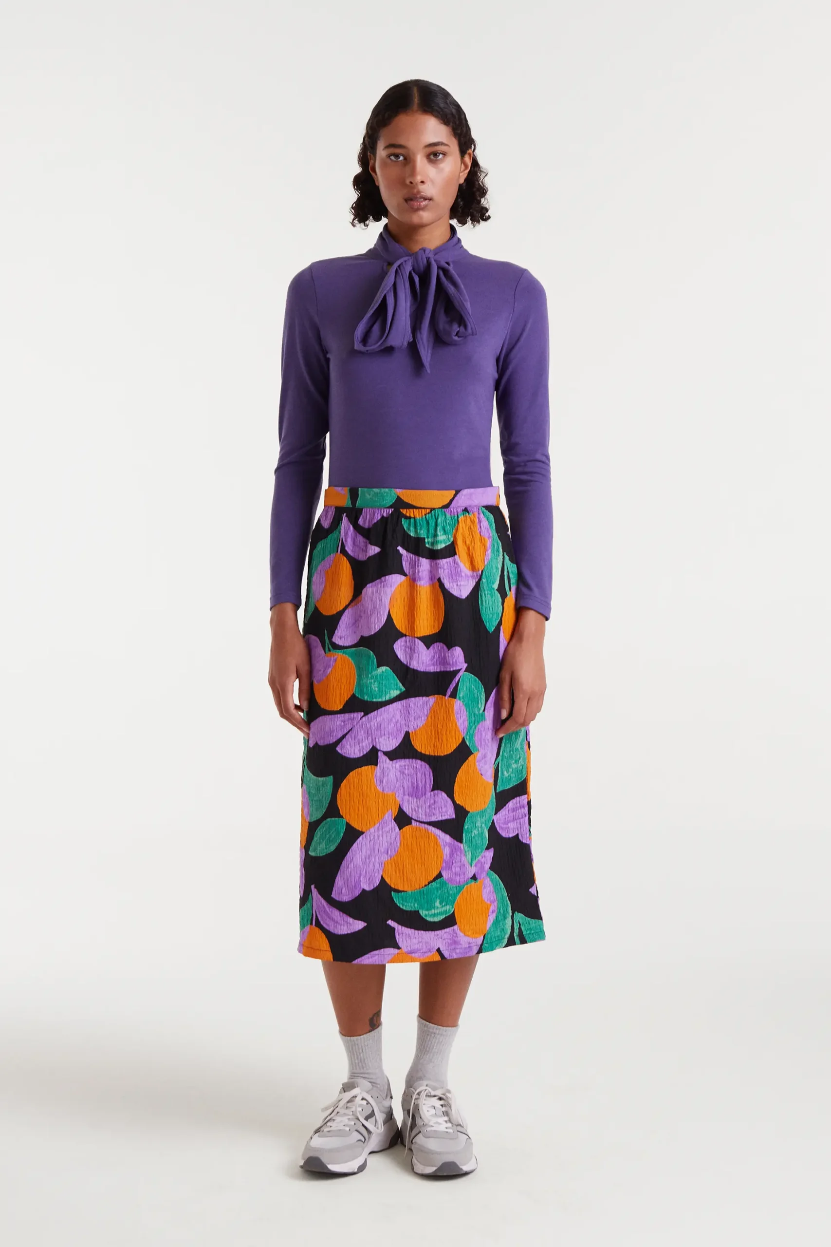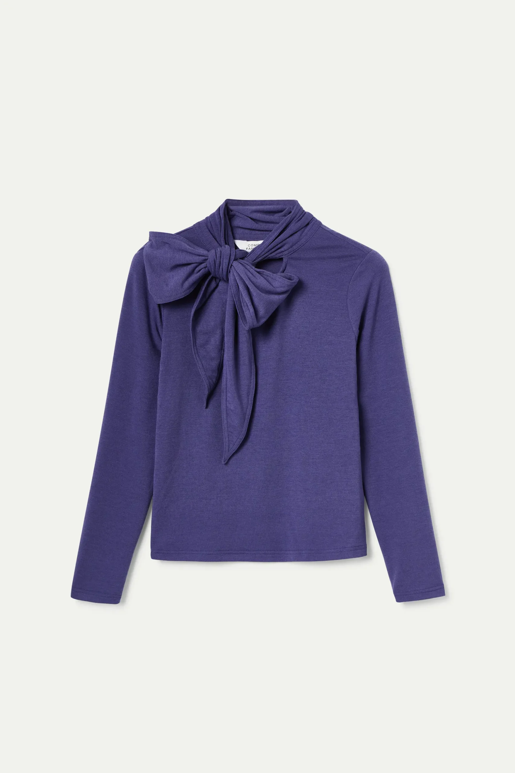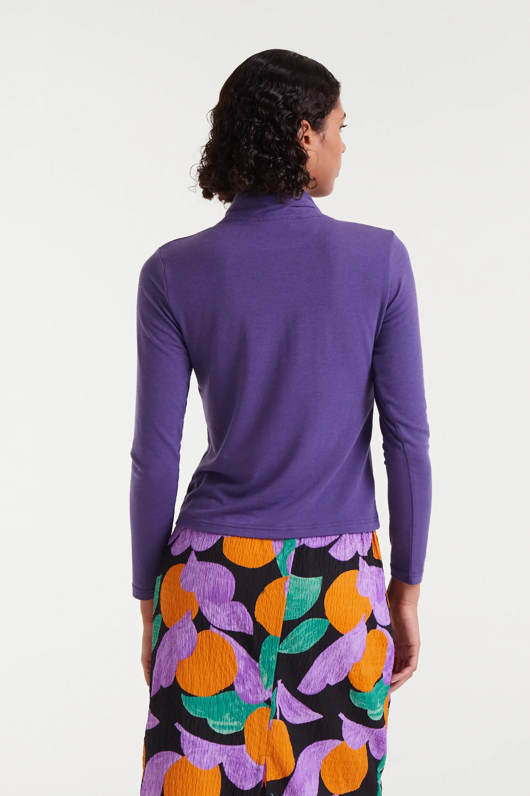 Camiseta con tejido punto ligero de color morado. Cuello alto con lazada y manga larga. La modelo mide 175 cm y lleva la talla S.