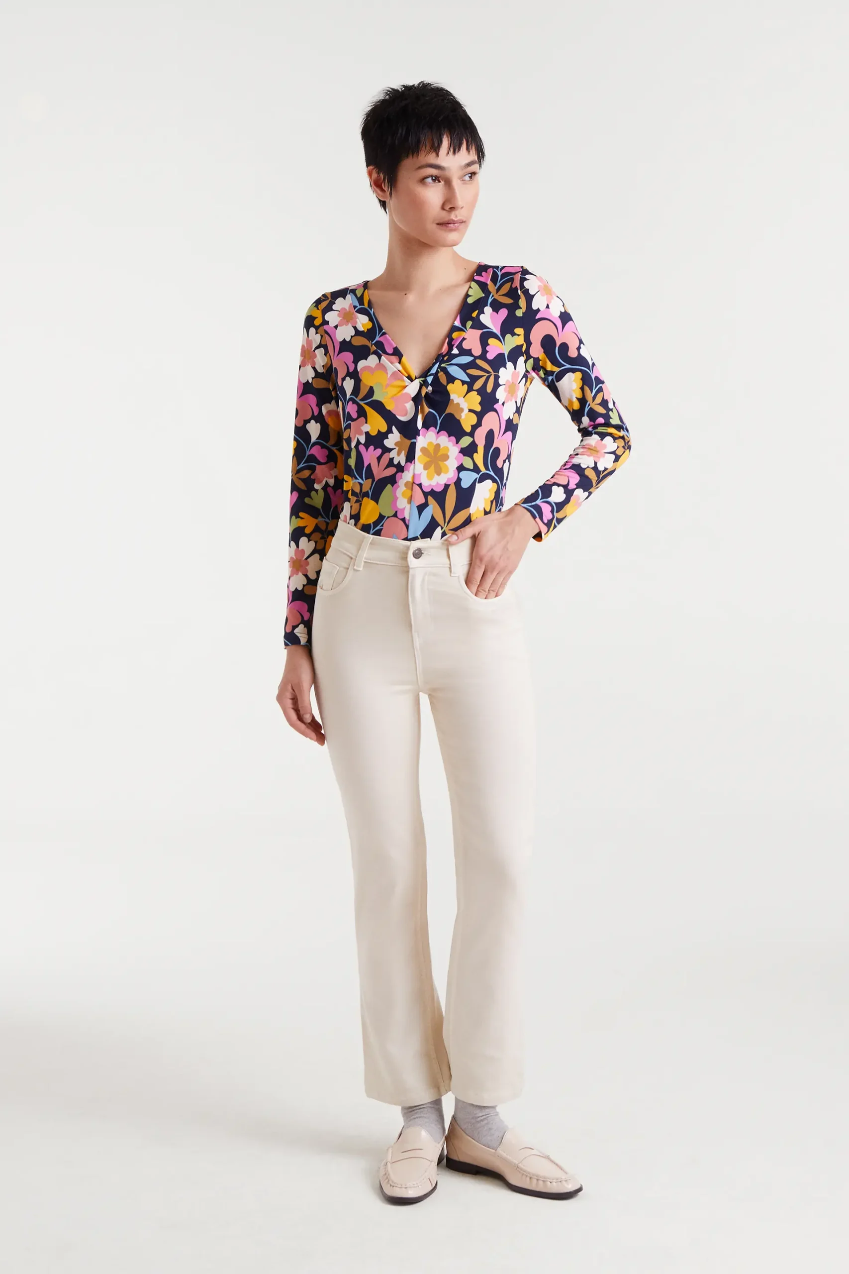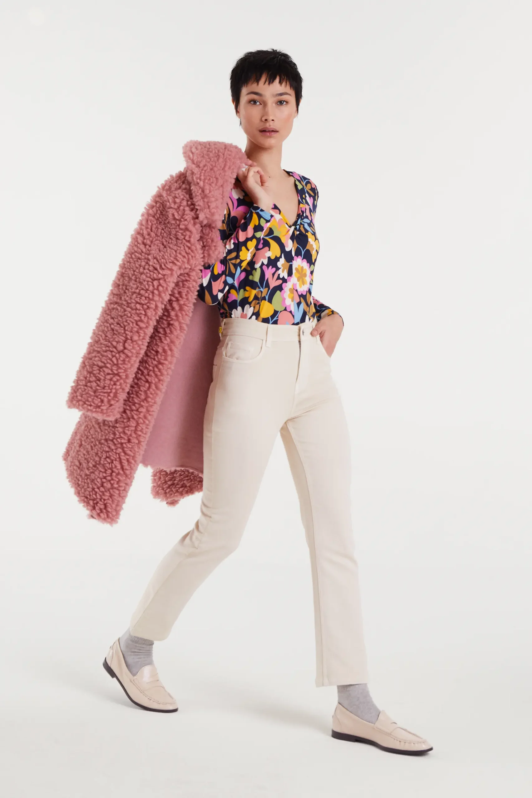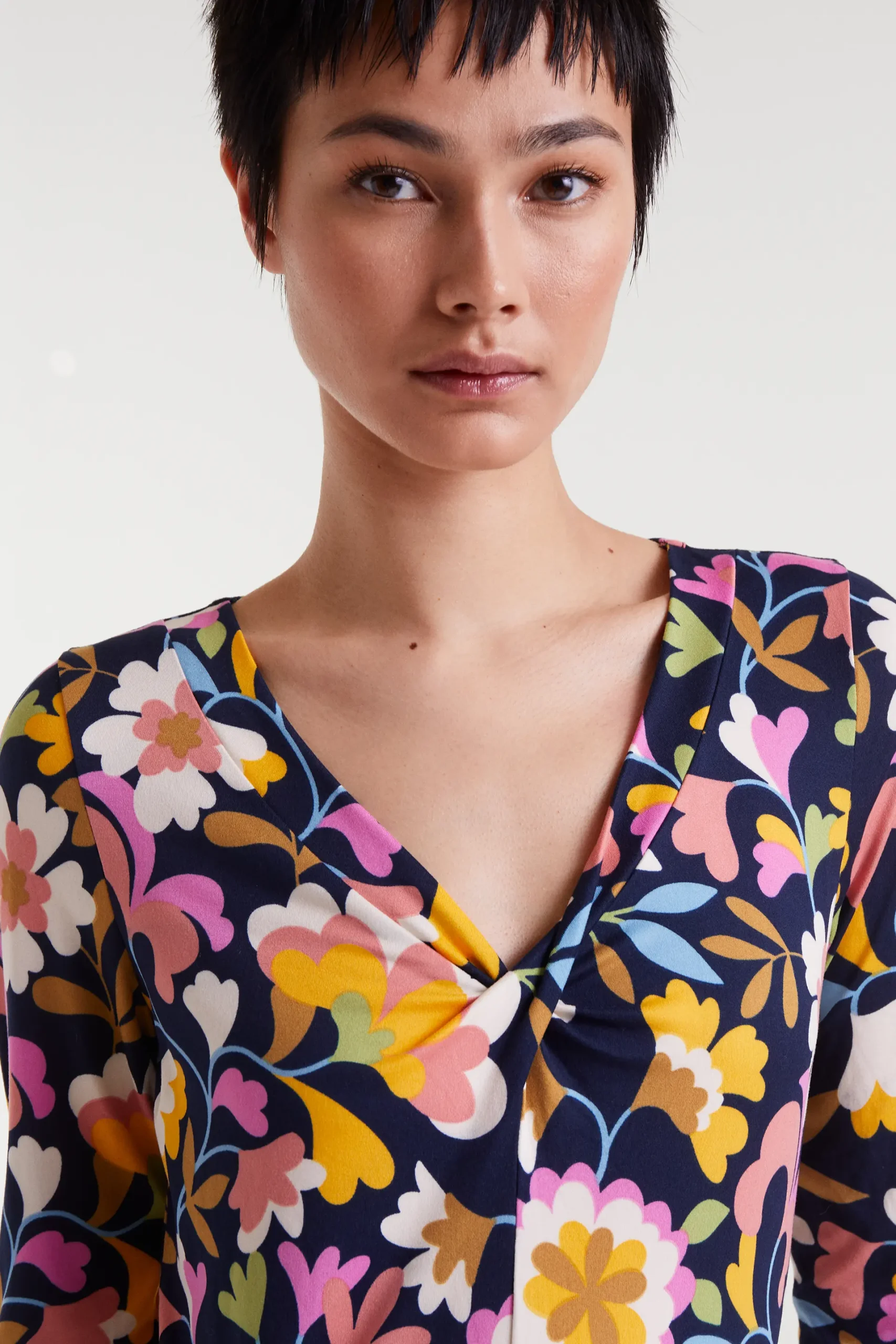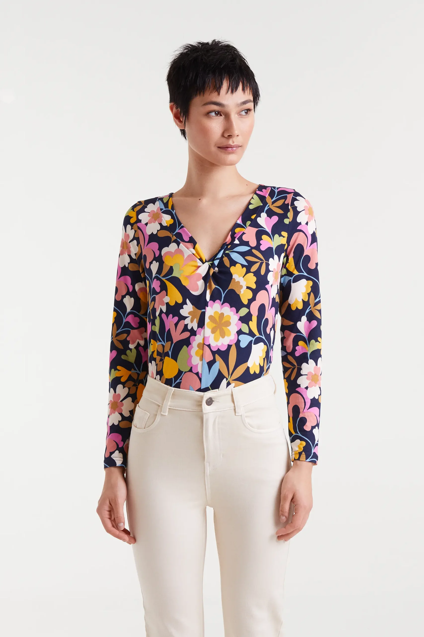 Camiseta con tejido punto estampado Baboushka. Con escote pico anudado y manga larga. La modelo mide 177 cm y lleva la talla S.