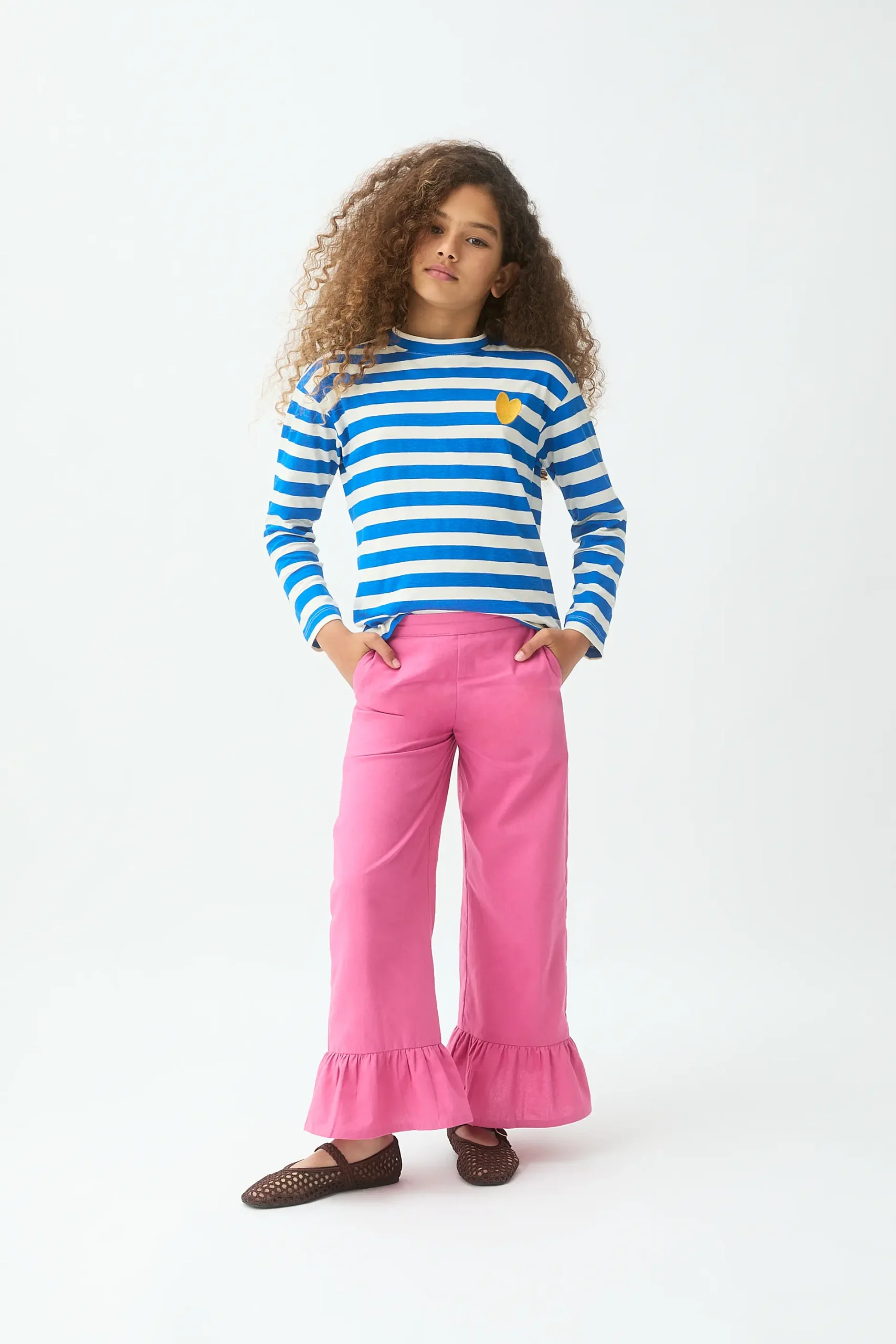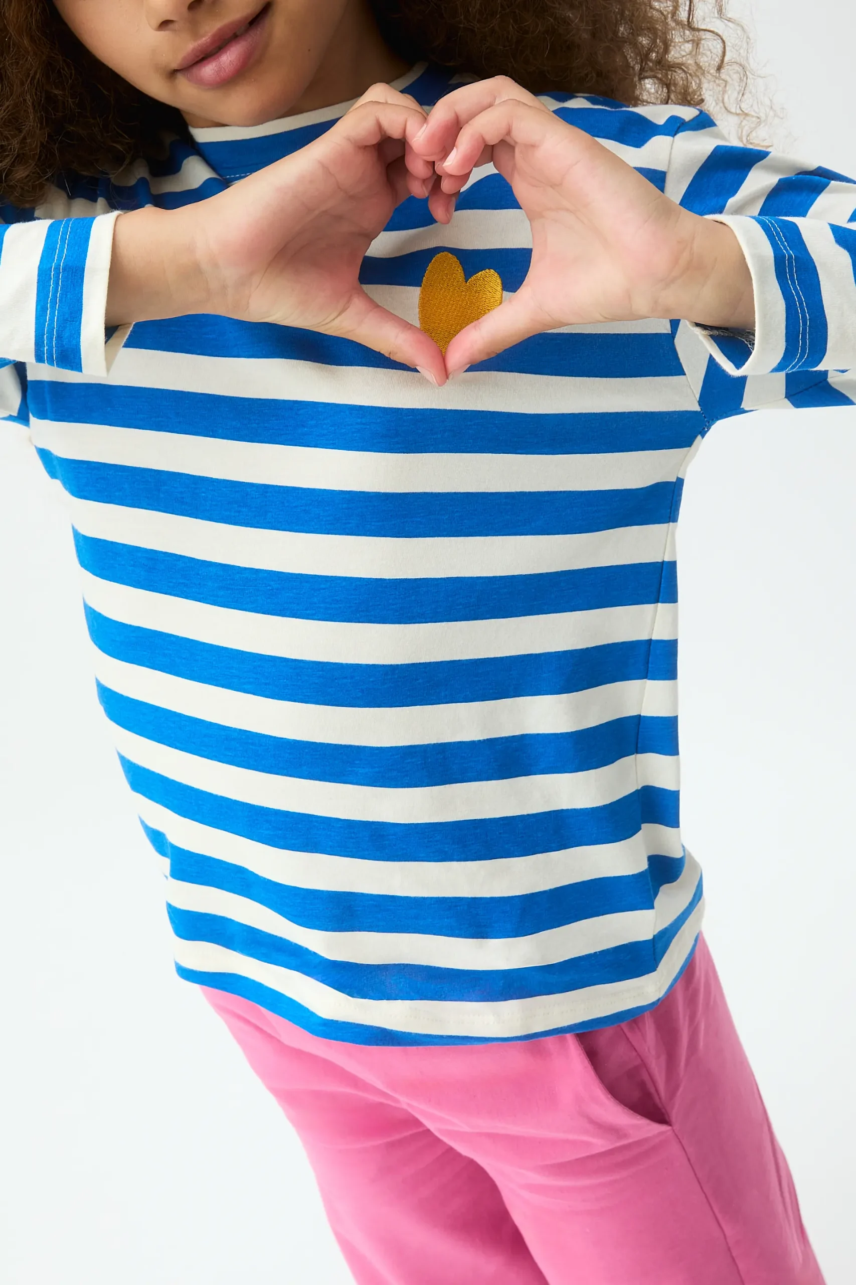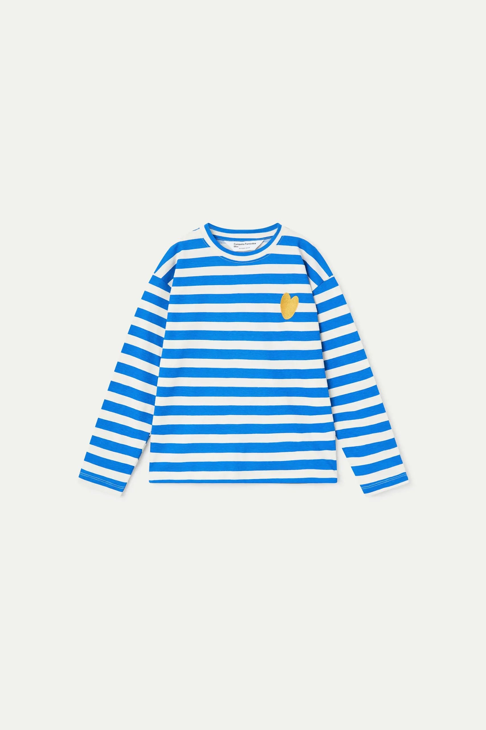 Camiseta de niña de tejido 100% algodón con estampado de rayas en color azul y blanco. Detalle de corazón bordado en color amarillo. Cuello redondo y manga larga. Hombro ligeramente caído. La modelo mide 135 cm y lleva la talla 8-9 años.