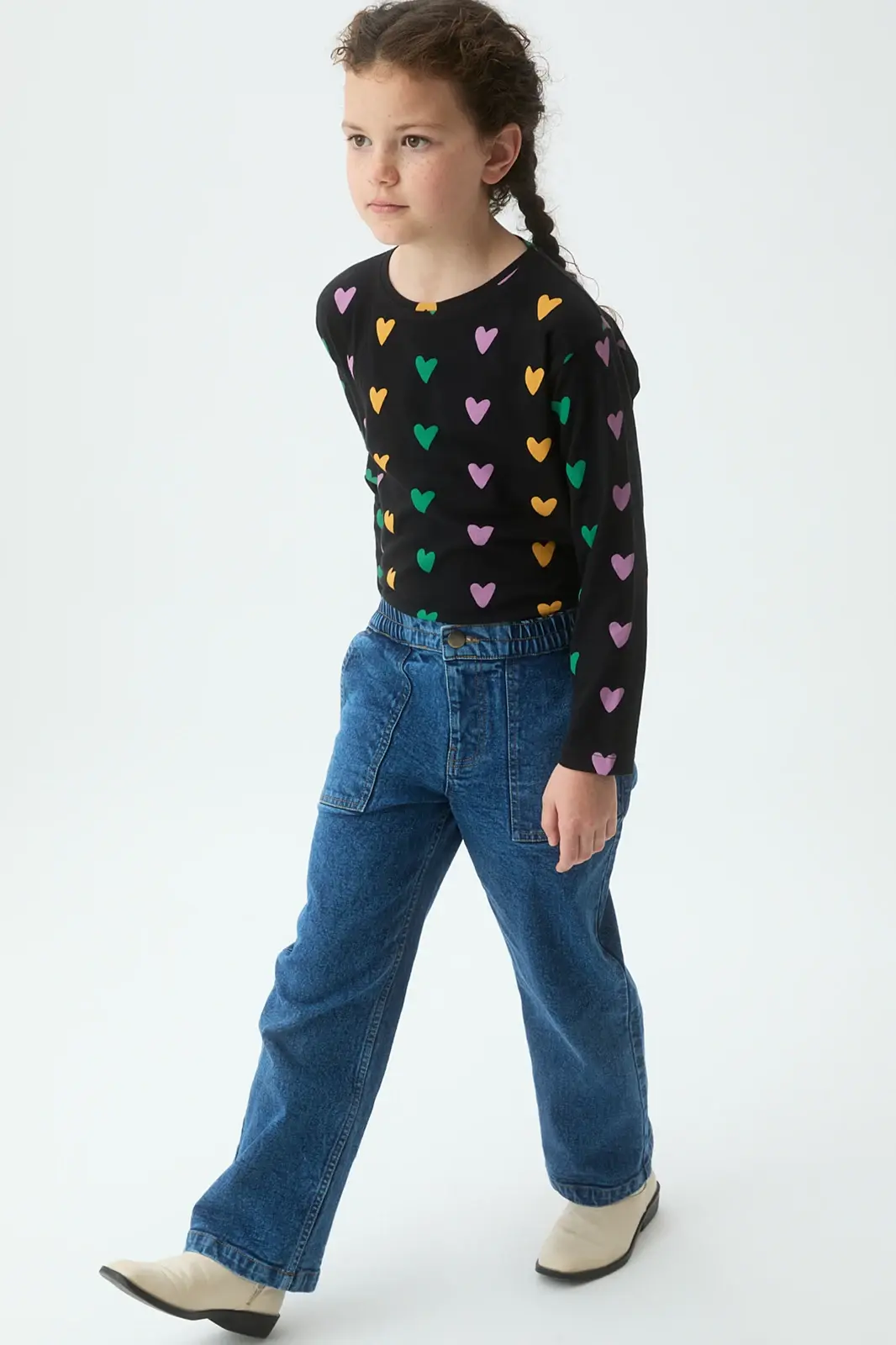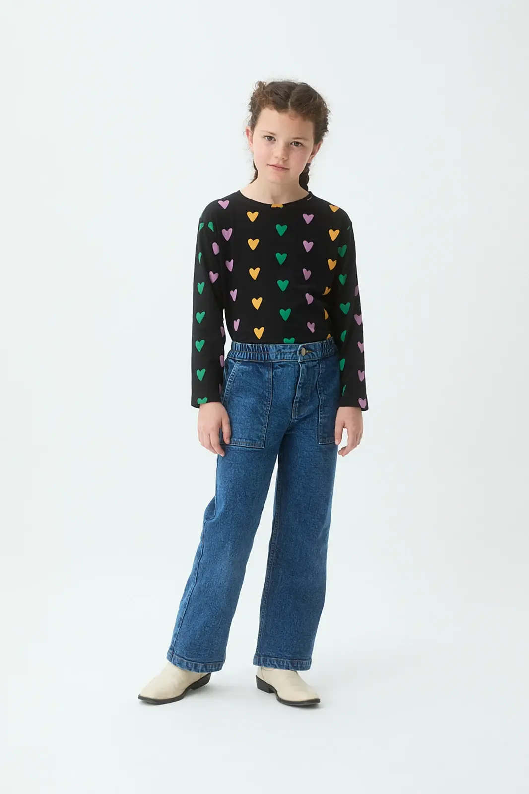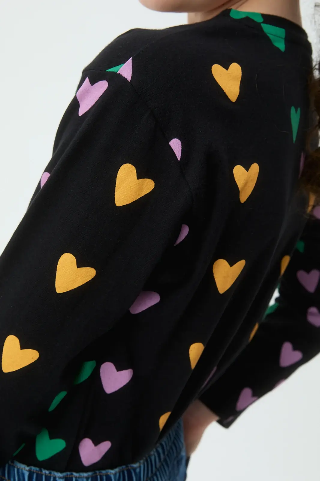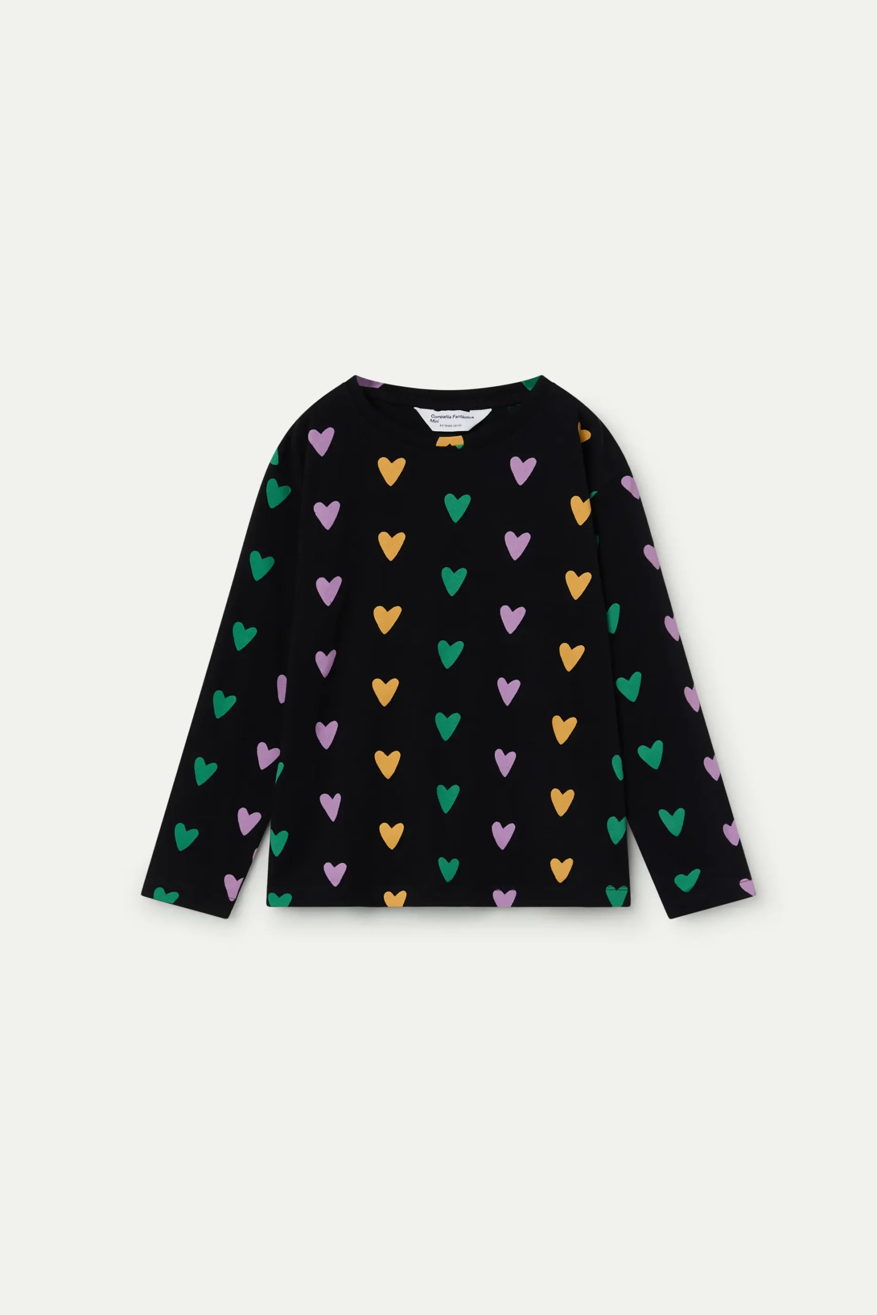 Camiseta negra de algodón con estampado de corazones en colores vivos. Manga larga y cuello redondo.