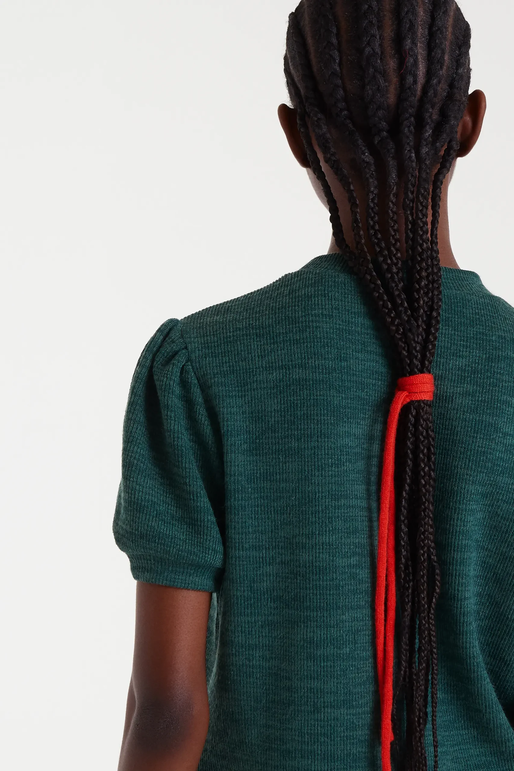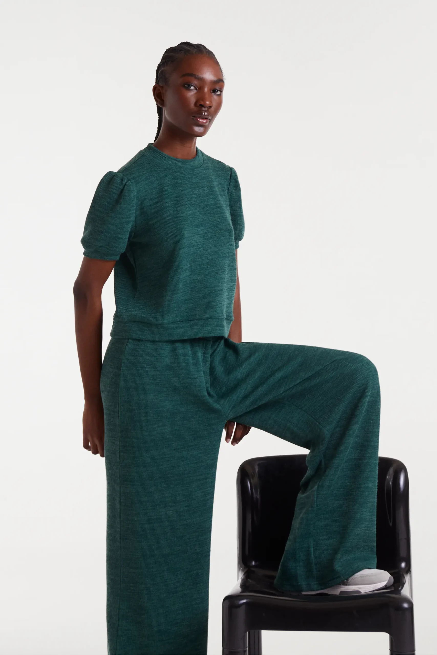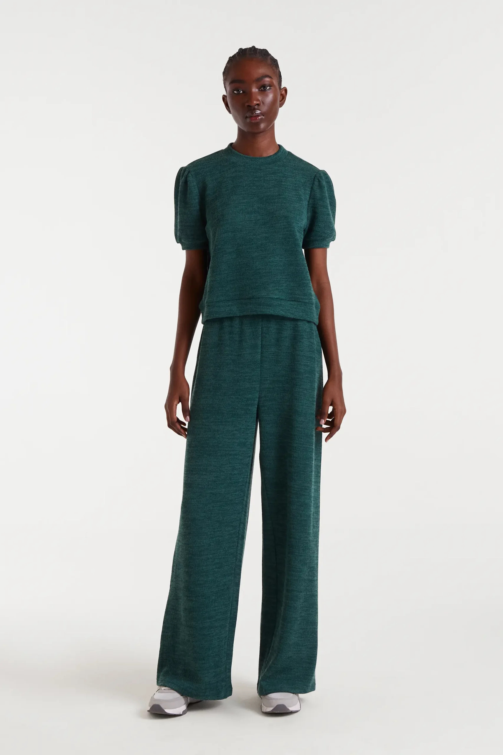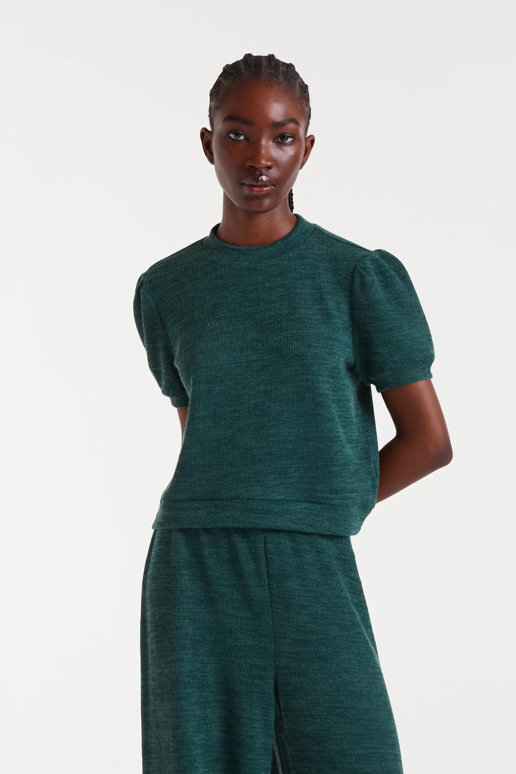 Camiseta con tejido punto canalé de color verde. Cuello redondo y manga corta abullonada. La modelo mide 178 cm y lleva la talla S.