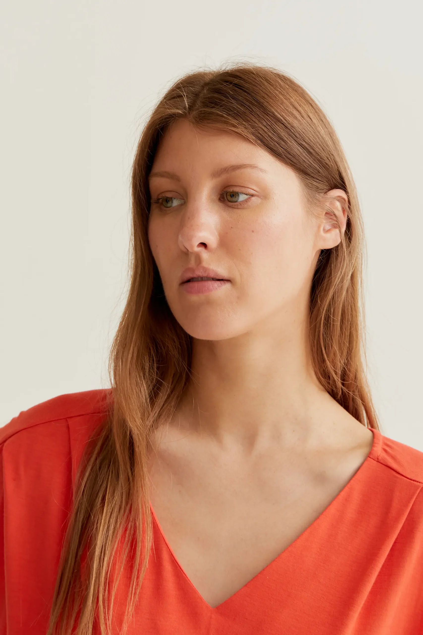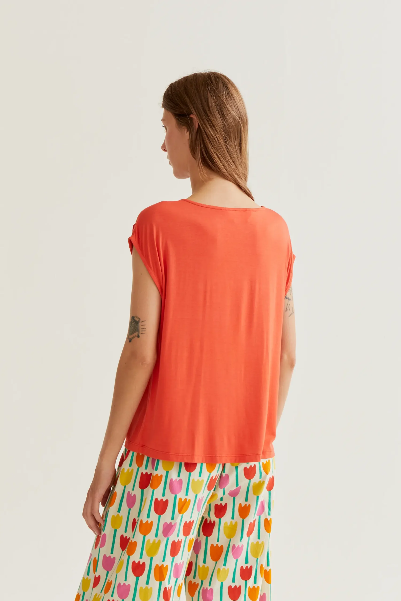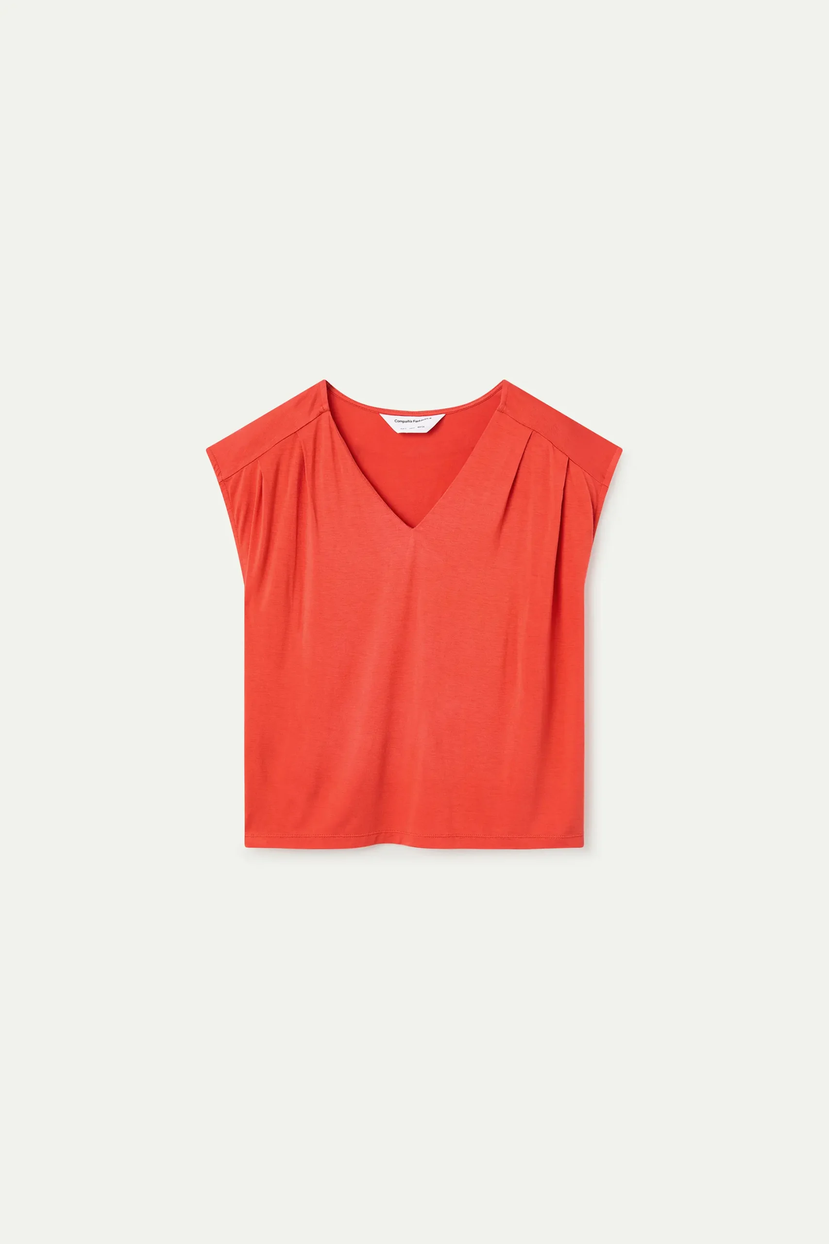 Camiseta rojo con tejido jersey bamboo de color negro. Escote pico y sin mangas. La modelo mide 177 cm y lleva la talla S.