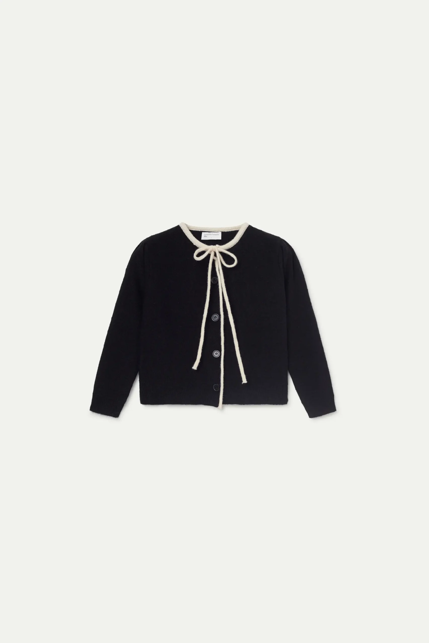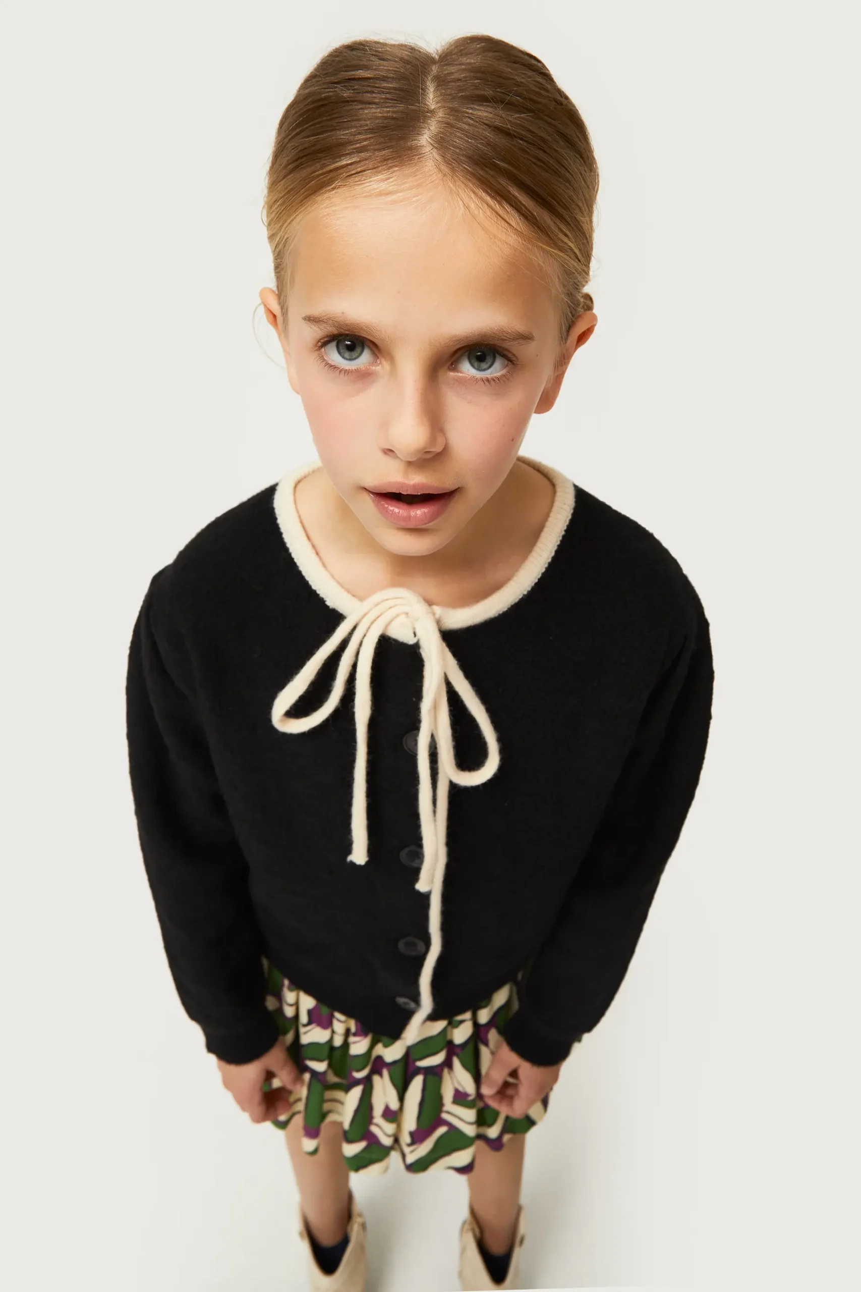 Cárdigan de niña de punto en color negro. Con cuello redondo y manga larga. Cierre frontal con botones. Detalle de lazada en el cuello. La modelo mide 140 cm y lleva la talla 8.