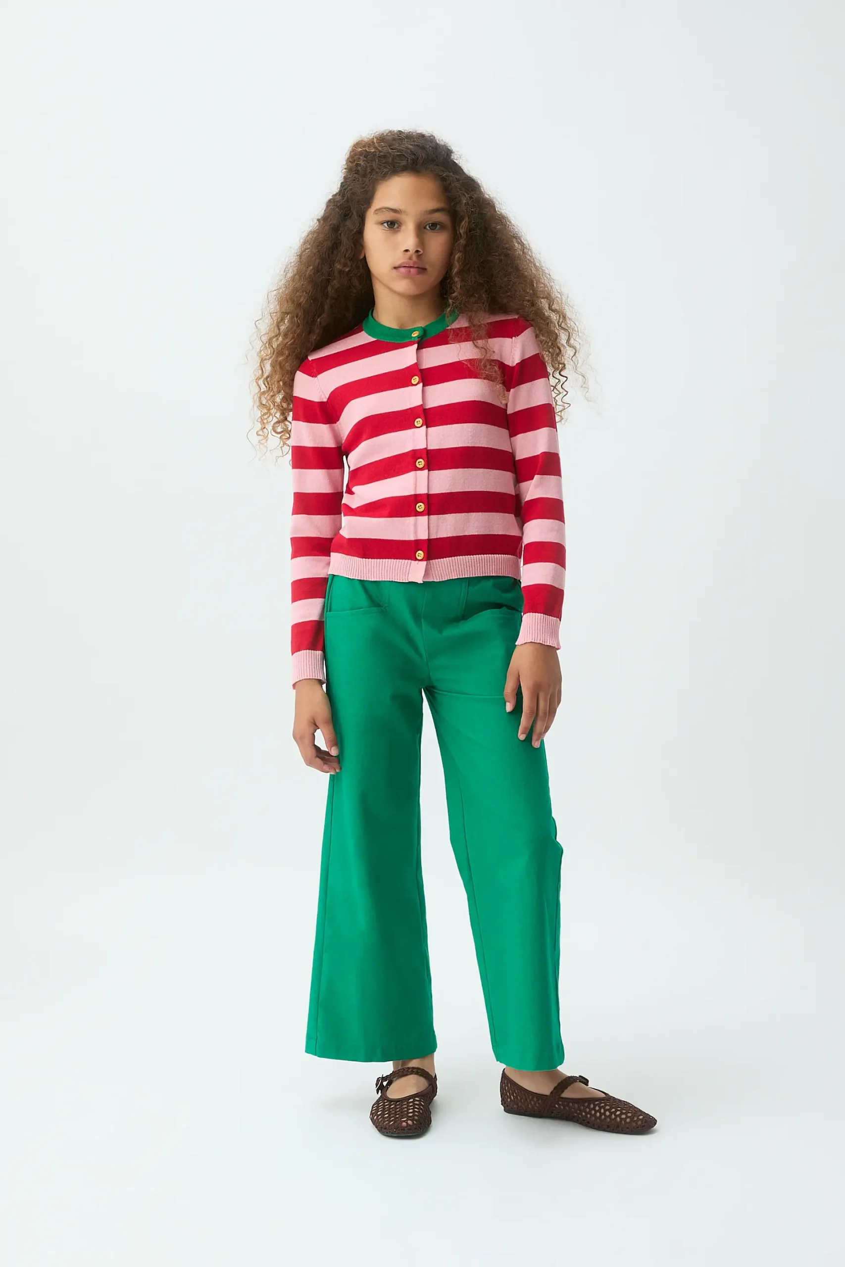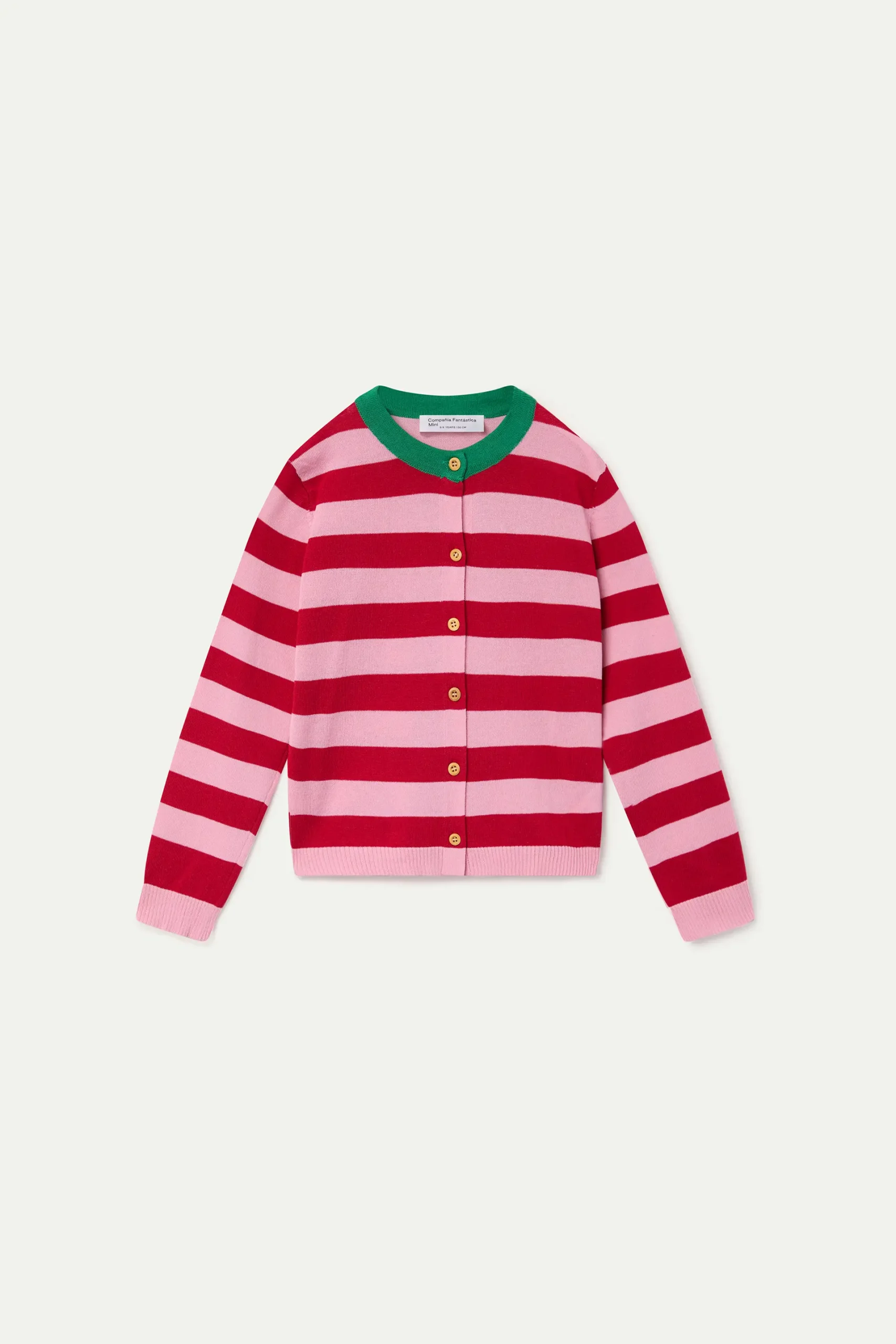 Cárdigan de niña con tejido punto estampado de rayas de color rosa y rojo. Cuello redondo en color verde y manga larga. Cierre frontal con botones en color amarillo. Detalles acabados en rib. La modelo mide 135 cm y lleva la talla 8-9años.