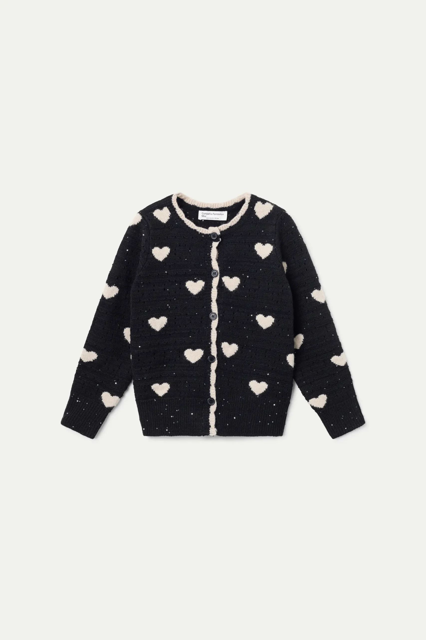 Cardigan de punto negro con corazones blancos y botones frontales. Cuello redondo con detalle en borde blanco.