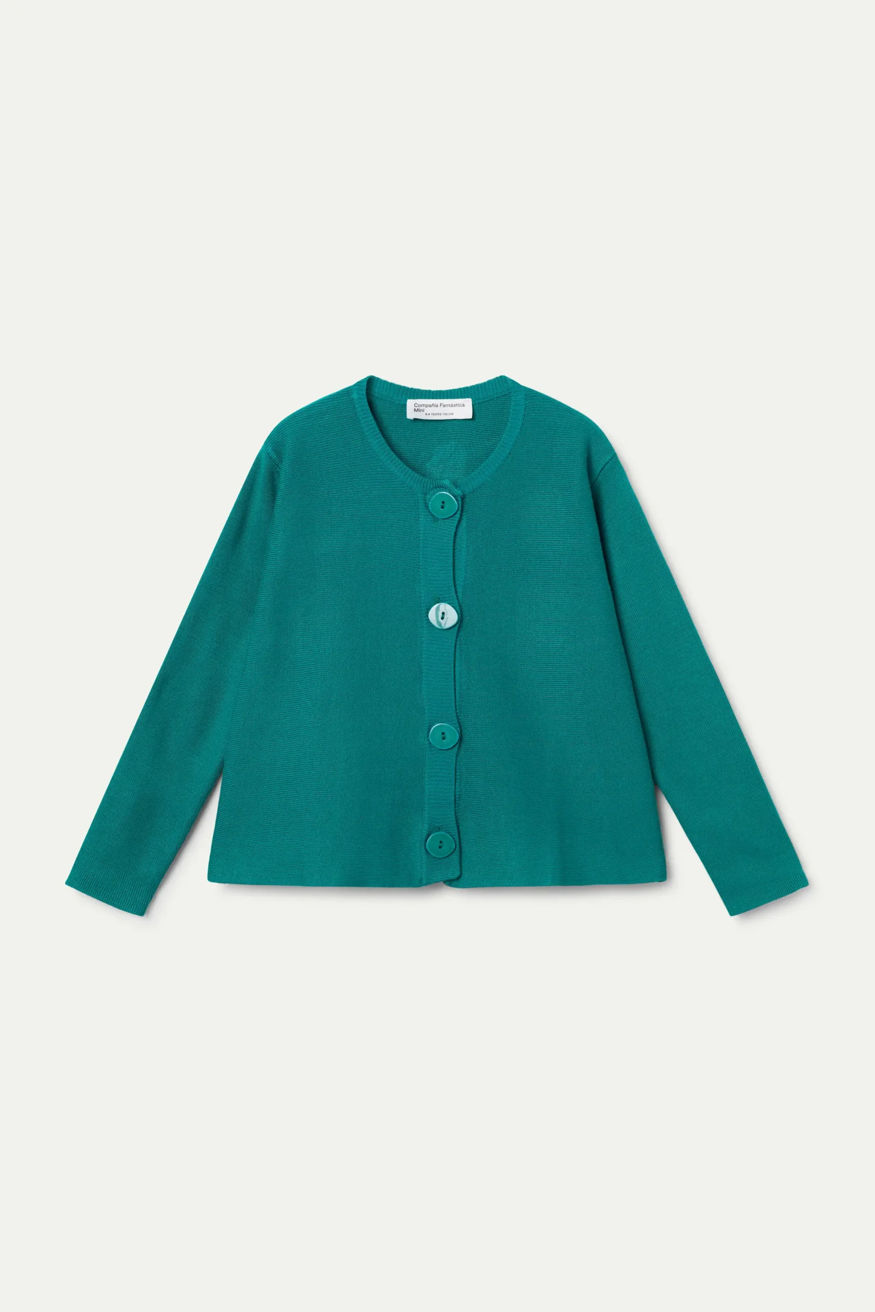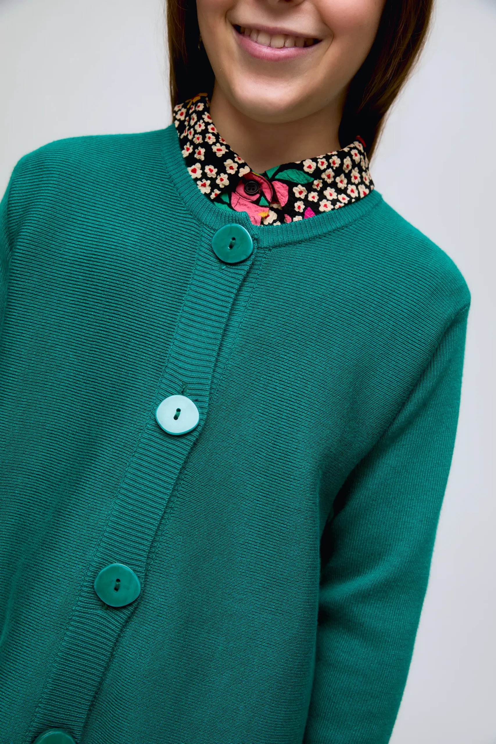 Cárdigan de niña de punto con corte evasé de color verde. Con cuello redondo y manga larga. Cierre con botones frontales grandes.
