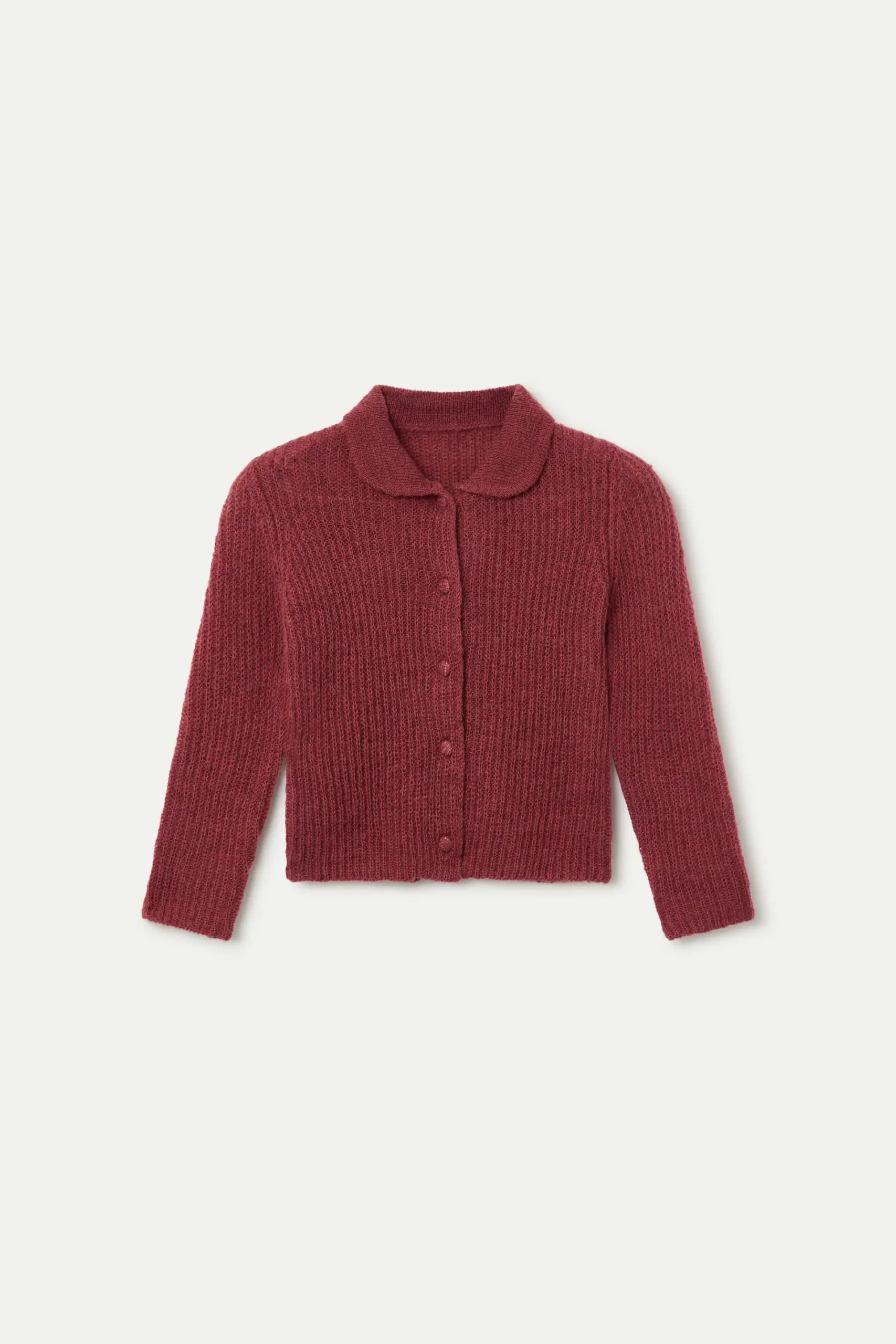 Cárdigan de punto burdeos con cuello y botones al frente.