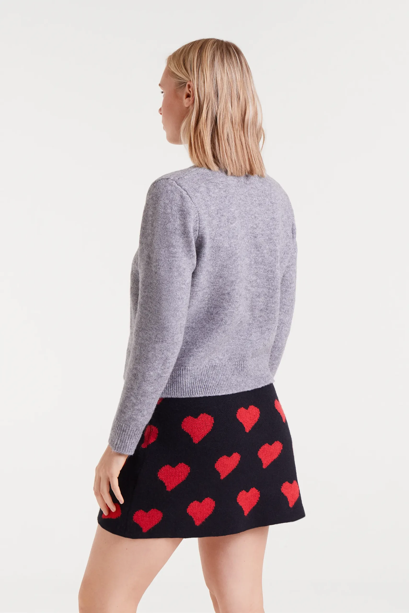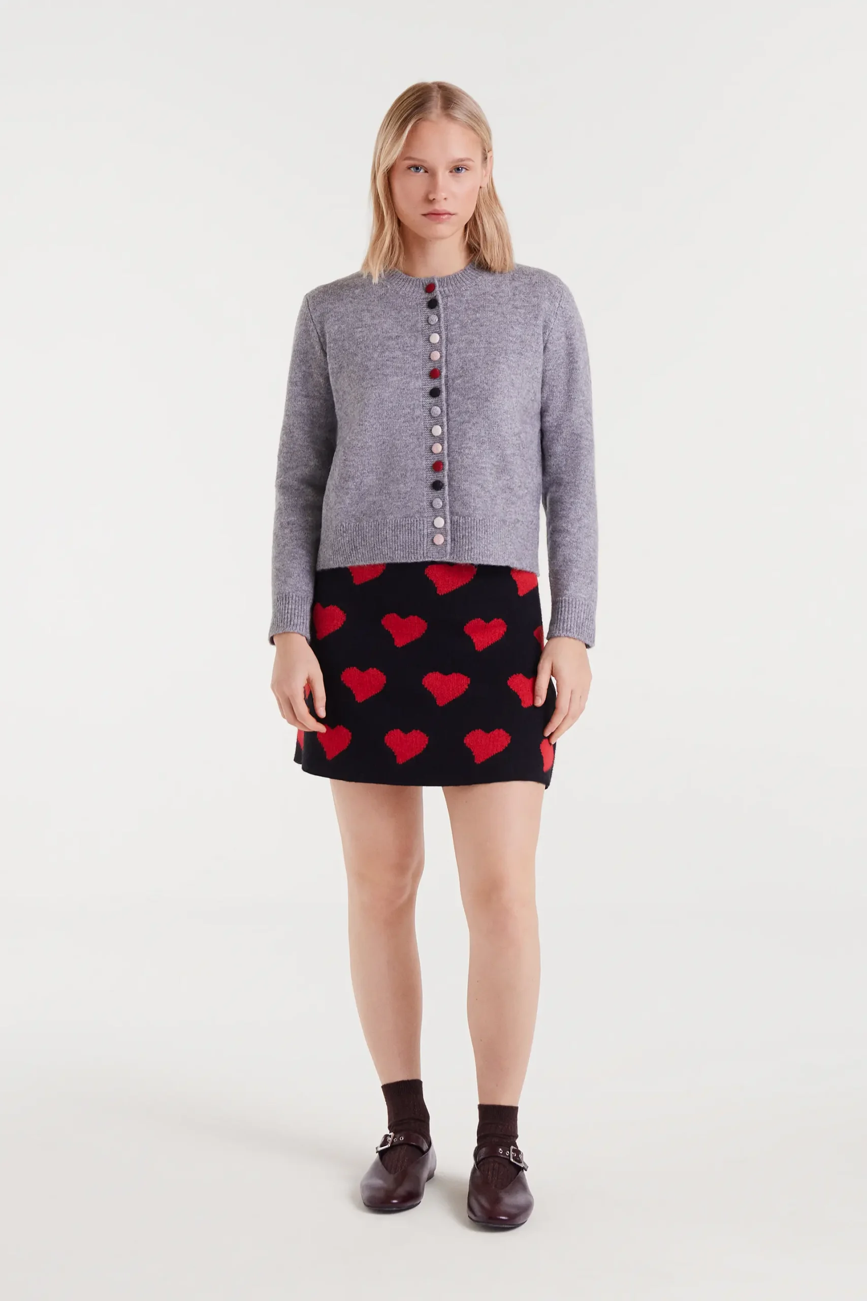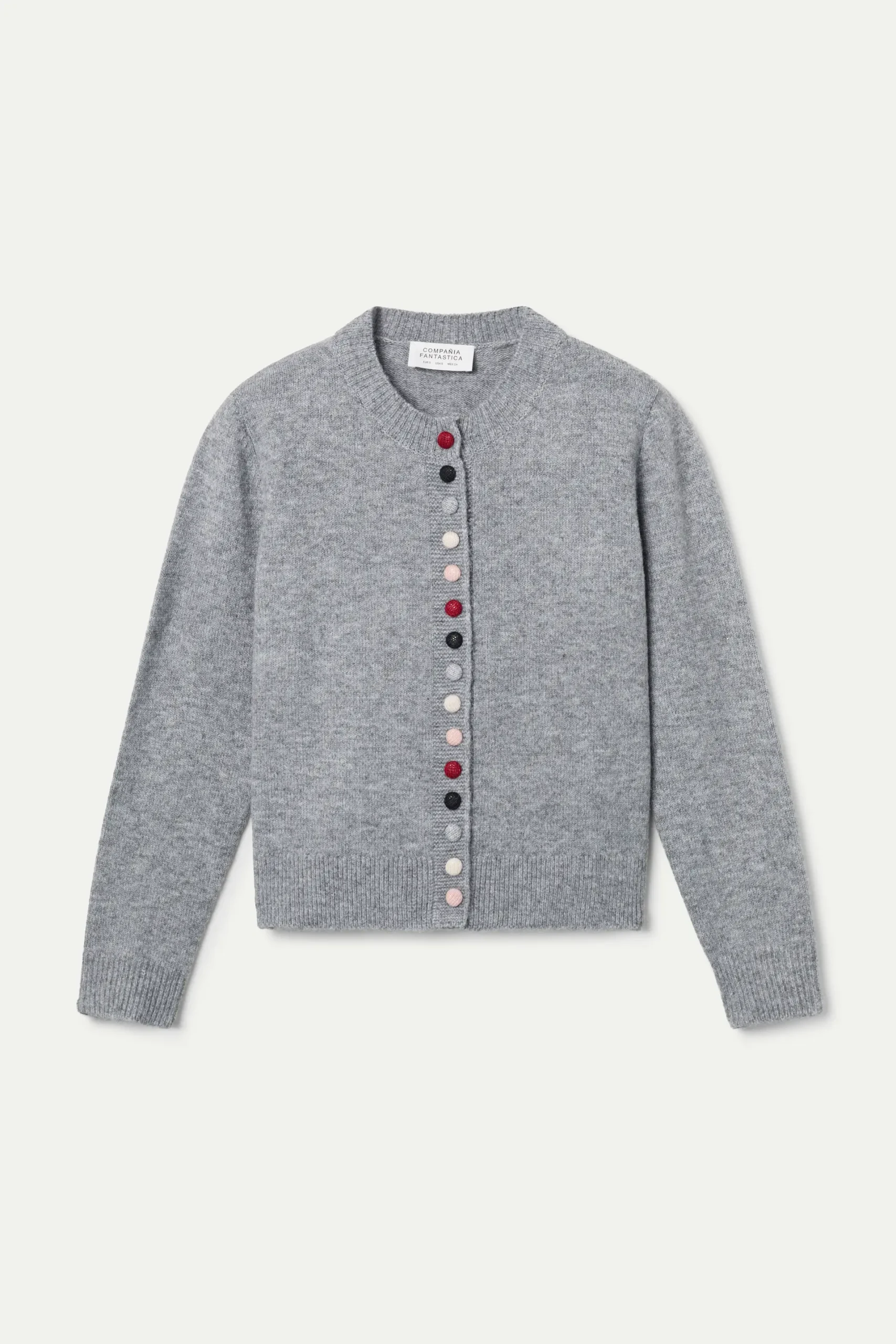Cárdigan de punto color gris. Cuello redondo y manga larga. Cierre frontal con botones multicolor. Detalles en rib. La modelo mide 179 cm y lleva la talla S.