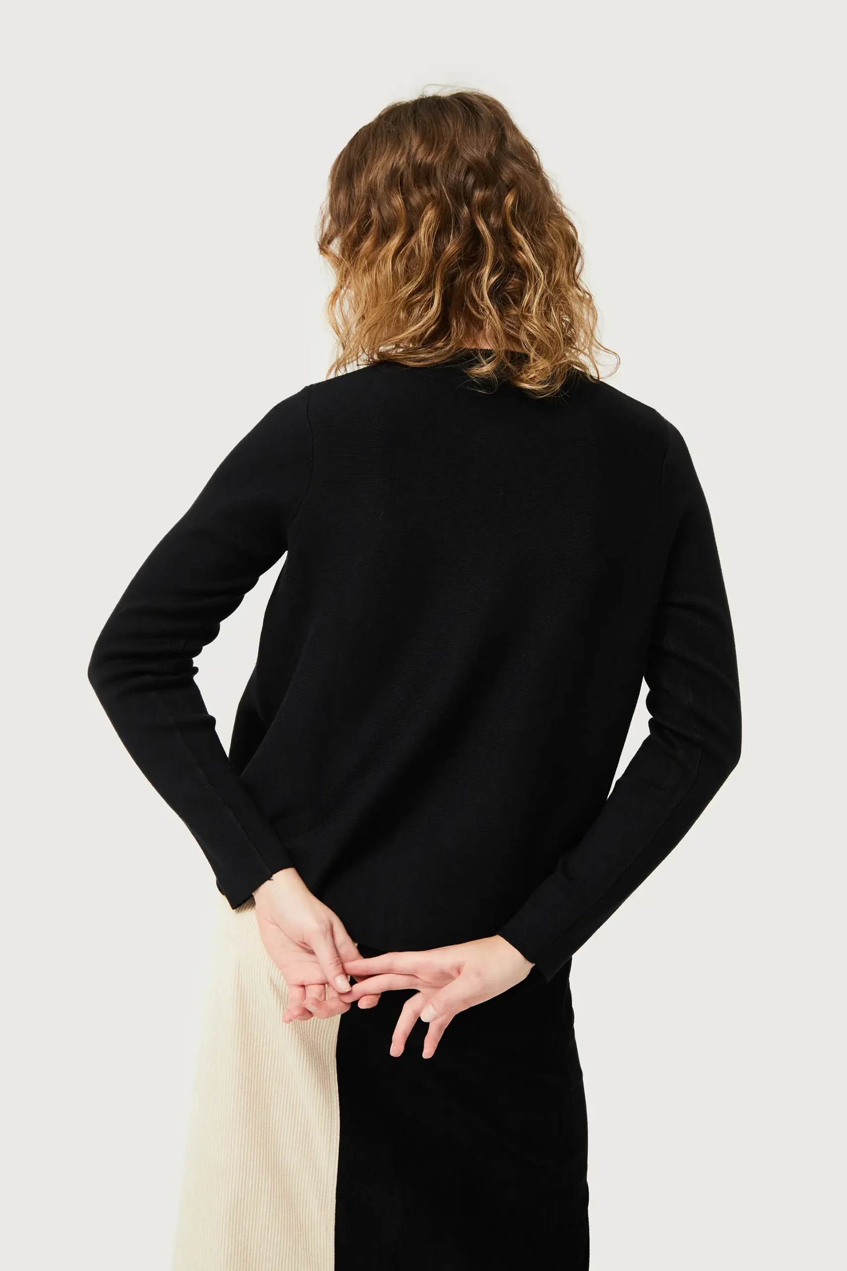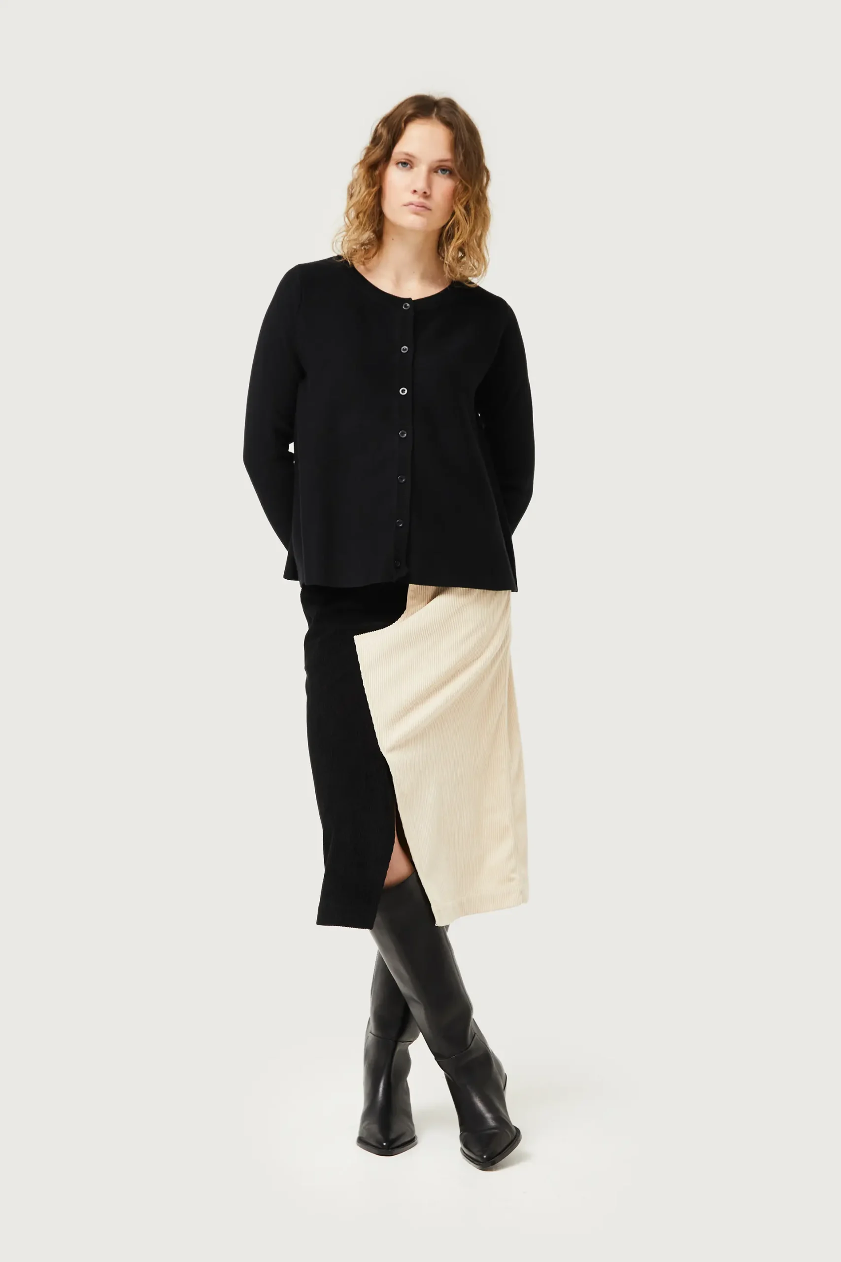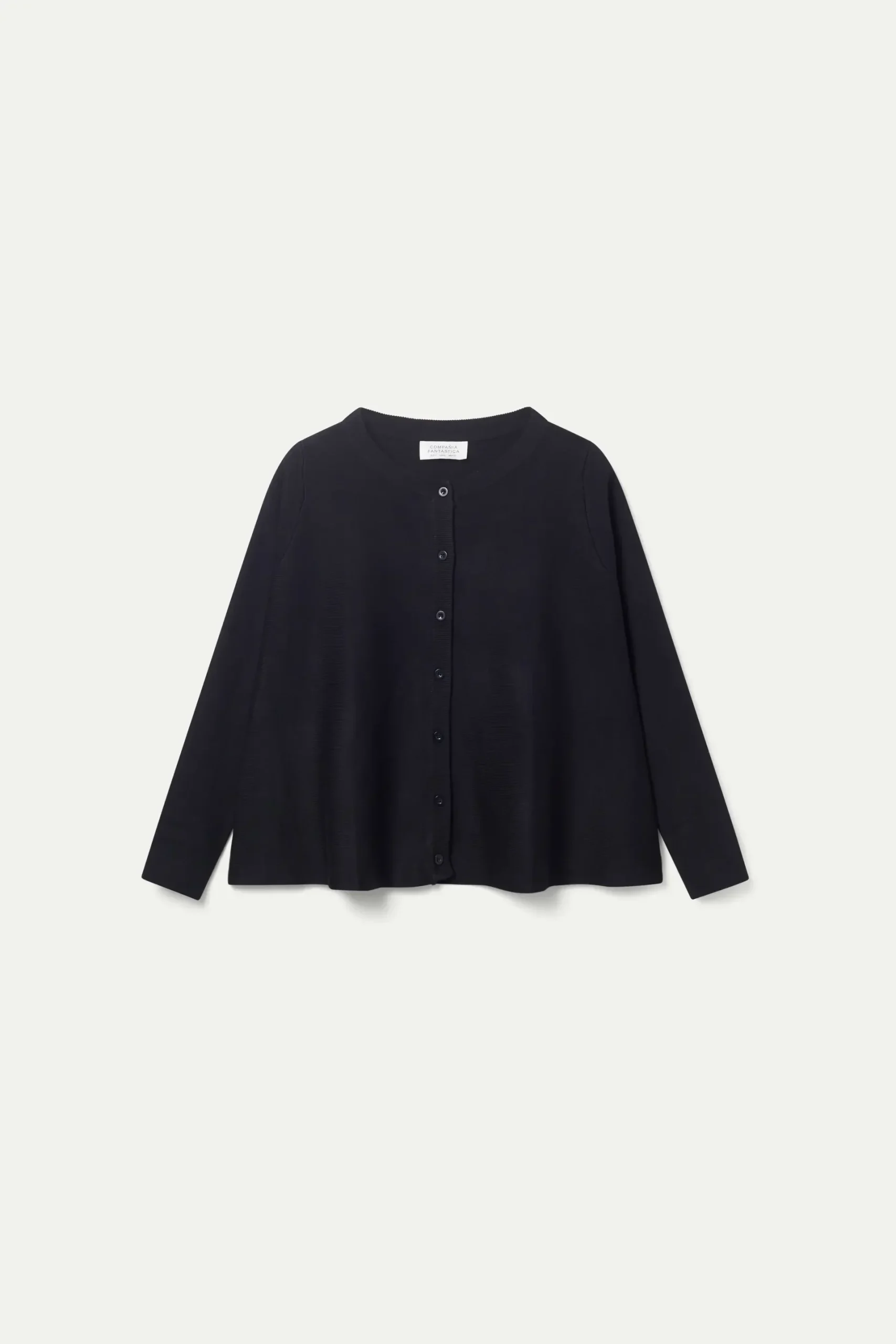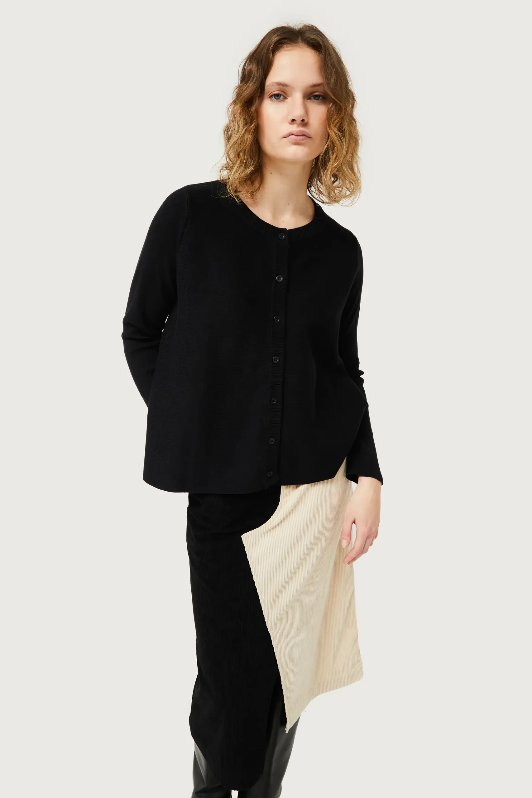 Cárdigan de punto con corte evasé de color negro. Con cuello redondo y manga larga. Cierre con botones frontales. La modelo mide 175 cm y lleva la talla S.
