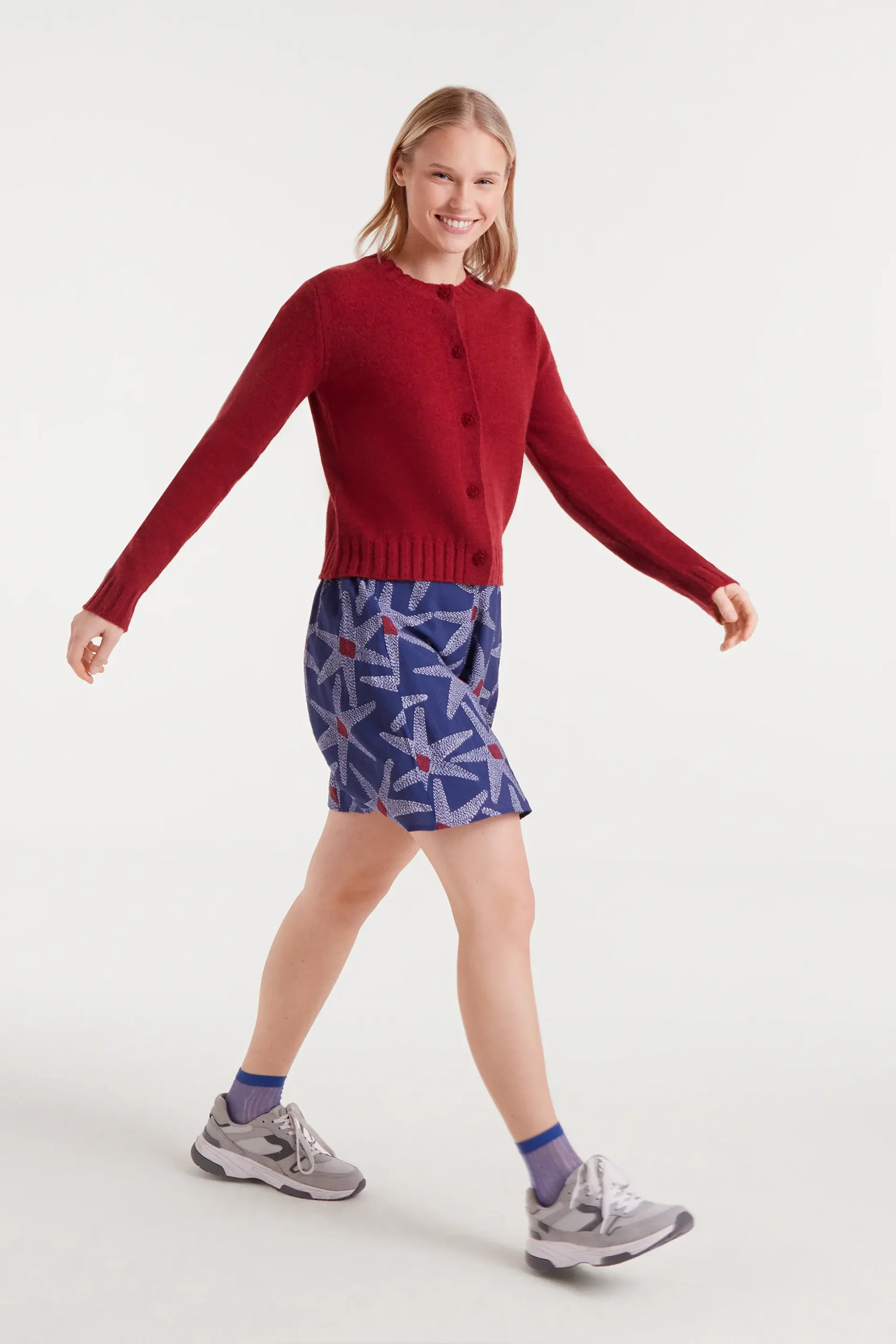 Cárdigan de punto color rojo. Con cuello redondo y manga larga. Hombro ligeramente caído. Cierre frontal con botones en forma de rosa. La modelo mide 174 cm y lleva la talla S.