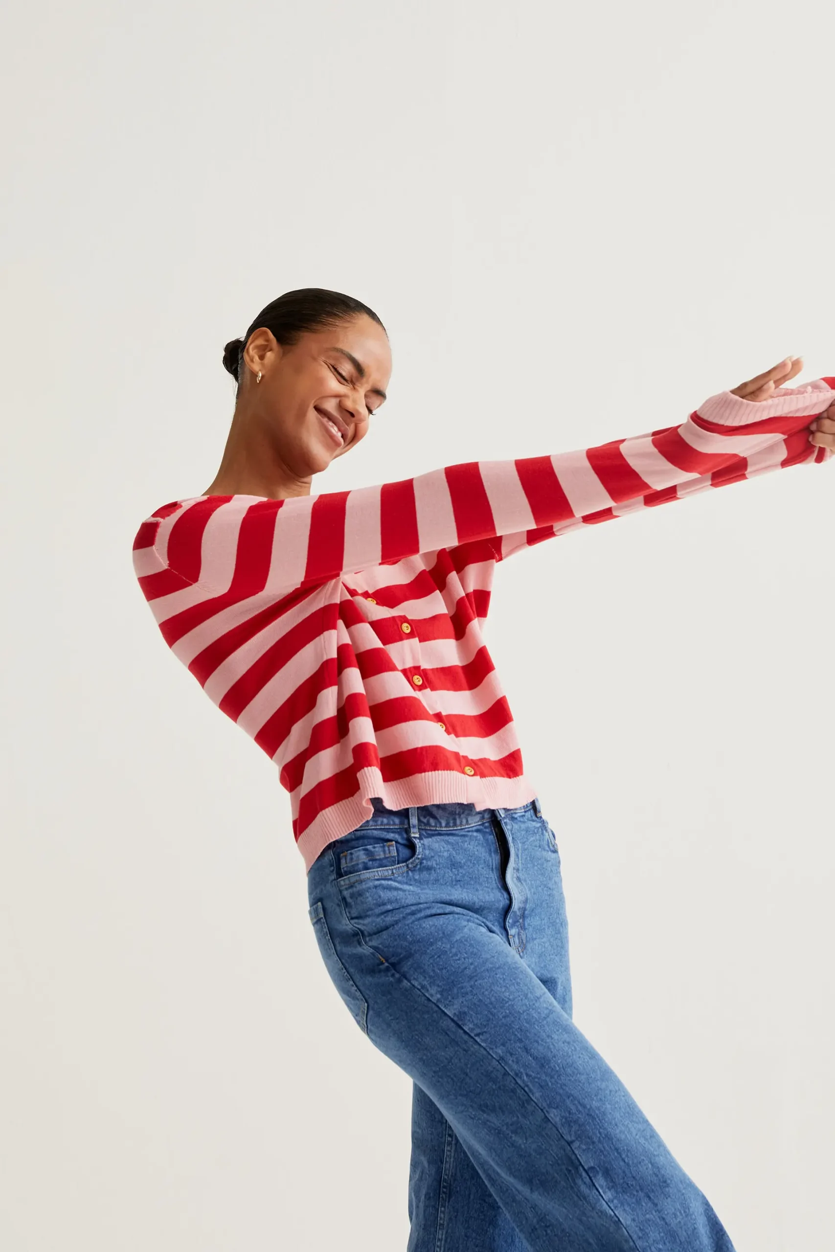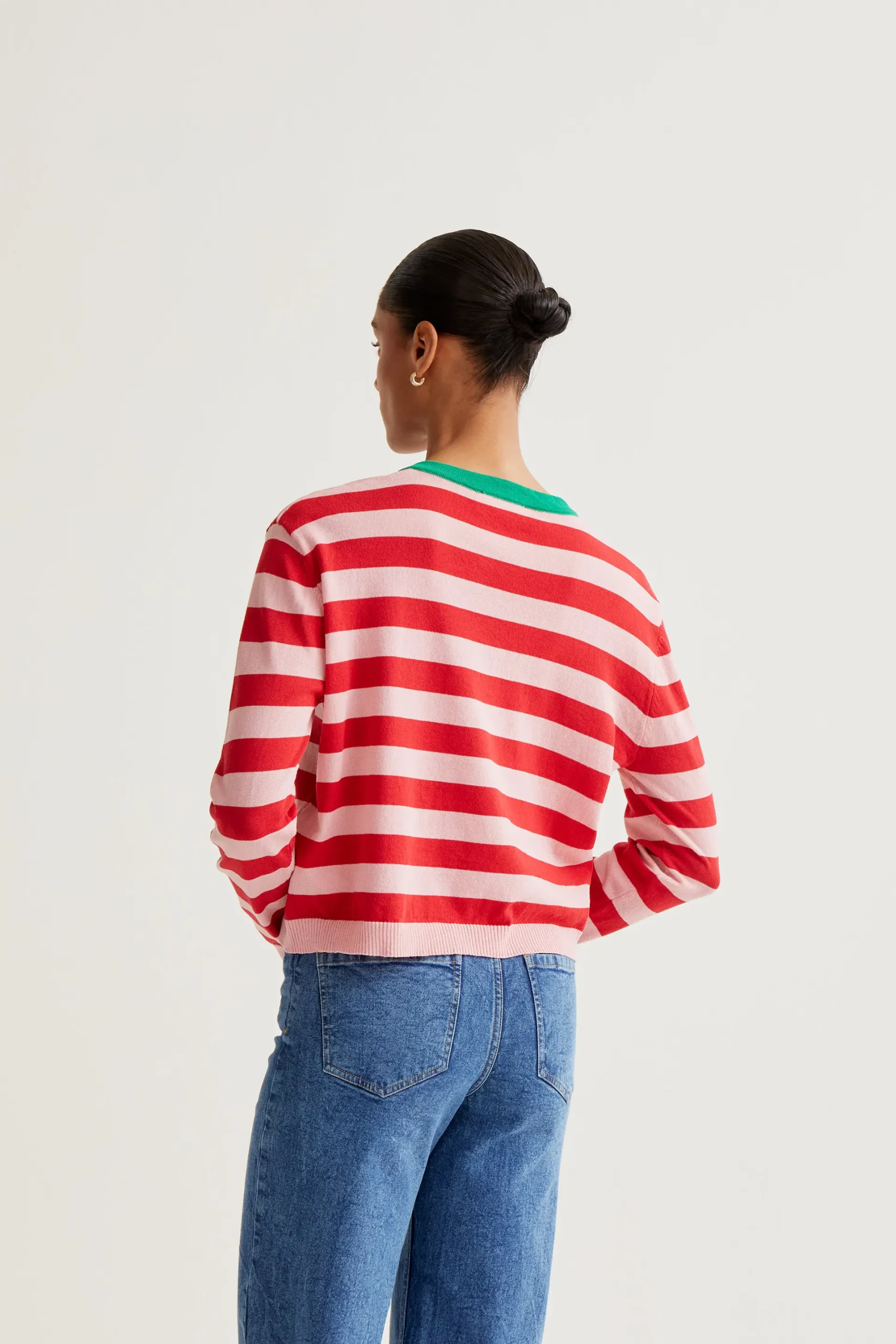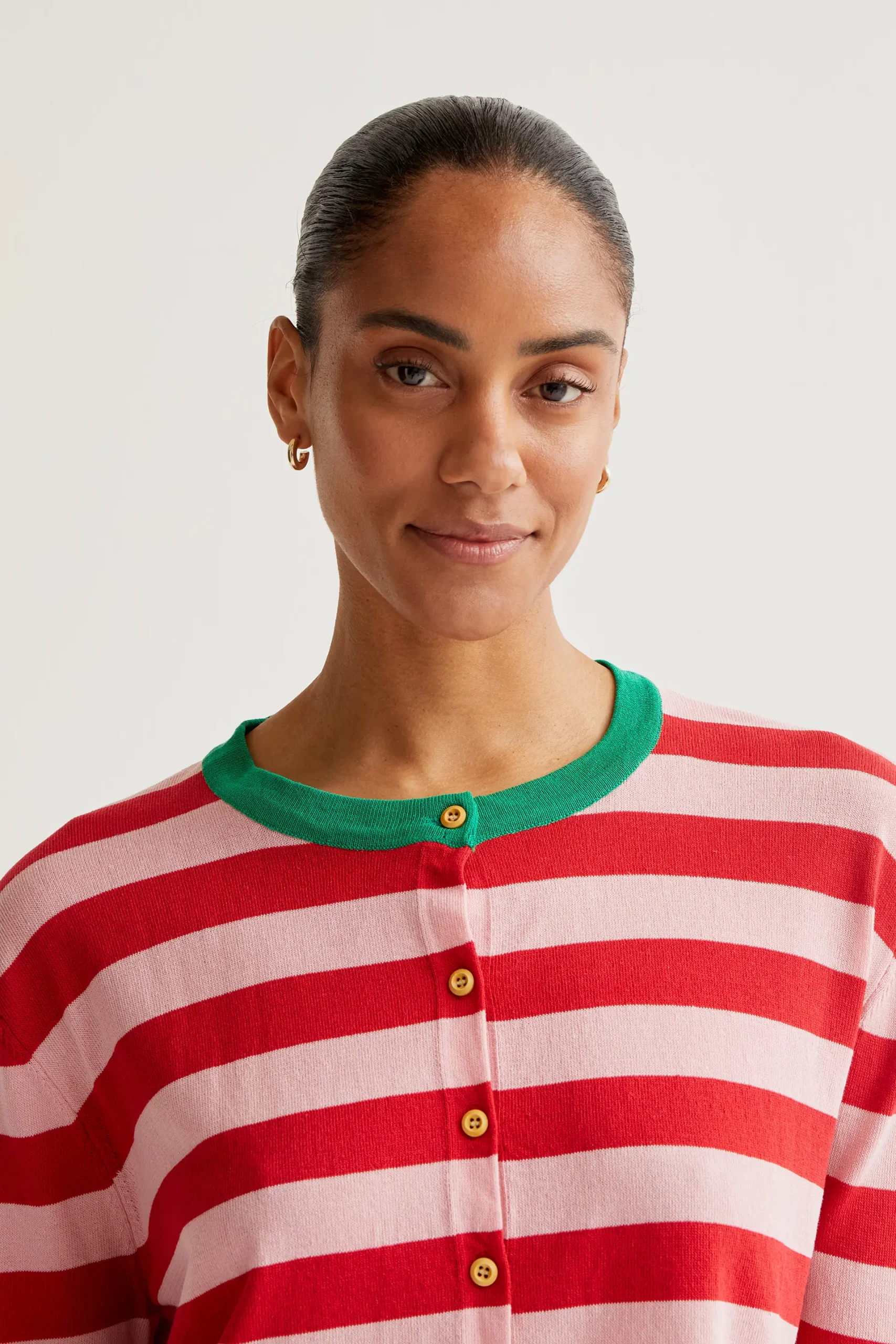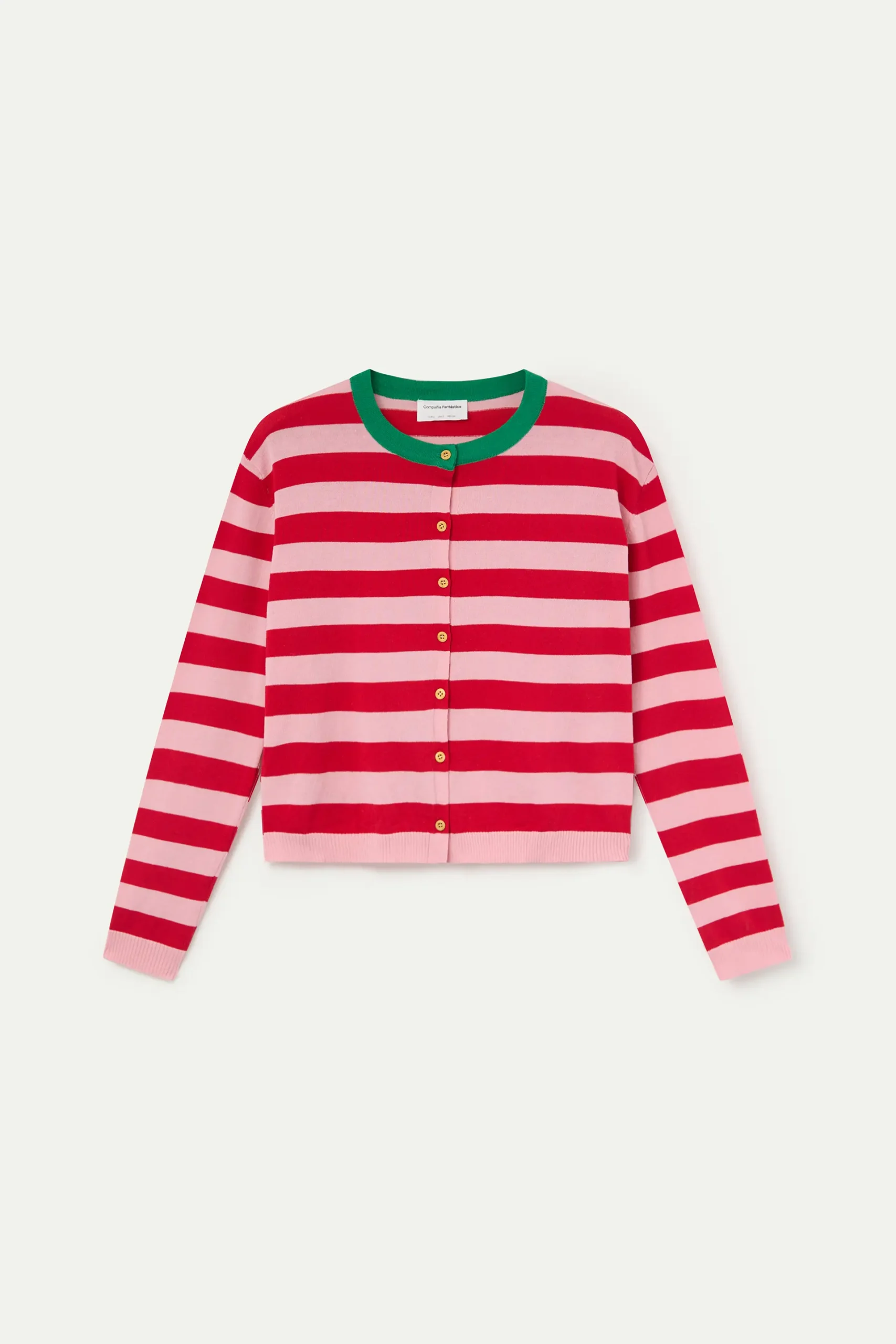 Cárdigan con tejido de punto estampado de rayas de color rosa y rojo. Cuello redondo en contraste de color verde. Cierre frontal con botones de color amarillo. Detalles acabados en rib. La modelo mide 173 cm y lleva la talla S.