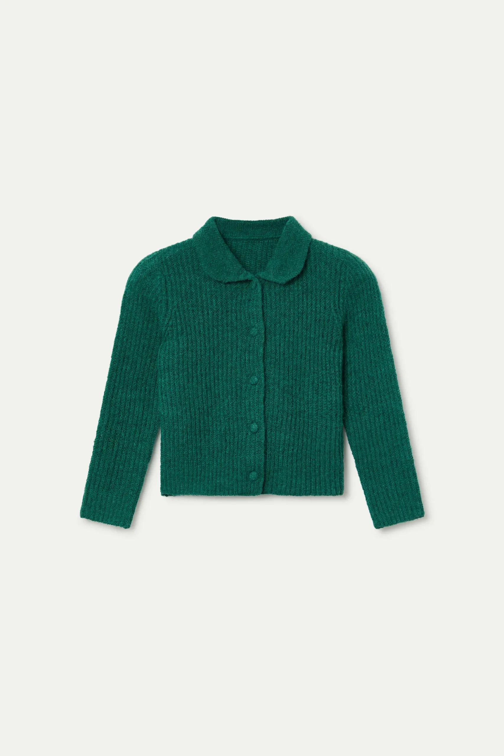 Cárdigan gris de niña de punto con cuello y botones al frente.