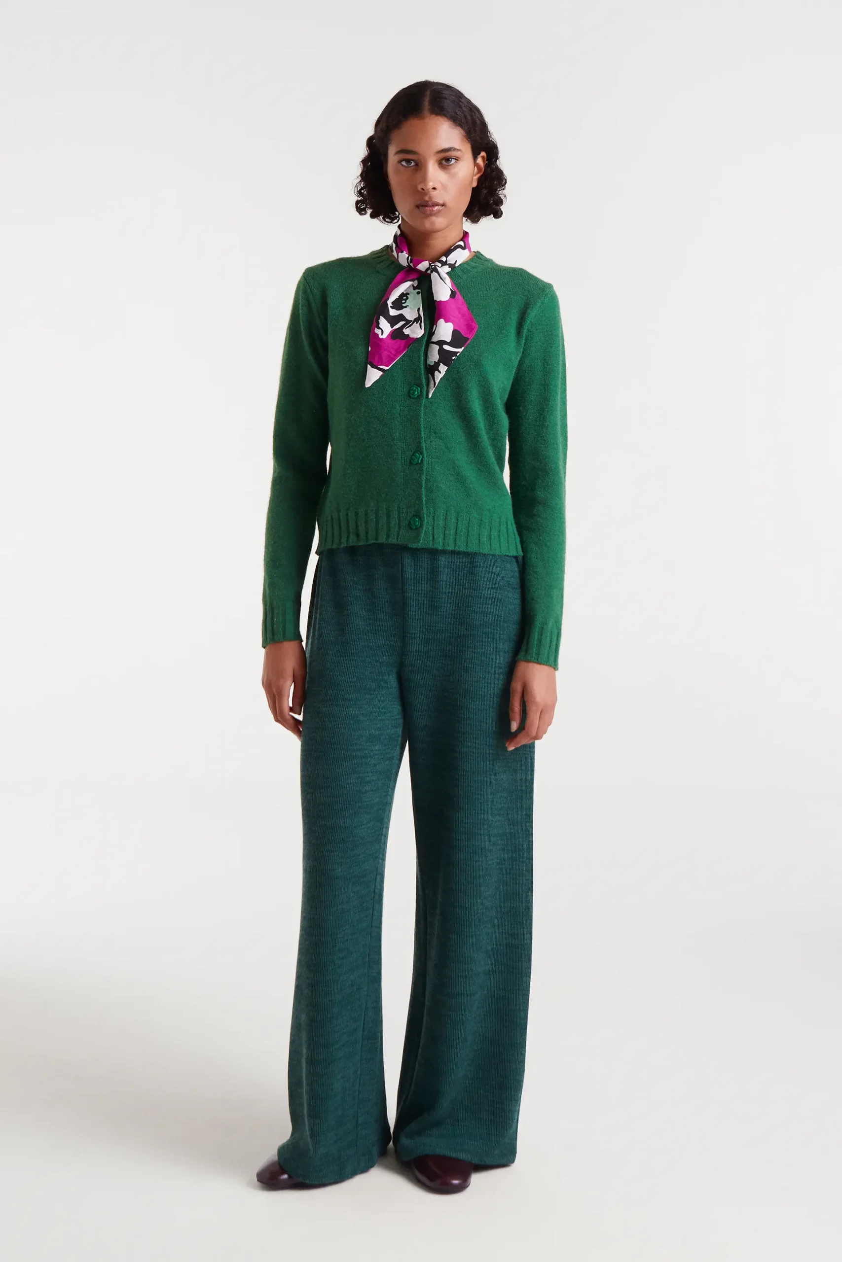 Cárdigan de punto color verde. Con cuello redondo y manga larga. Hombro ligeramente caído. Cierre frontal con botones en forma de rosa. La modelo mide 175 cm y lleva la talla S.