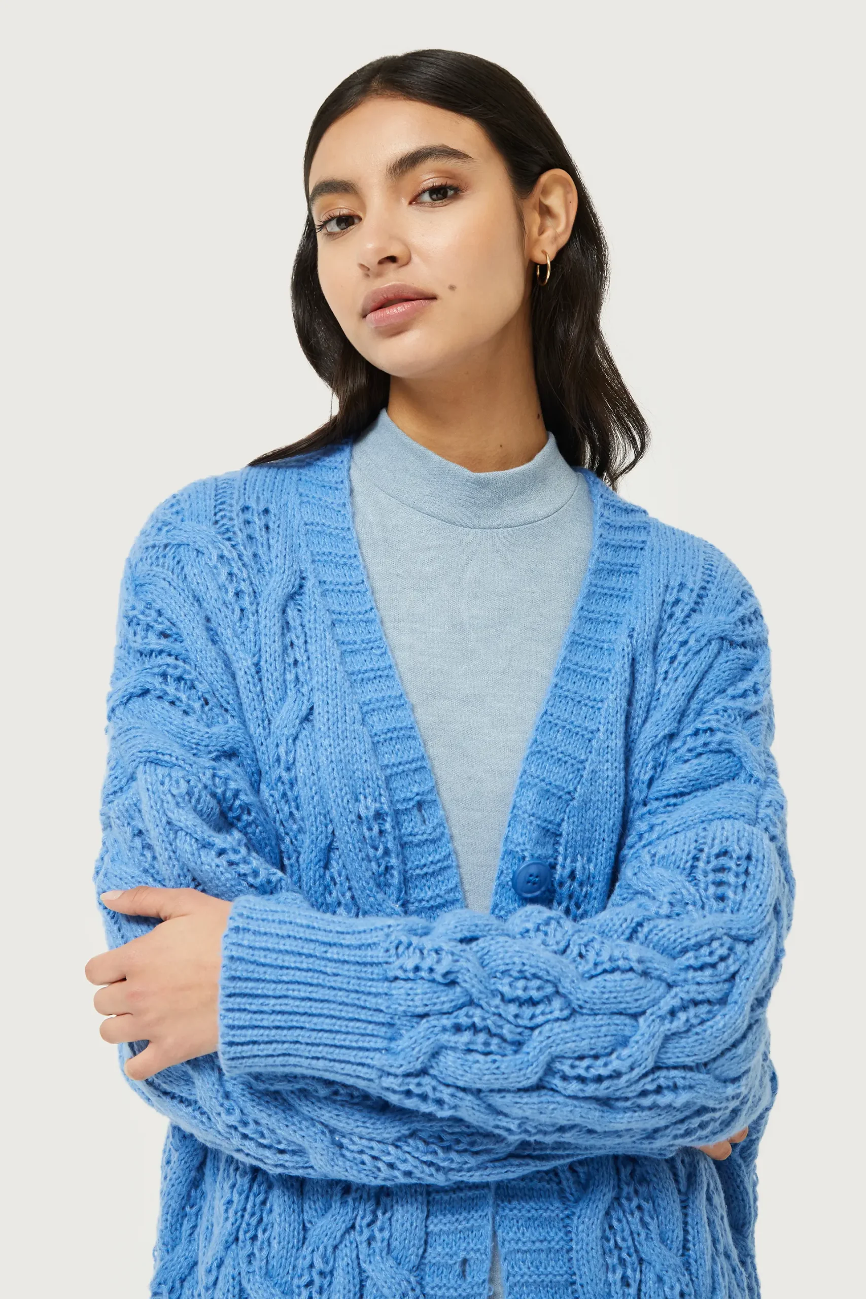 Cárdigan largo de punto trenzado de color azul. Con escote pico y manga larga. Cierre con botones frontales. La modelo mide 176 cm y lleva la talla S.