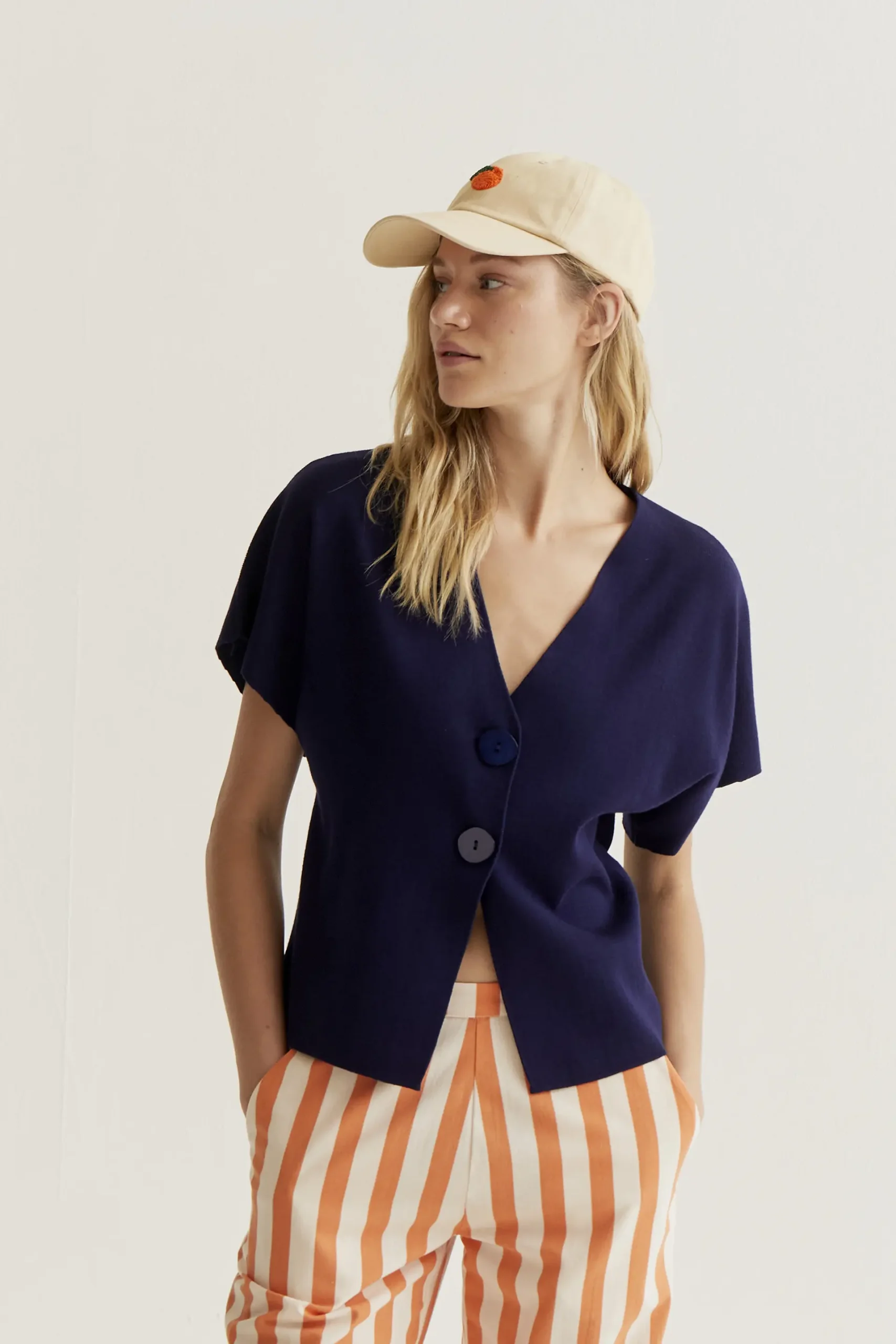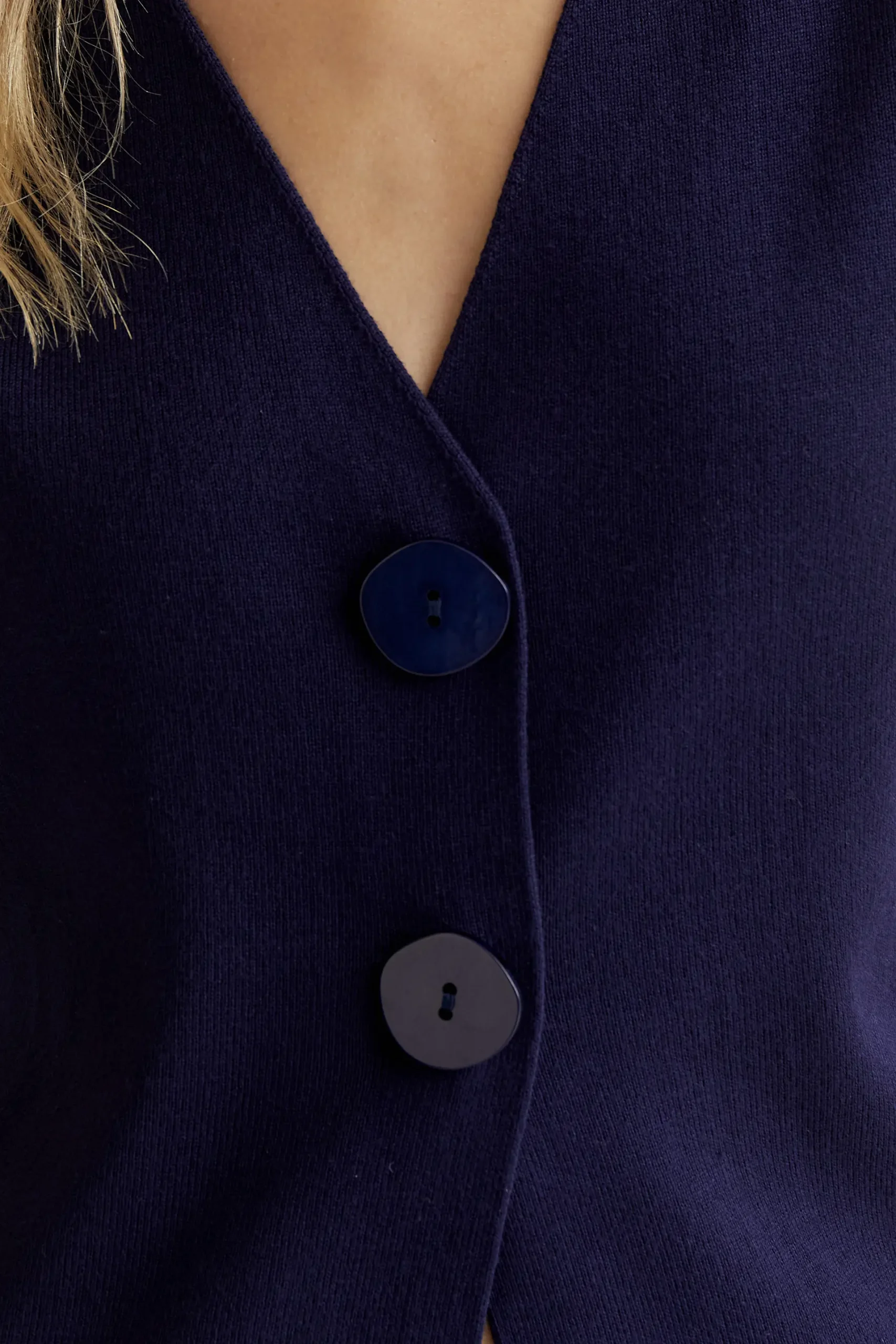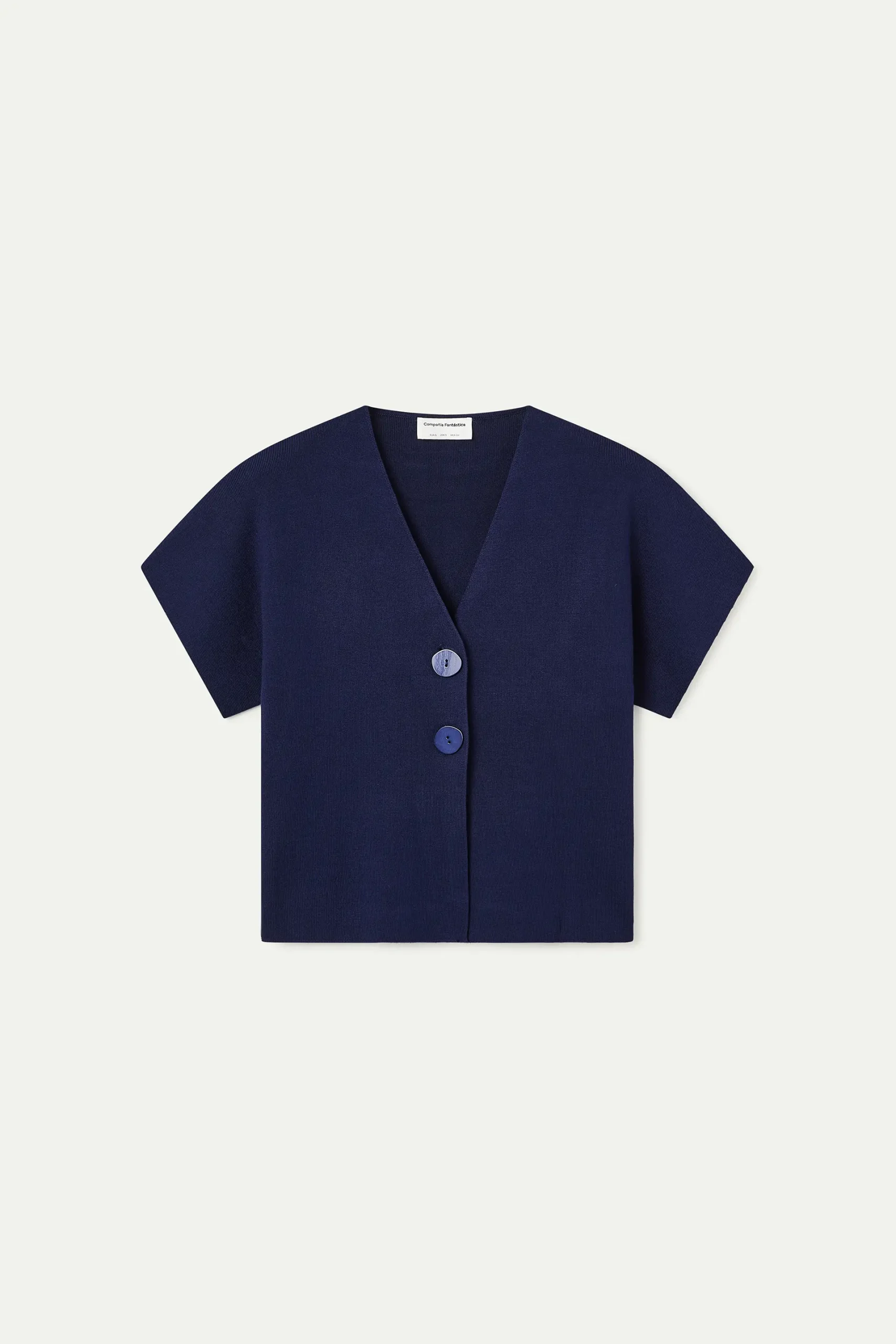 Cárdigan de tejido punto de color azul. Cuello pico con mangas corta. Cierre frontal con botones grandes de color azul marino. Hombro ligeramente caído. La modelo mide 177 cm y lleva la talla S.