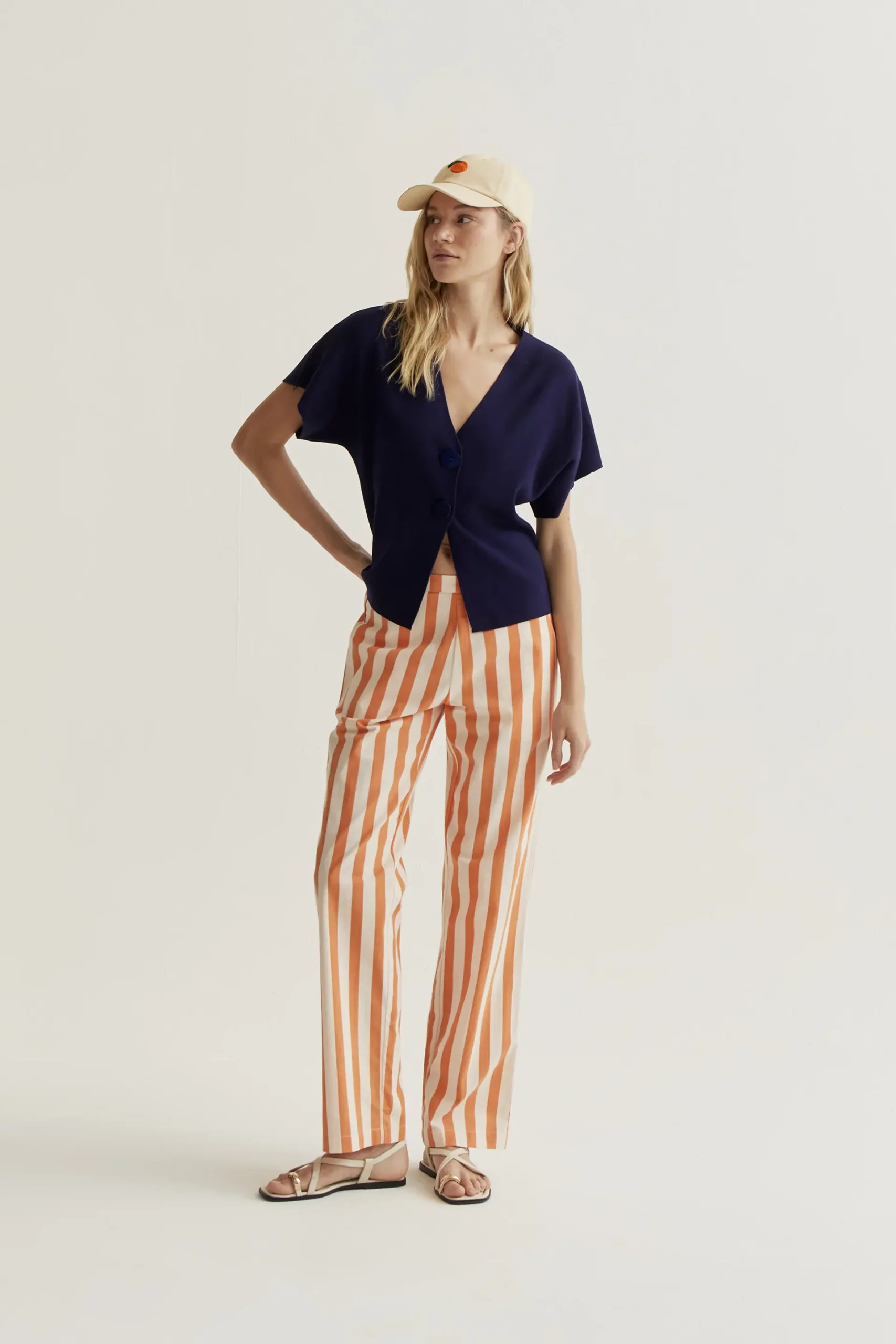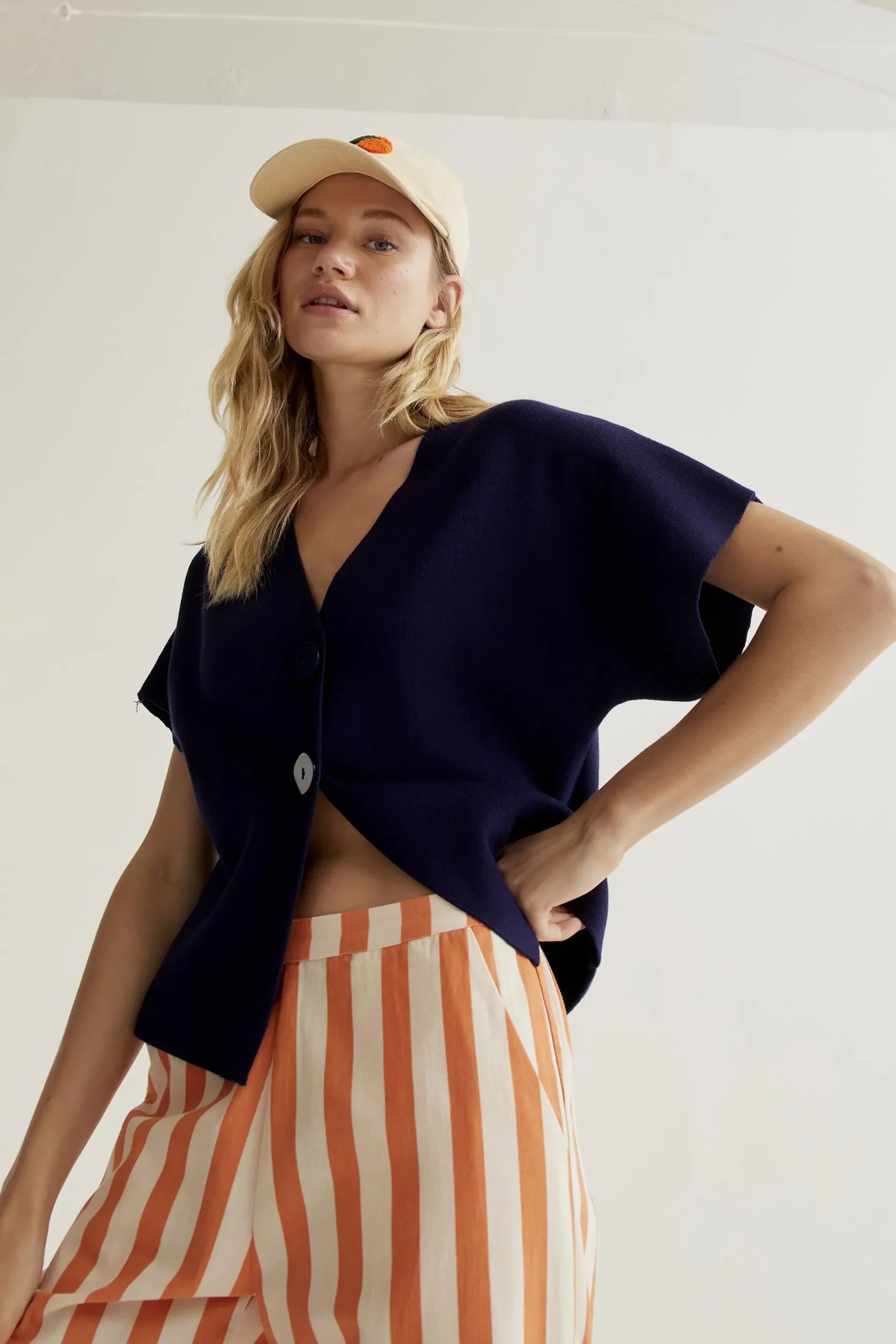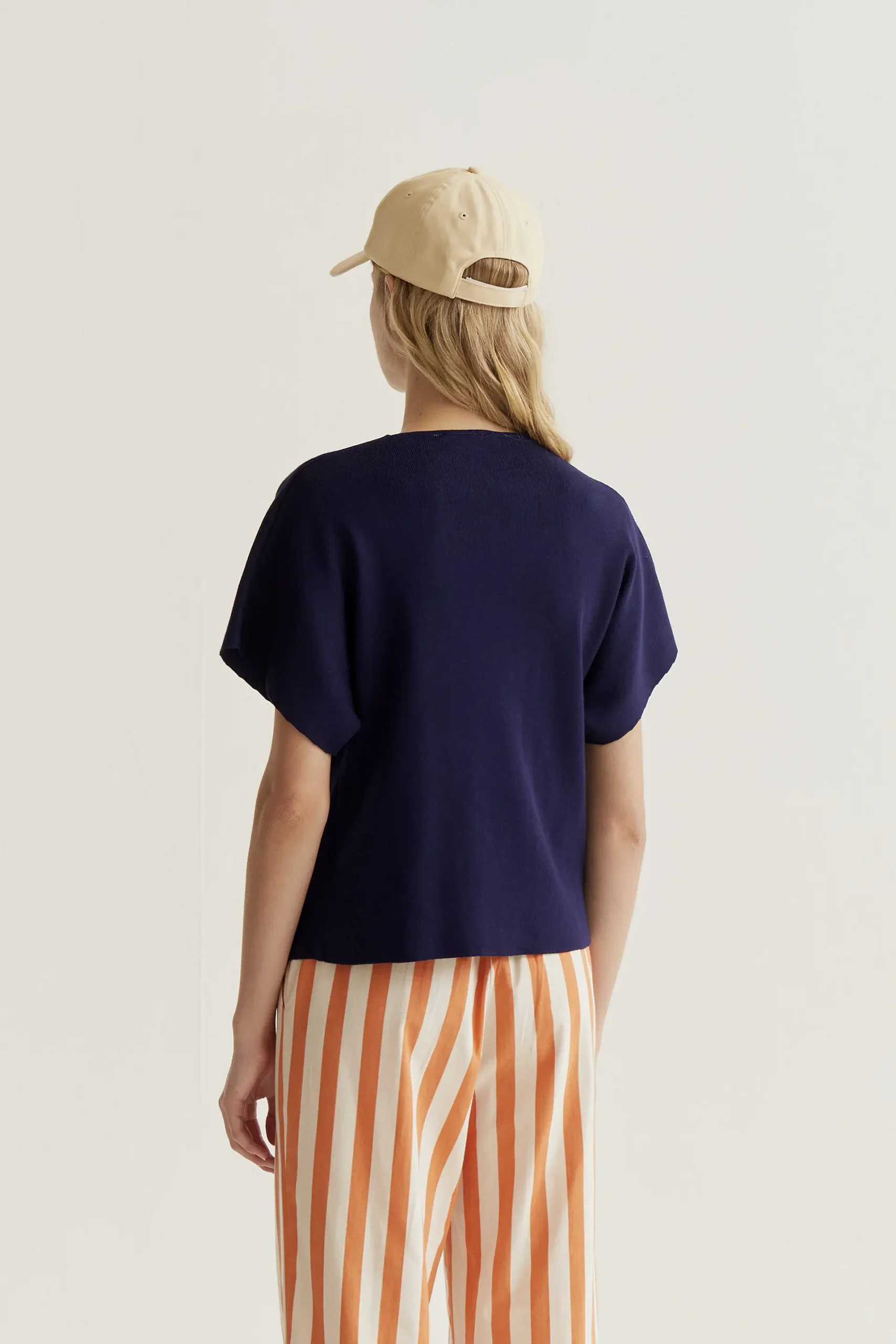 Cárdigan de tejido punto de color azul. Cuello pico con mangas corta. Cierre frontal con botones grandes de color azul marino. Hombro ligeramente caído. La modelo mide 177 cm y lleva la talla S.