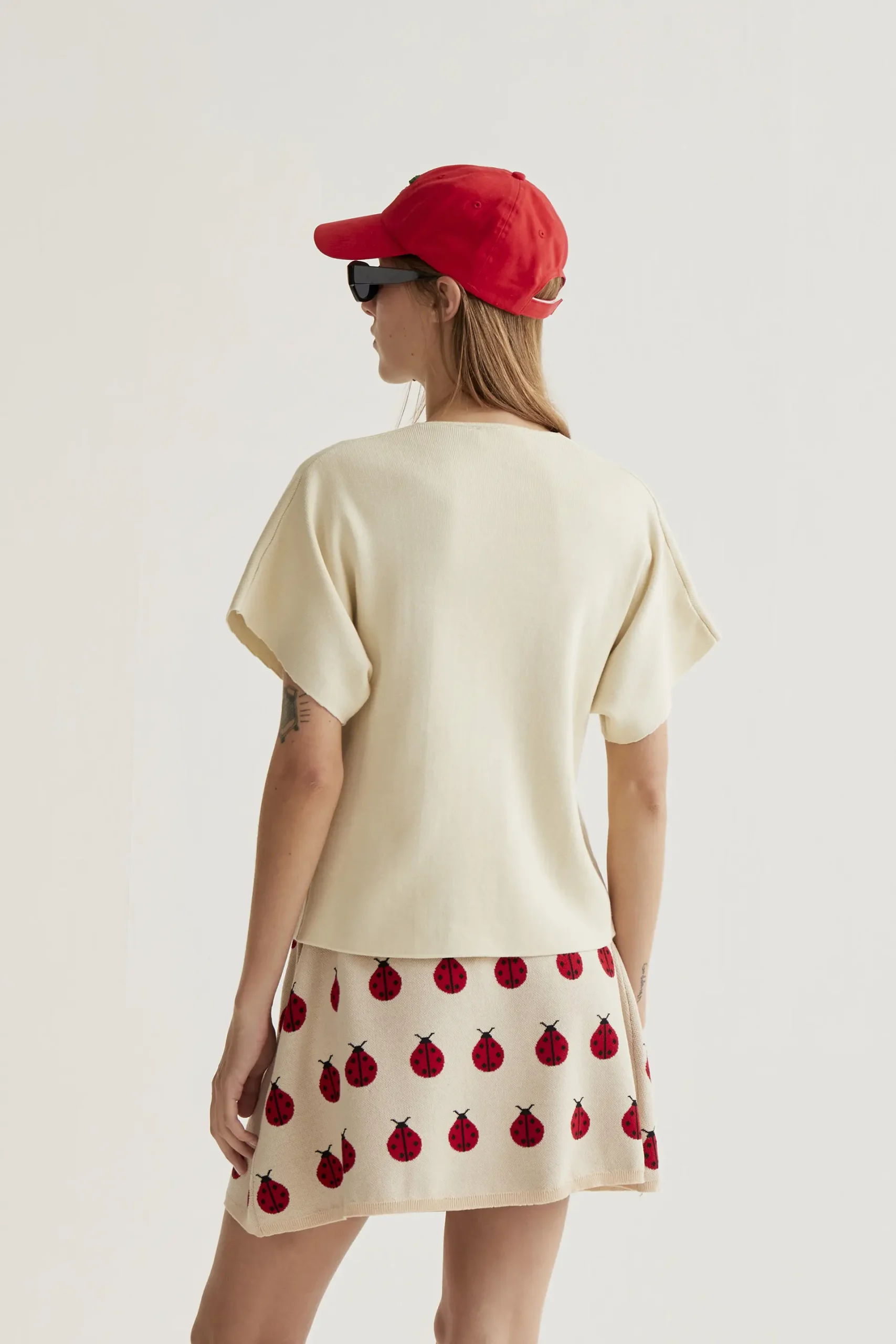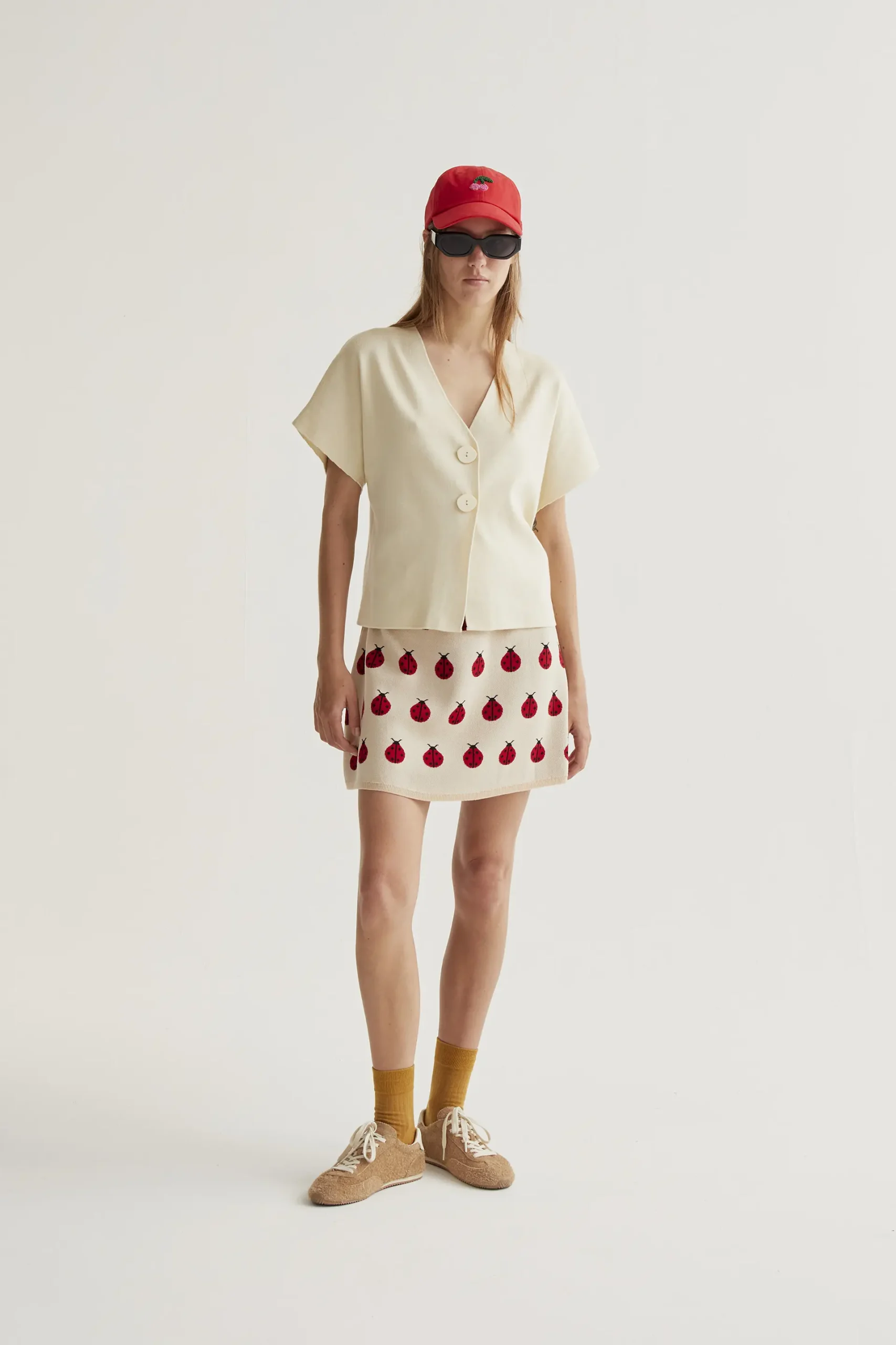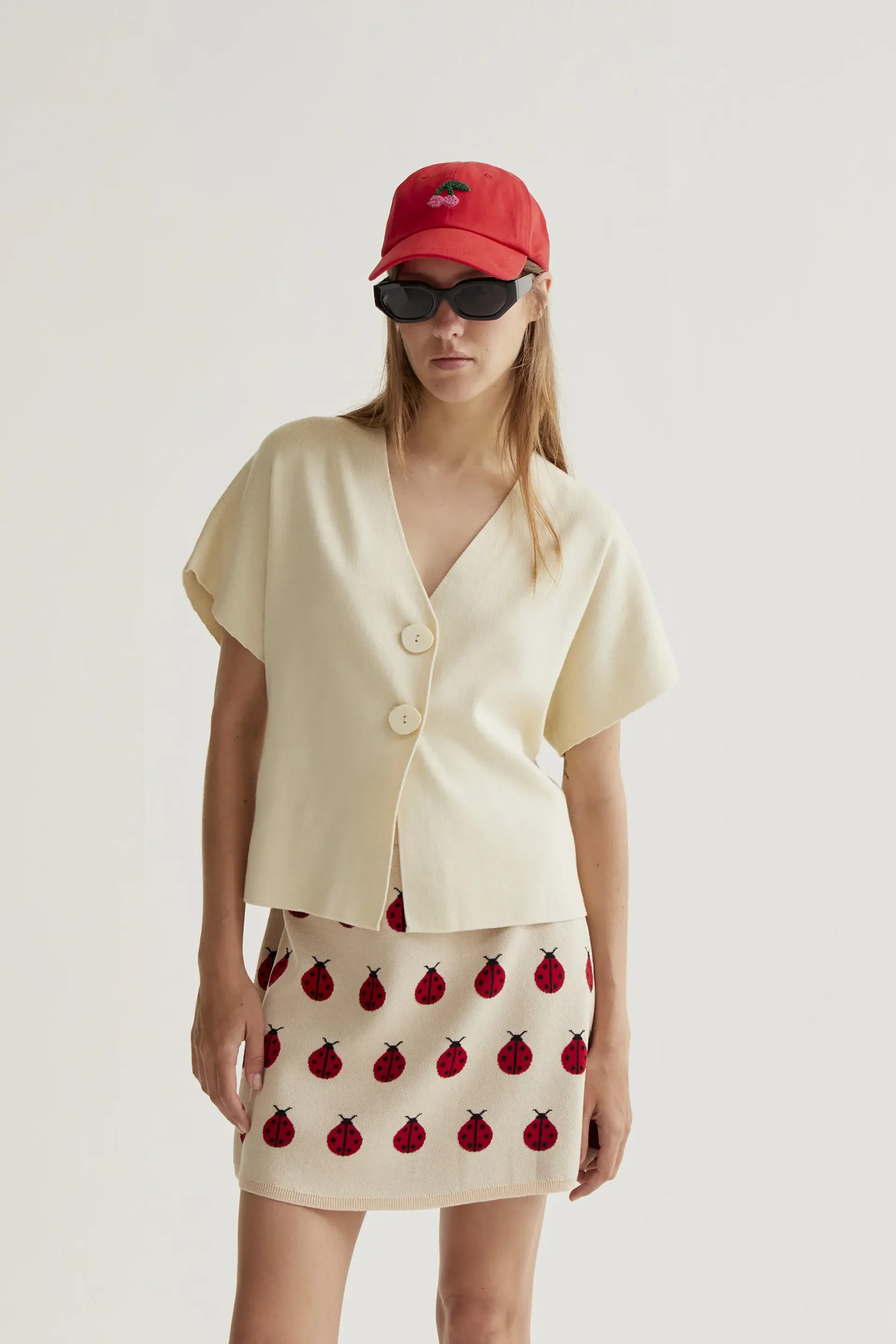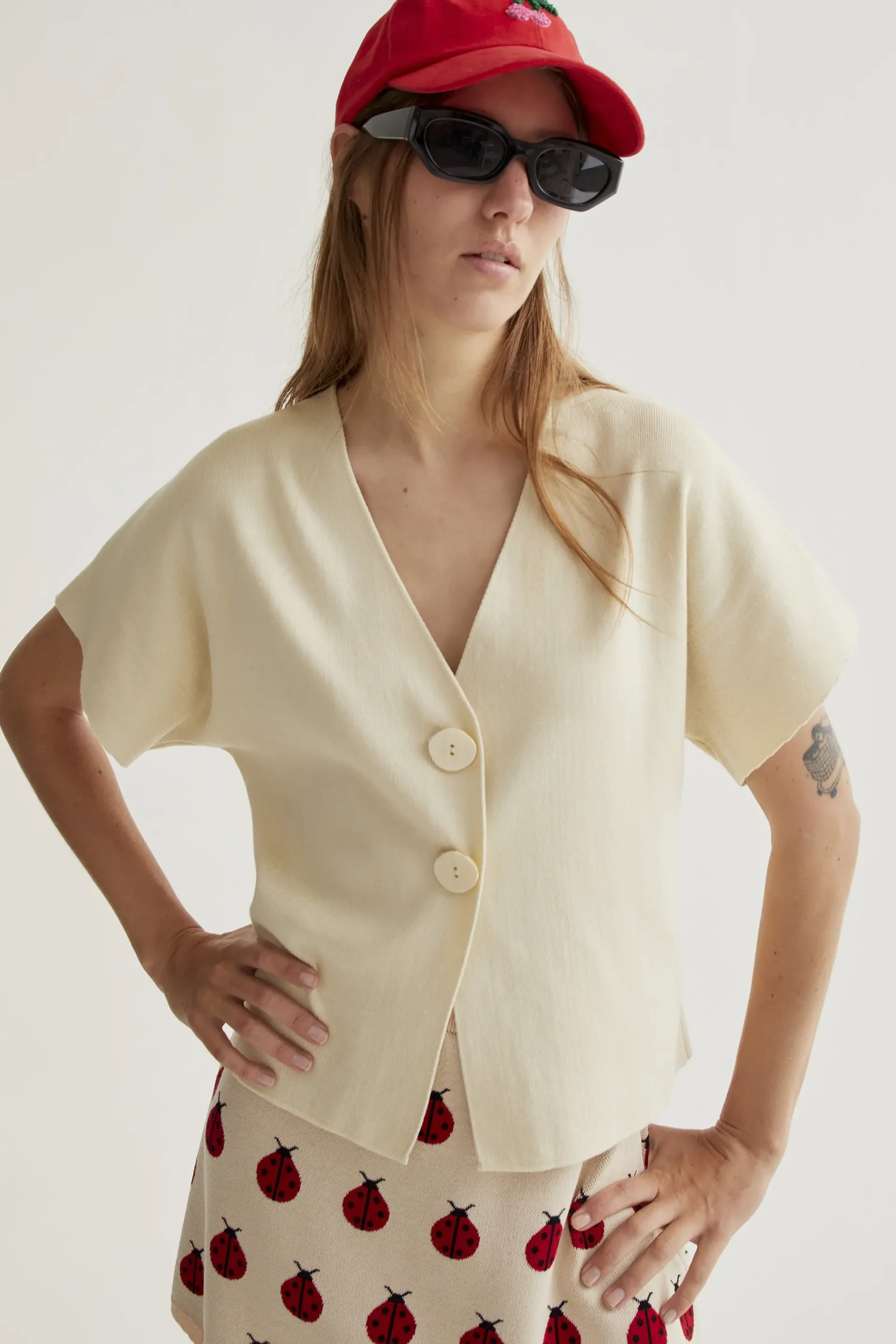 Cárdigan de tejido punto de color beige. Cuello pico con mangas corta. Cierre frontal con botones grandes de color beige. Hombro ligeramente caído. La modelo mide 177 cm y lleva la talla S.