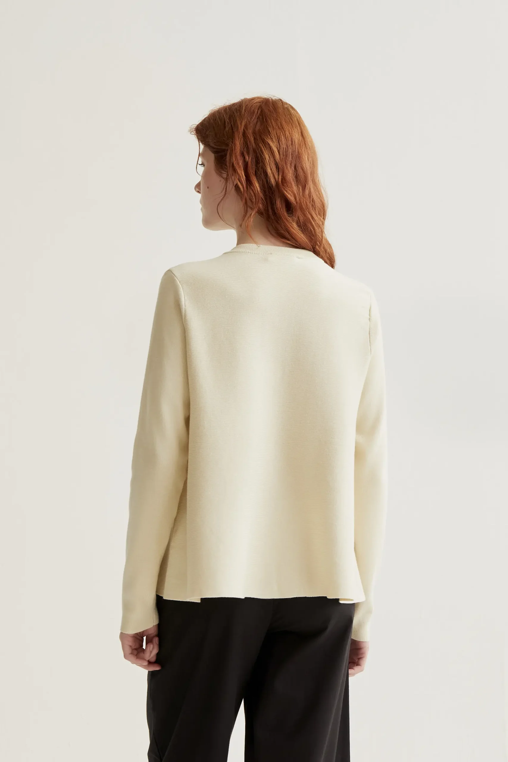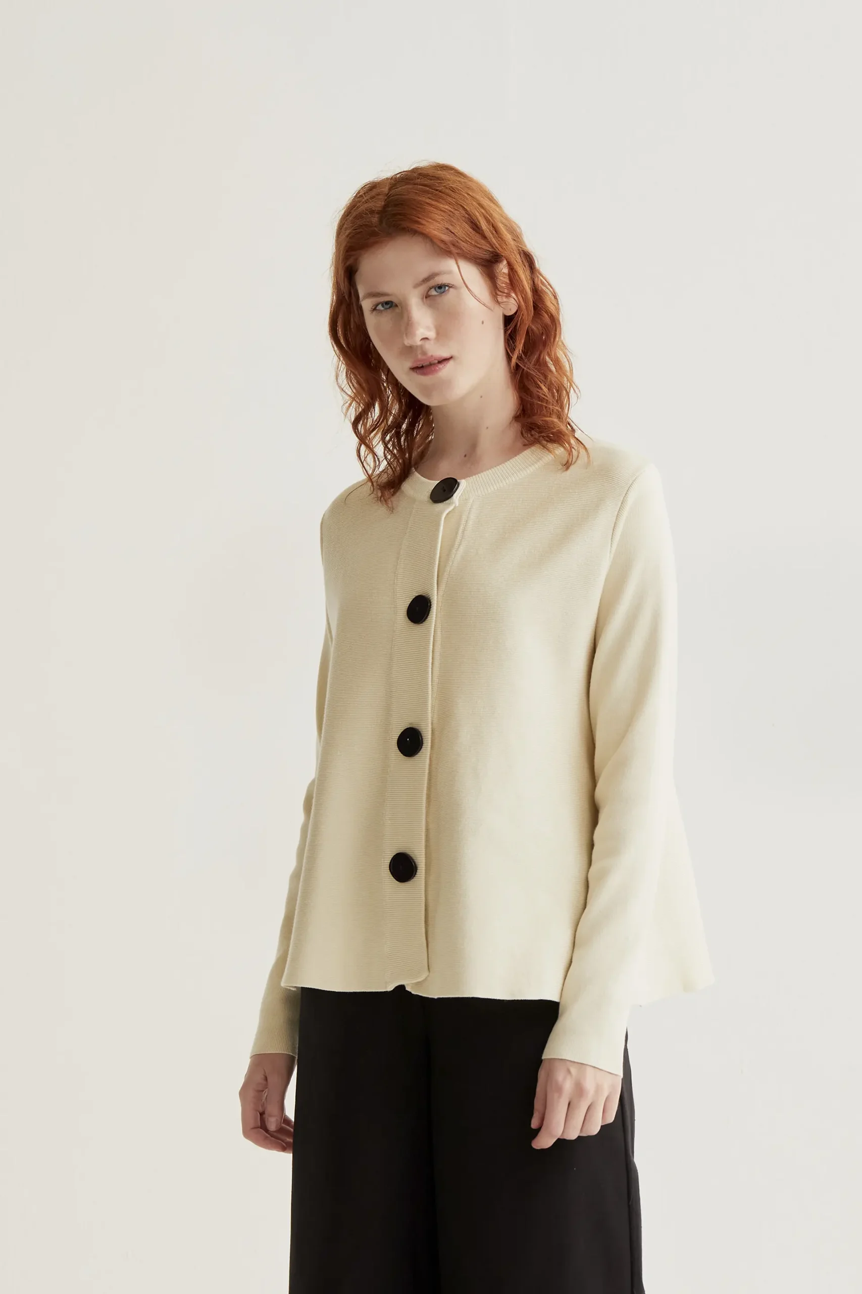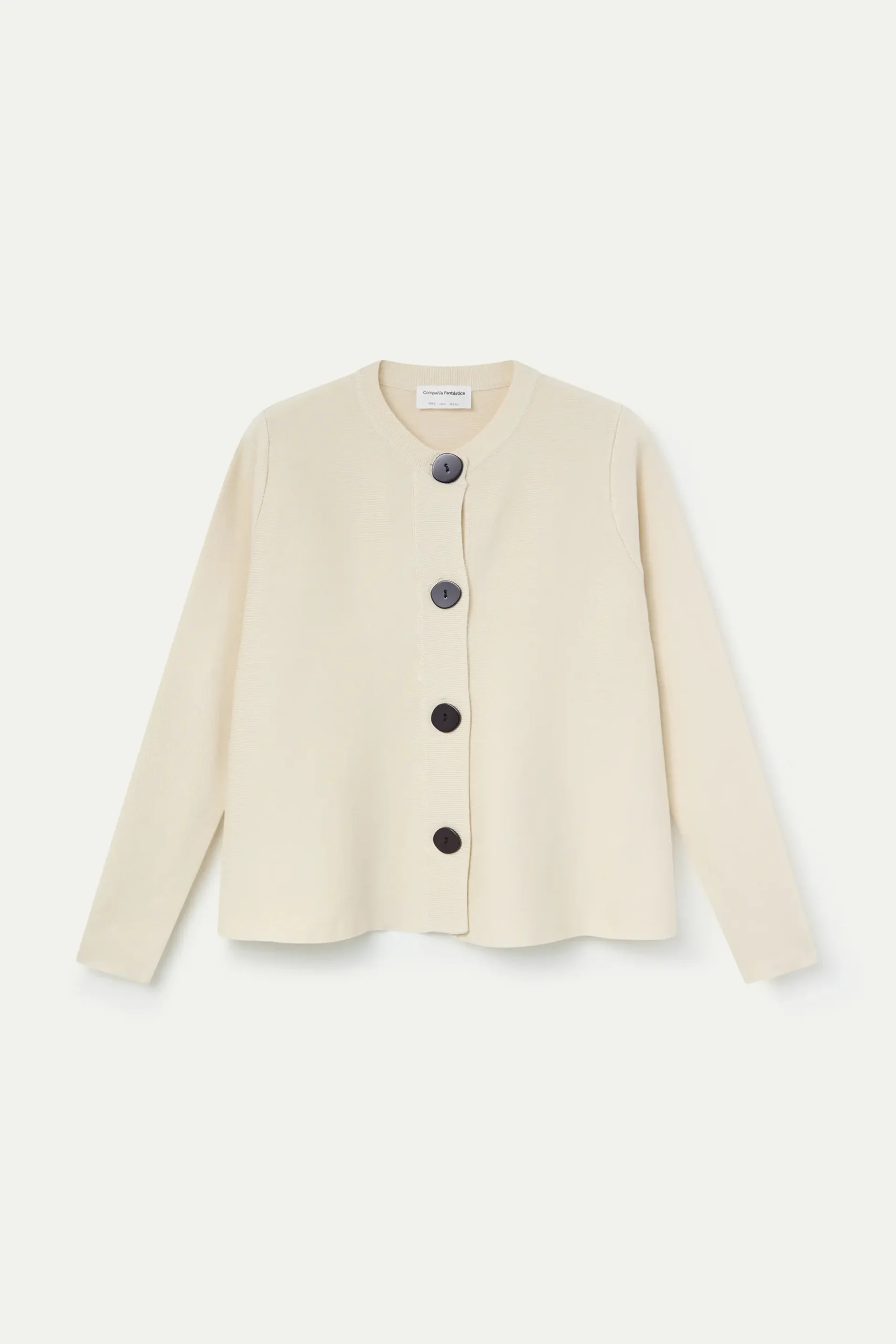 Cárdigan de tejido punto de color beige. Cuello redondo y manga larga. Cierre frontal con botones de color negro.Detalles acabados en rib. La modelo mide 175 cm y lleva la talla S.