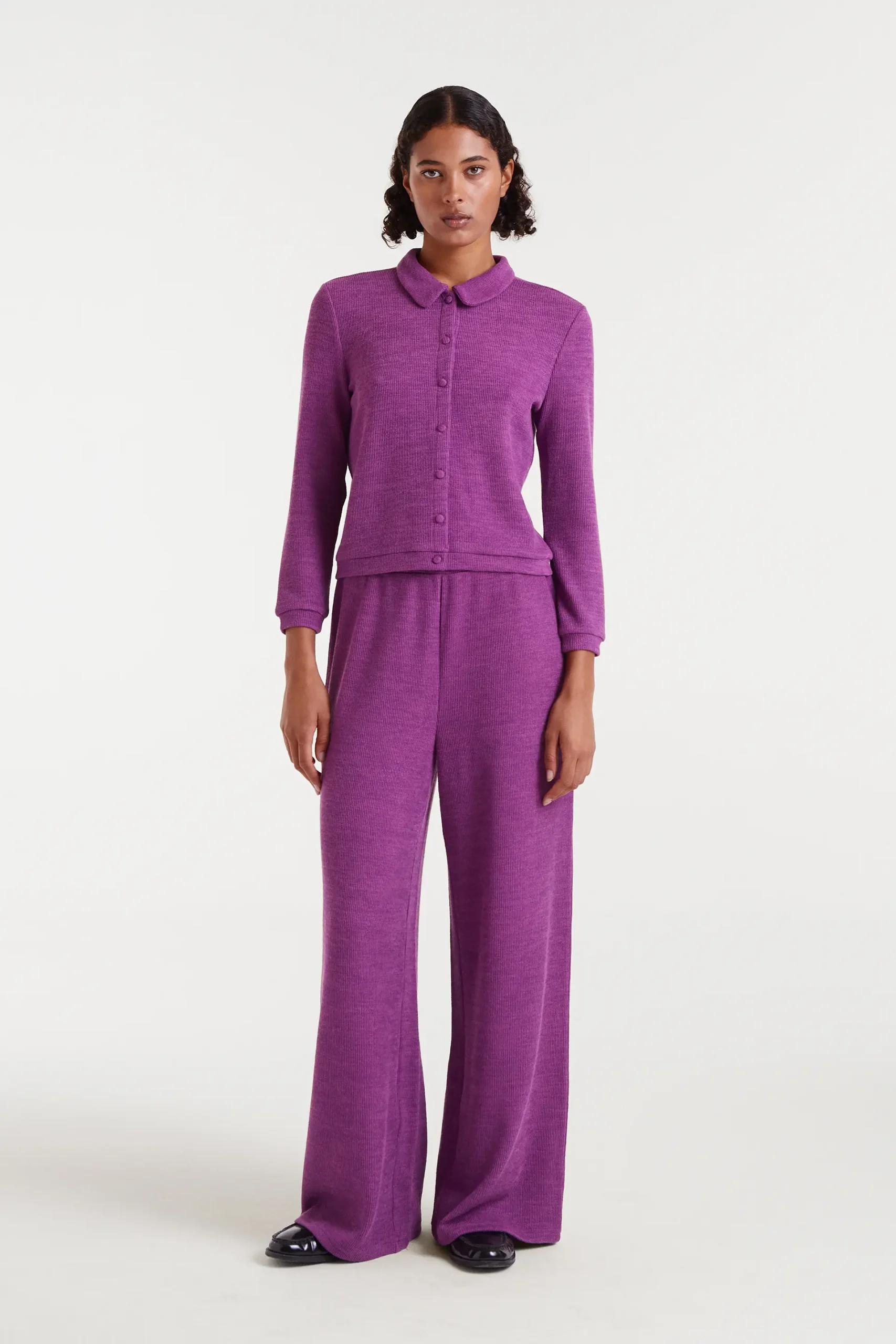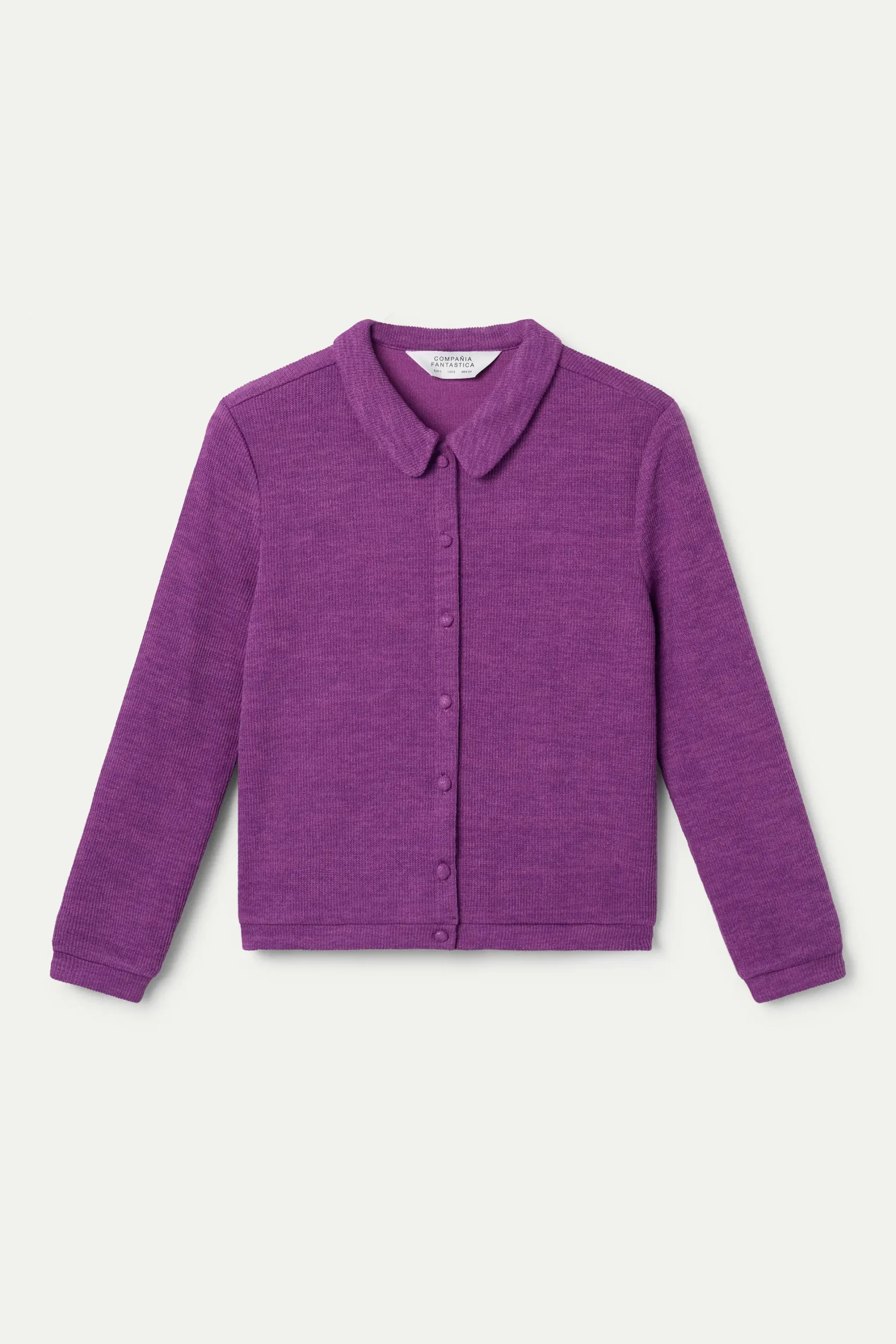 Cárdigan con tejido punto canalé de color magenta.Cuello solapa y manga larga. Cierre frontal con botones. La modelo mide 175 cm y lleva la talla S.