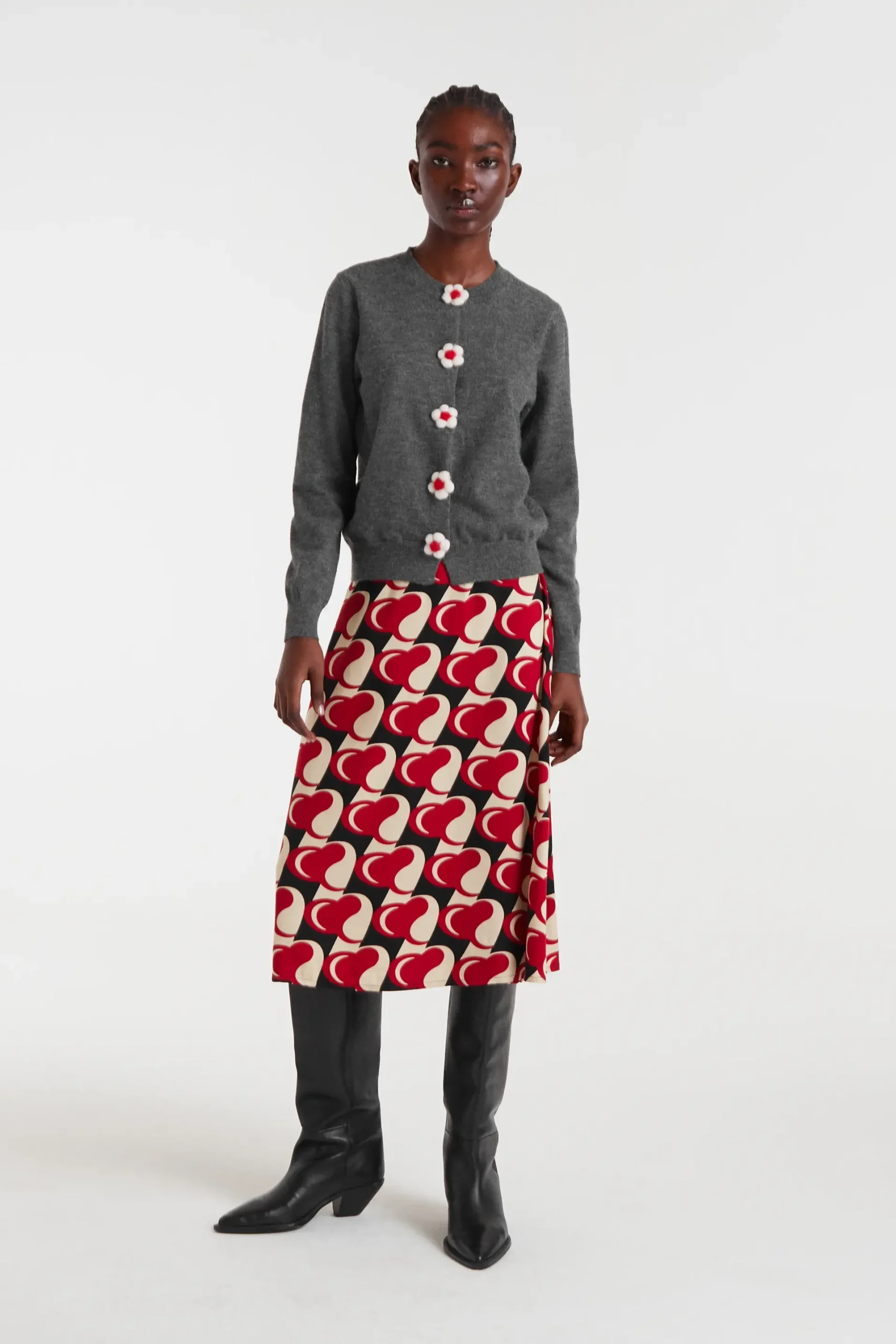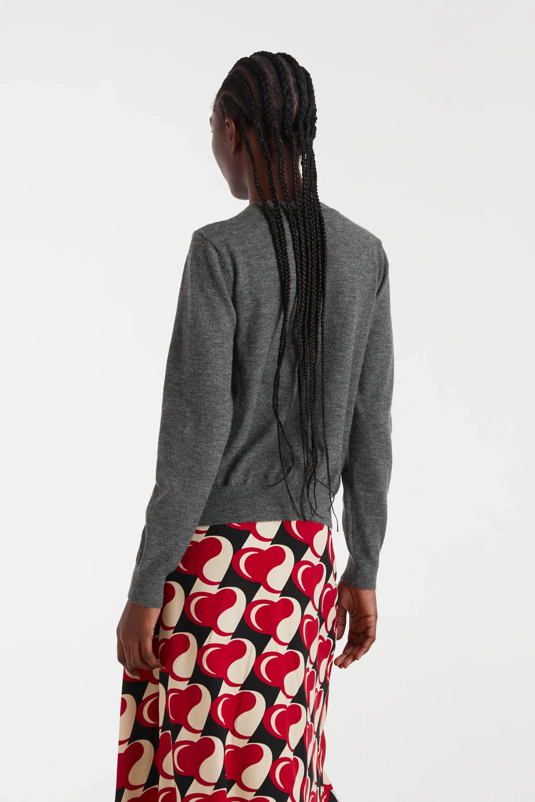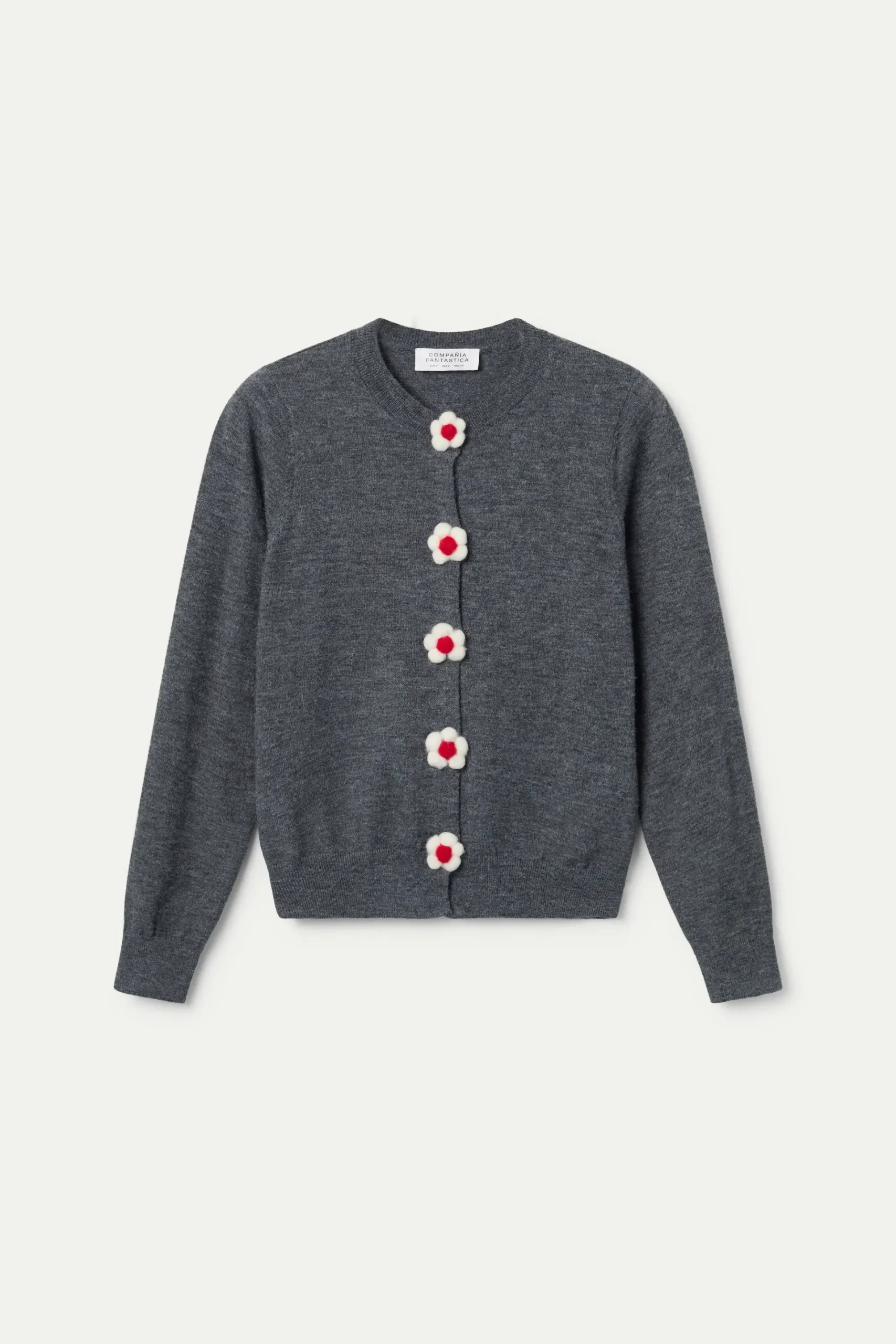 Cárdigan con tejido punto fino de color gris. Cuello redondo y manga larga. Cierre frontal con botones ocultos y aplicación en forma de flor. Detalles acabados en rib. La modelo mide 178 cm y lleva la talla S.