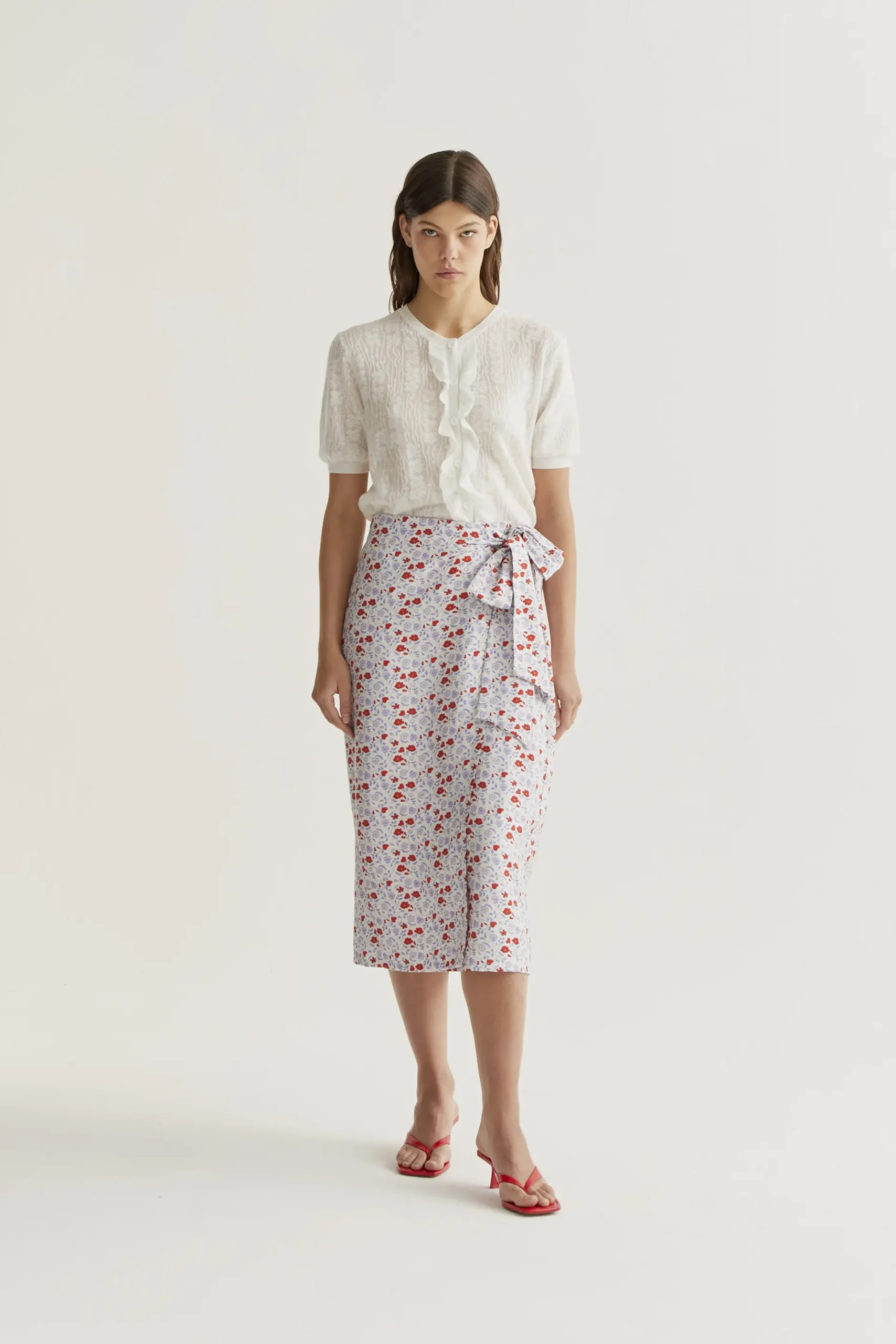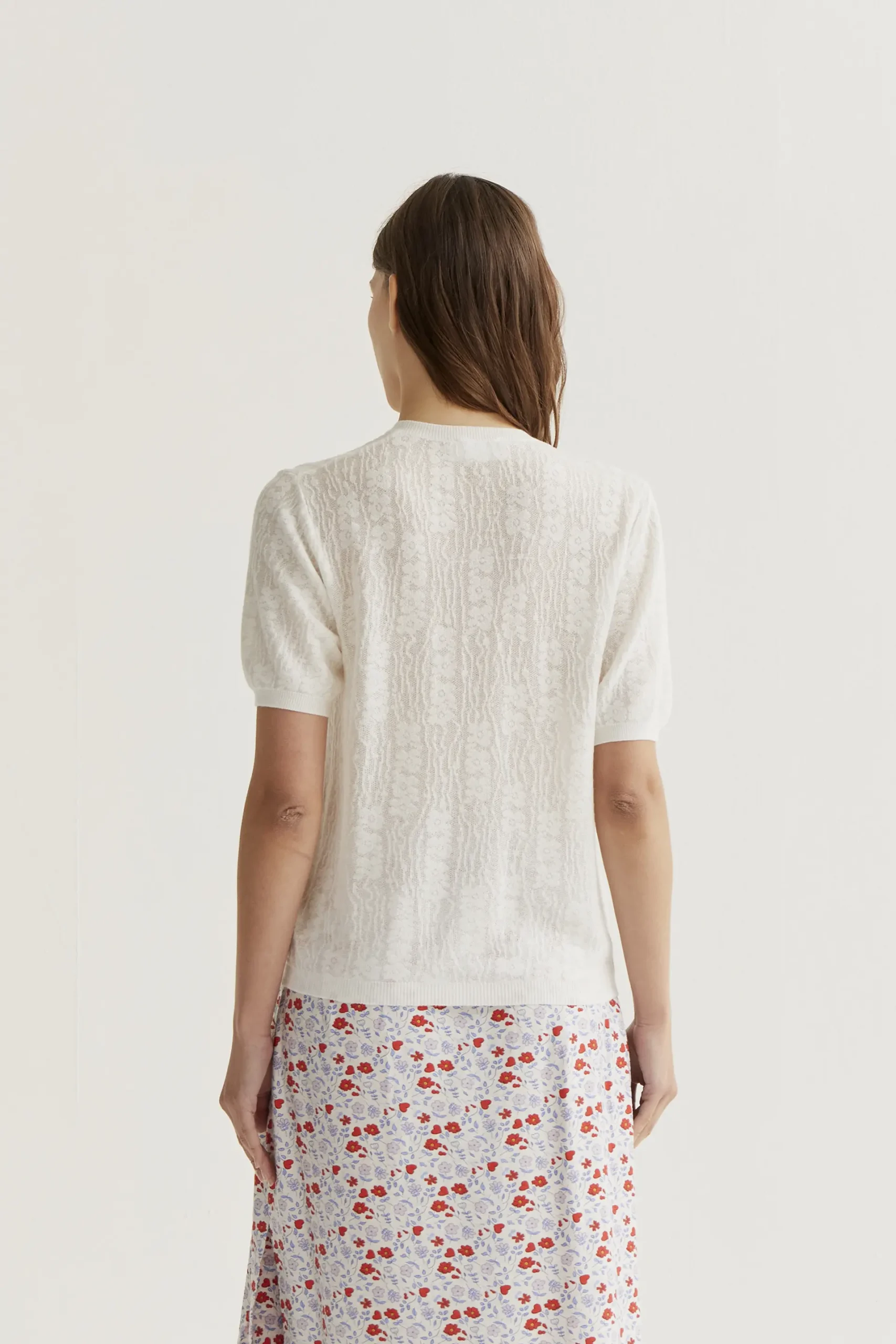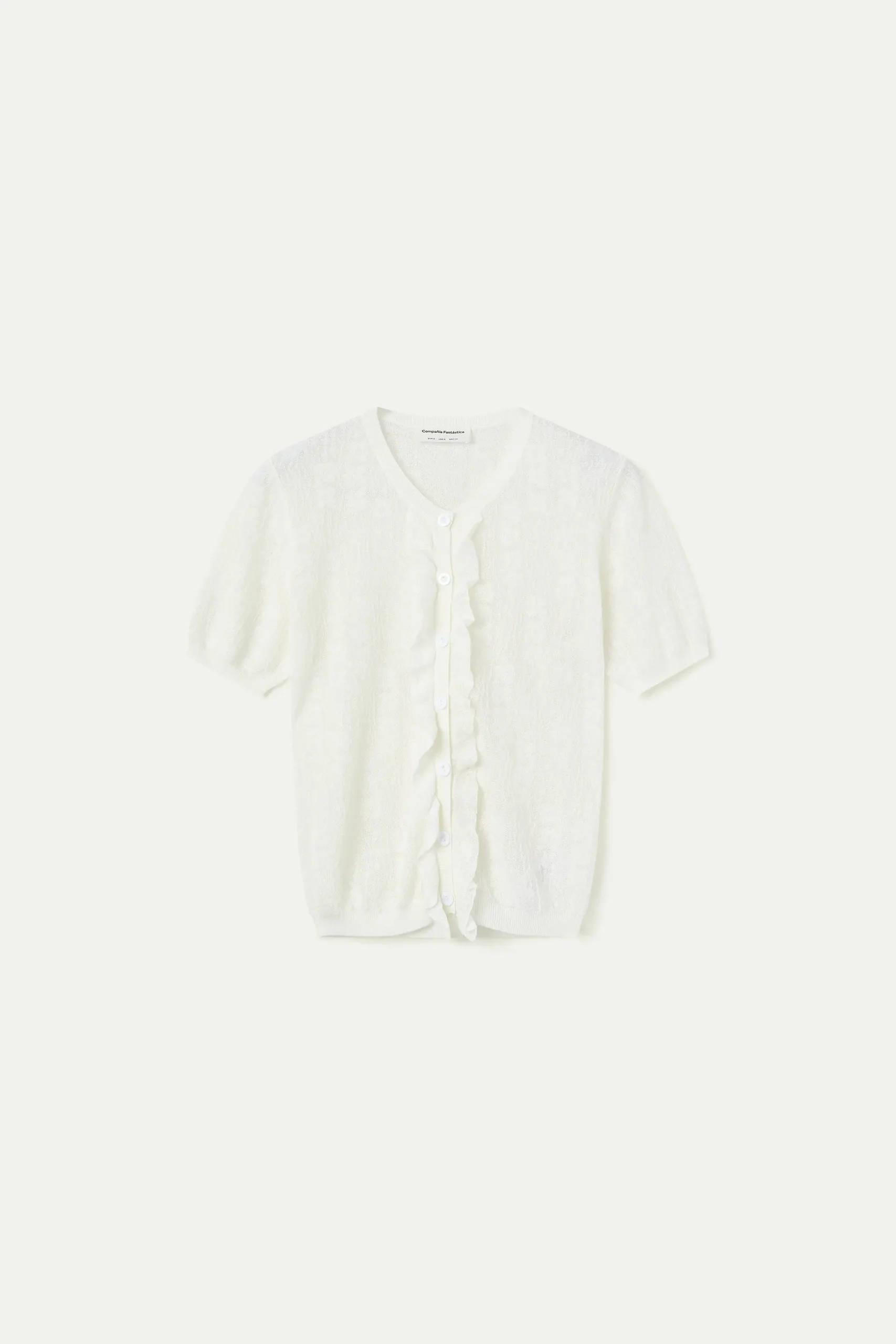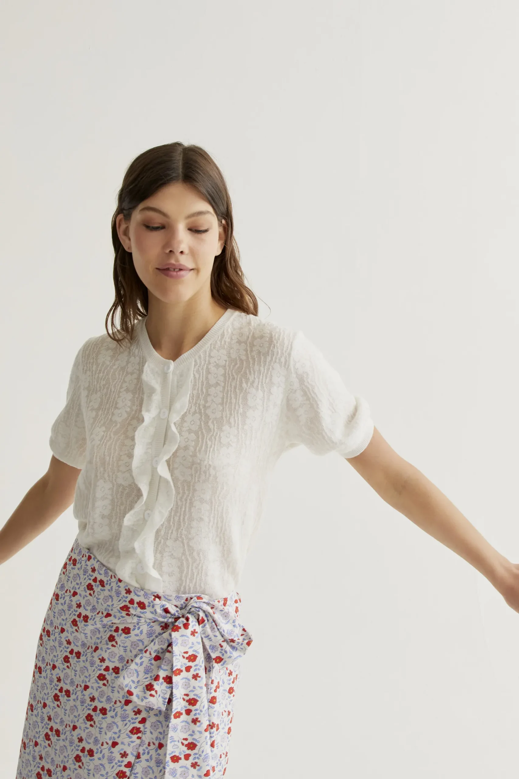 Cárdigan de tejido punto con flores de color blanco. Cuello redondo y manga 3/4. Cierre frontal con botones de color blanco con detalles de volantes. Acabados en rib. La modelo mide 177 cm y lleva la talla S.