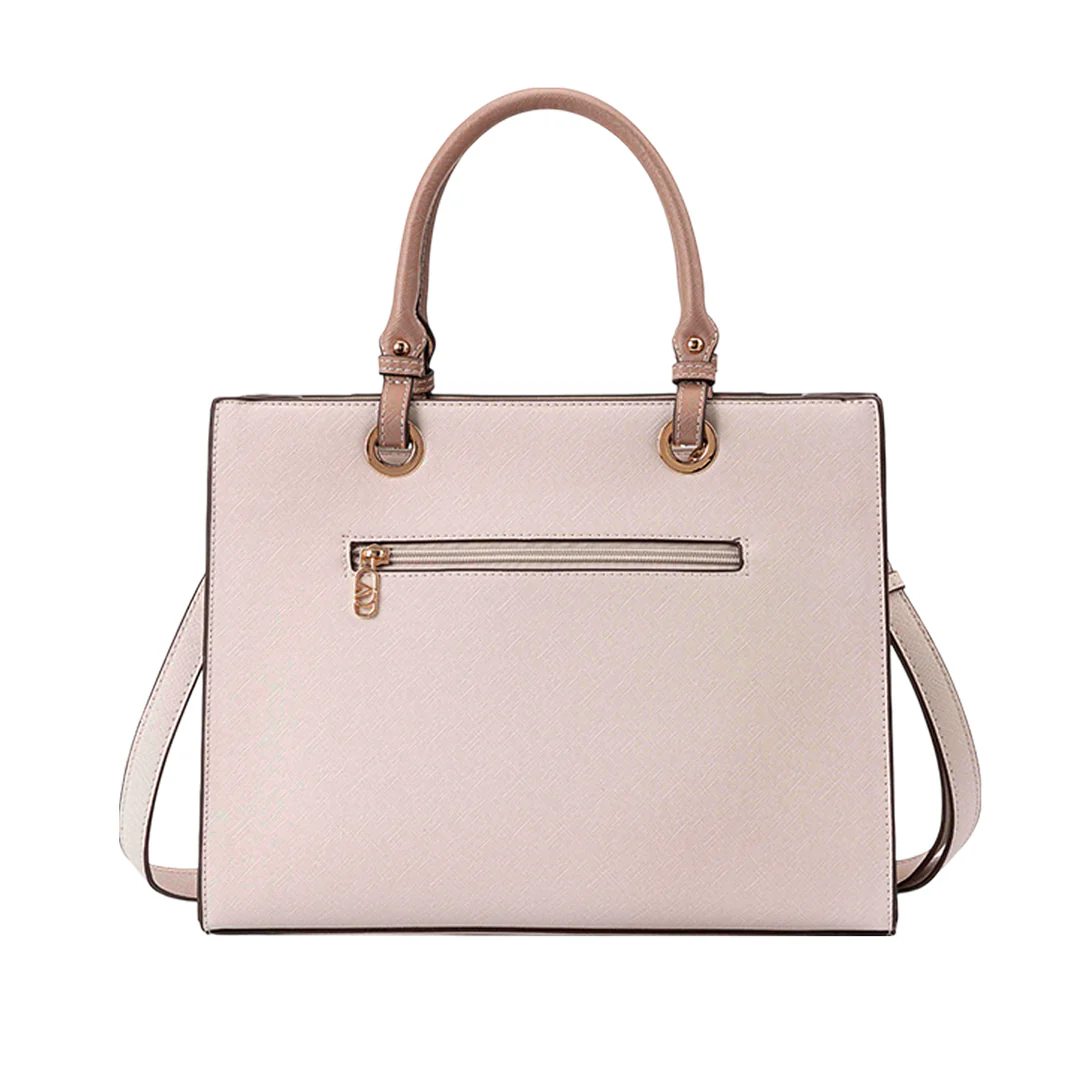Cartera tote Zina color hueso, hecha en material sintético de textura suave. Su formato (31×12.5×23.5 cm) y diseño estructurado brindan comodidad y sofisticación.