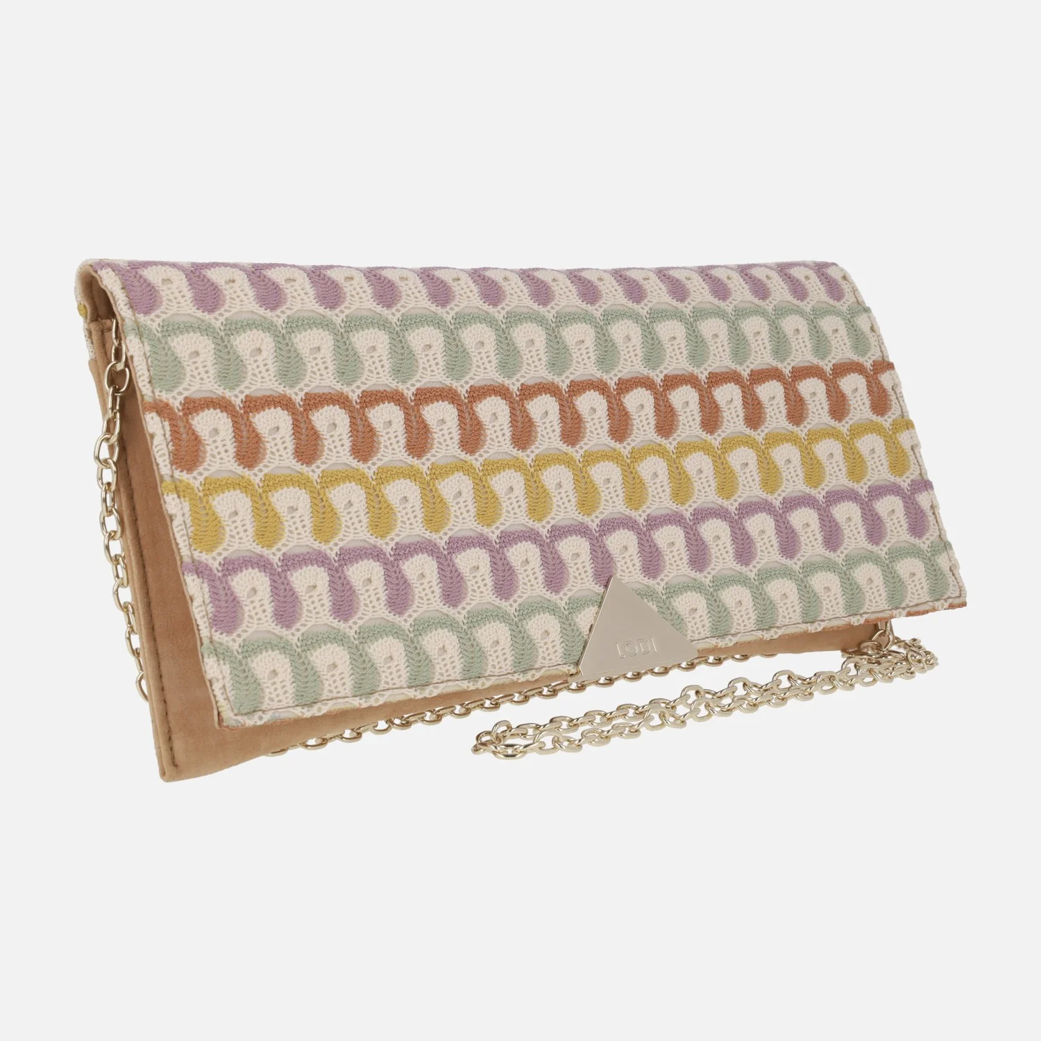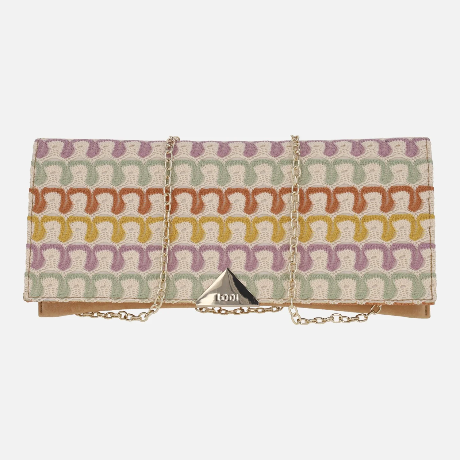 Carteras rectangulares modelo L1816 de Lodi by Henna bolsos. Carteras elaboradas en ante camel con solapa en tejido crochet multicolor, a juego con los modelos Genasti-X y Amisanti-X de Lodi. Cartera rectangular con solapa que cierre con broche imantado. Interior textil con un bolsillo con cremallera. Asa de cadena dorada extraíble, de 47 cms de altura al hombro. Medidas: 13,5 cms de alto x 29 cms de ancho x 2 cms de fondo.