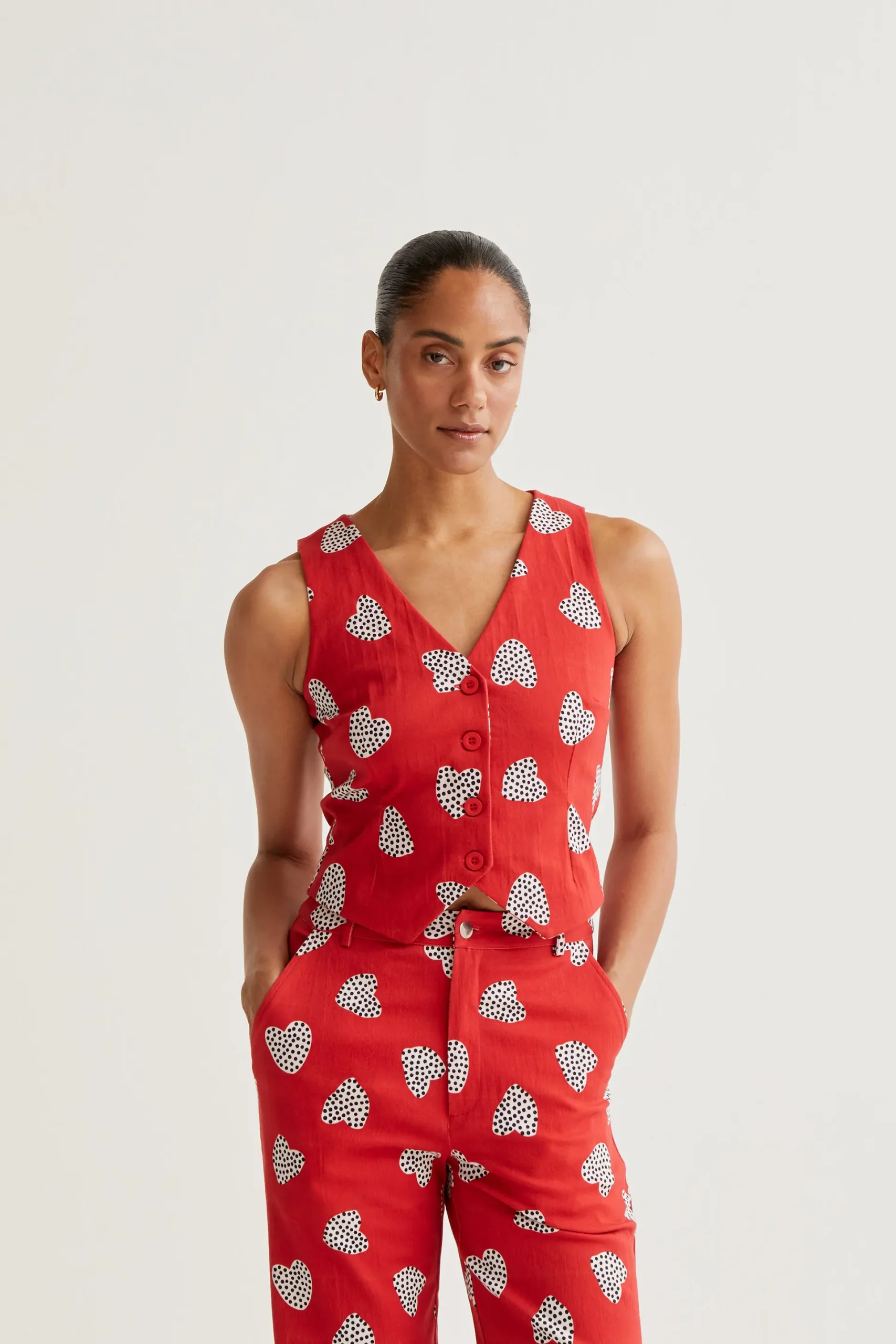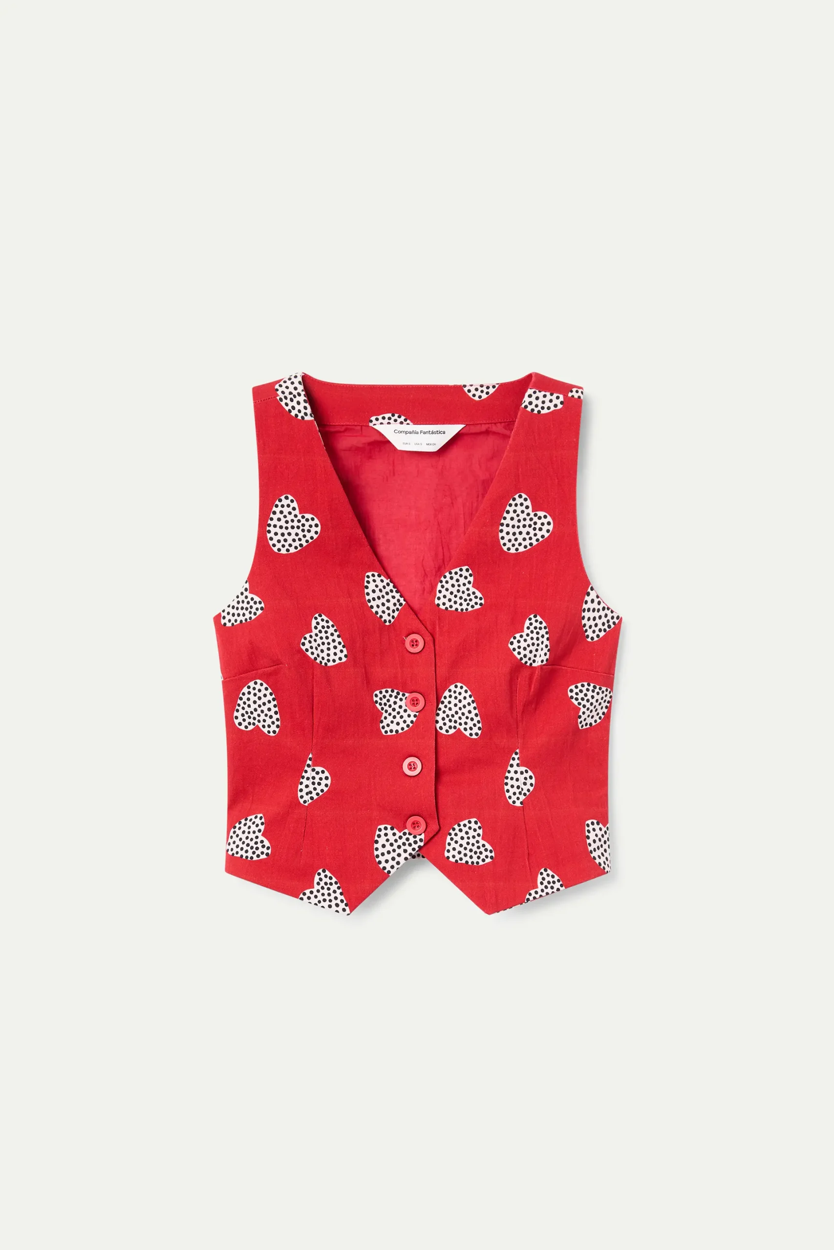 Chaleco de tejido 98% de algodón elástico con estampado harmony red. Escote pico y sin mangas. Cierre frontal con botones de color rojo.Forro interior. La modelo mide 173 cm y lleva la talla S.