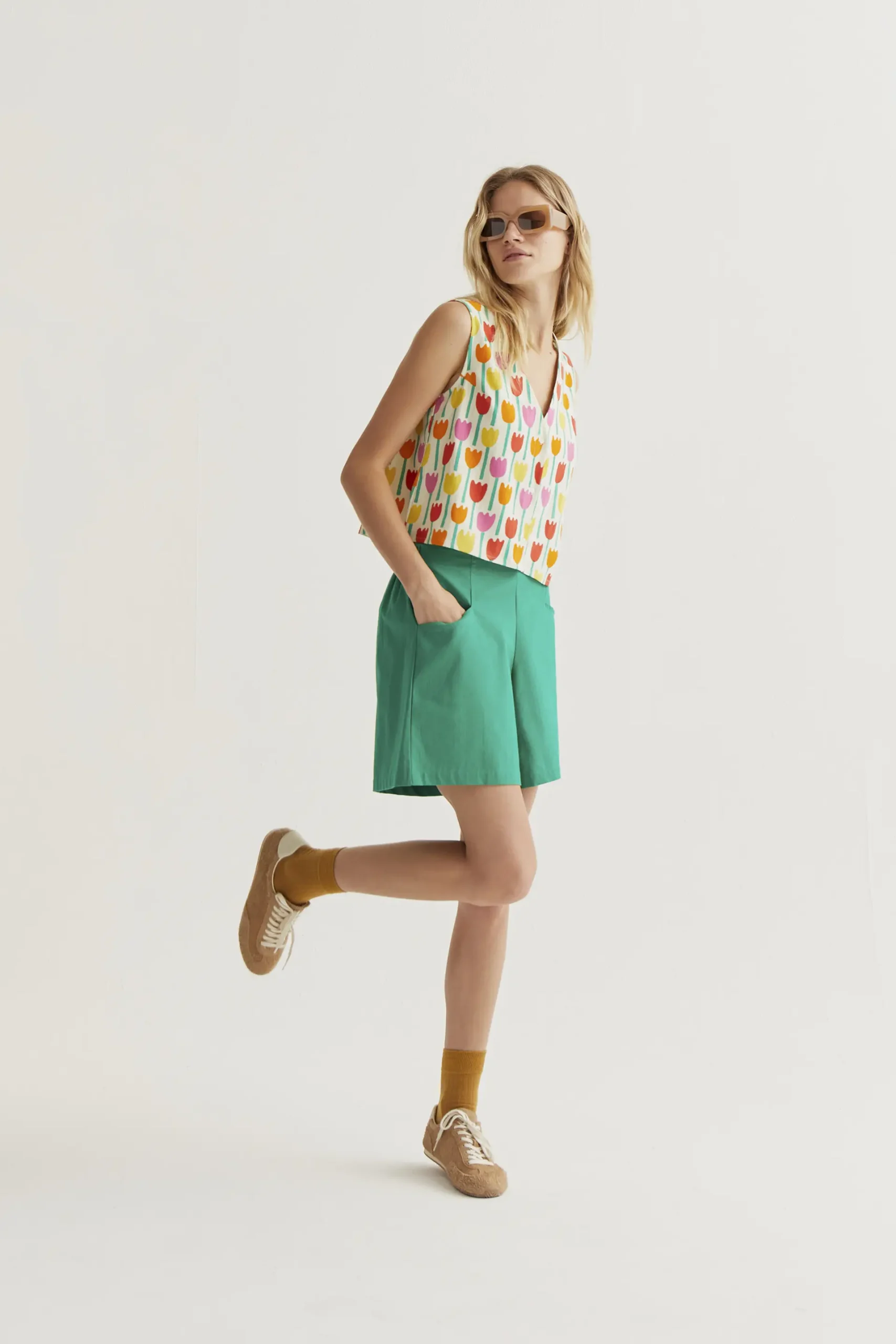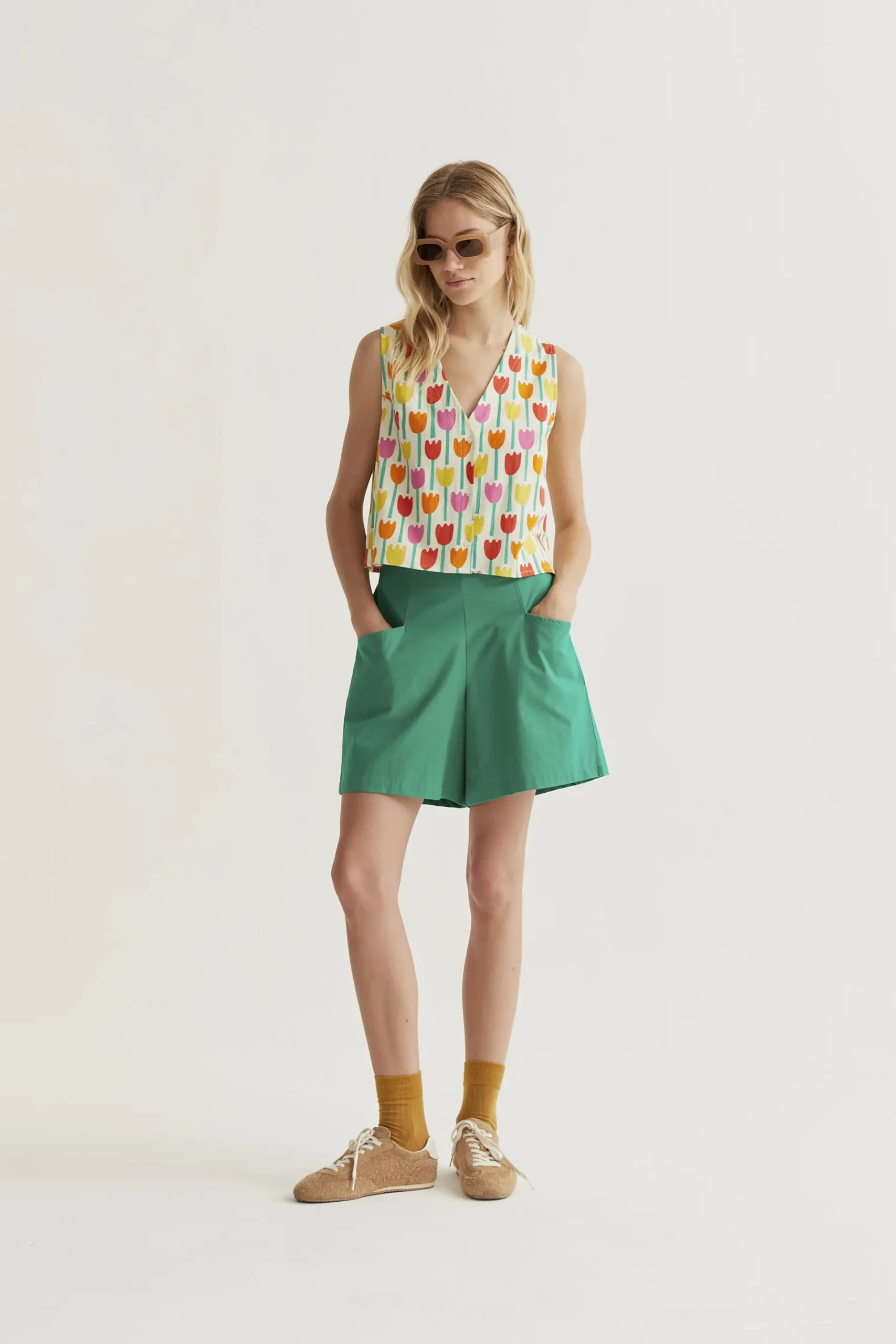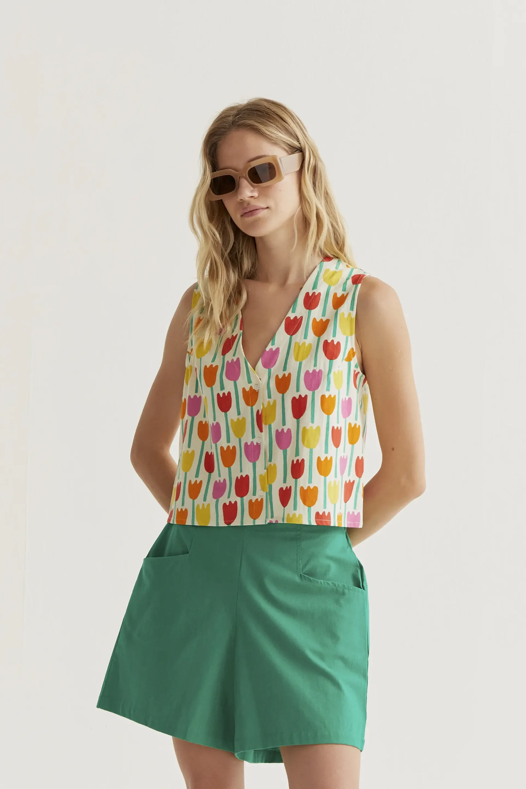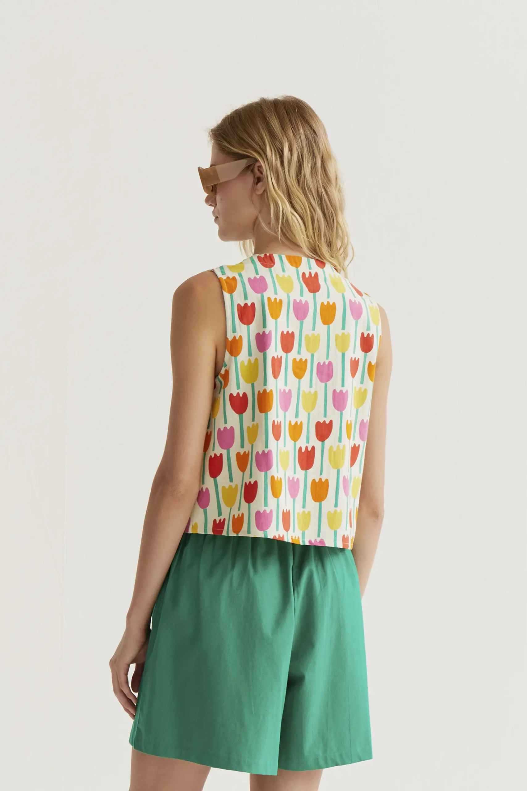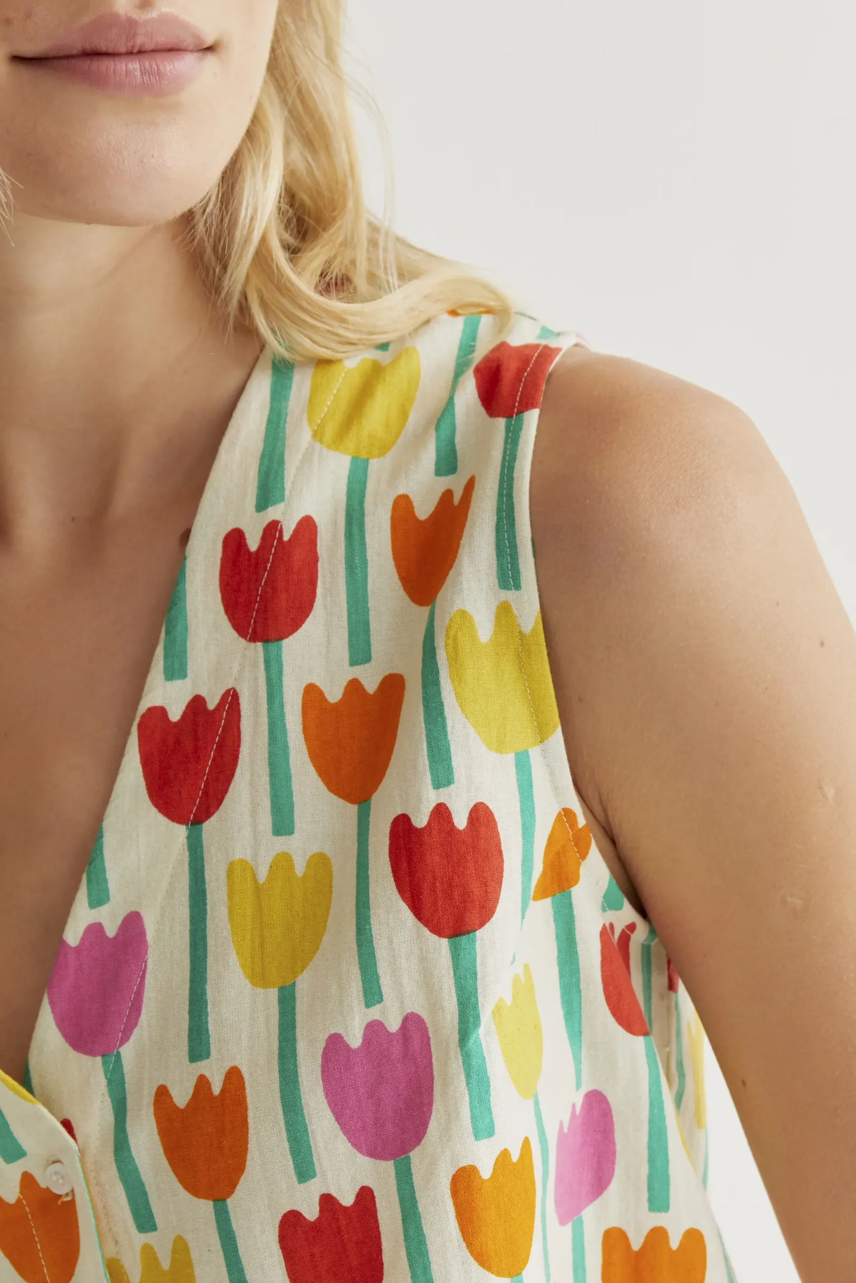 Chaleco de tejido 100% algodón con estampado tulipa. Escote pico y sin mangas. Cierre frontal con botones de color blanco. La modelo mide 177 cm y lleva la talla S.