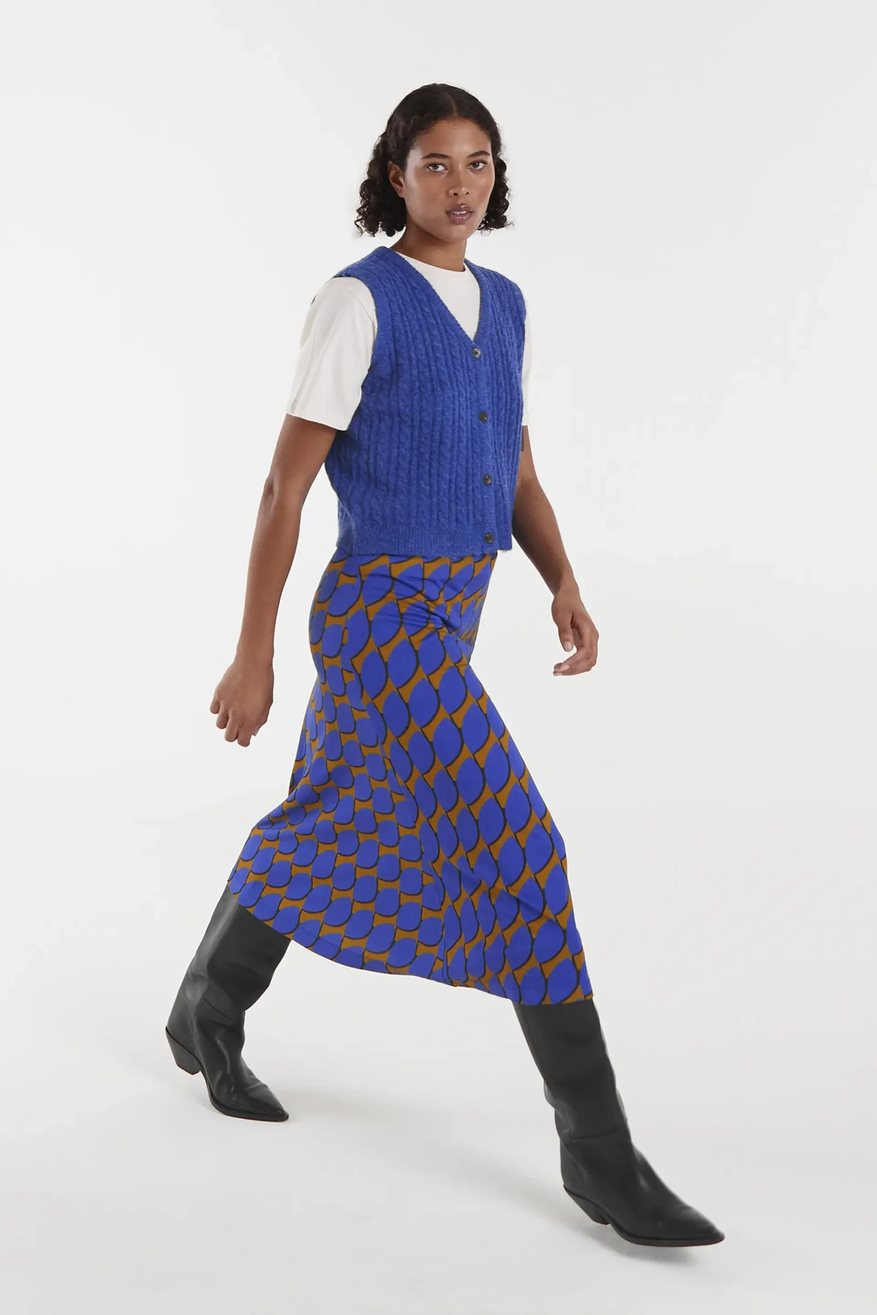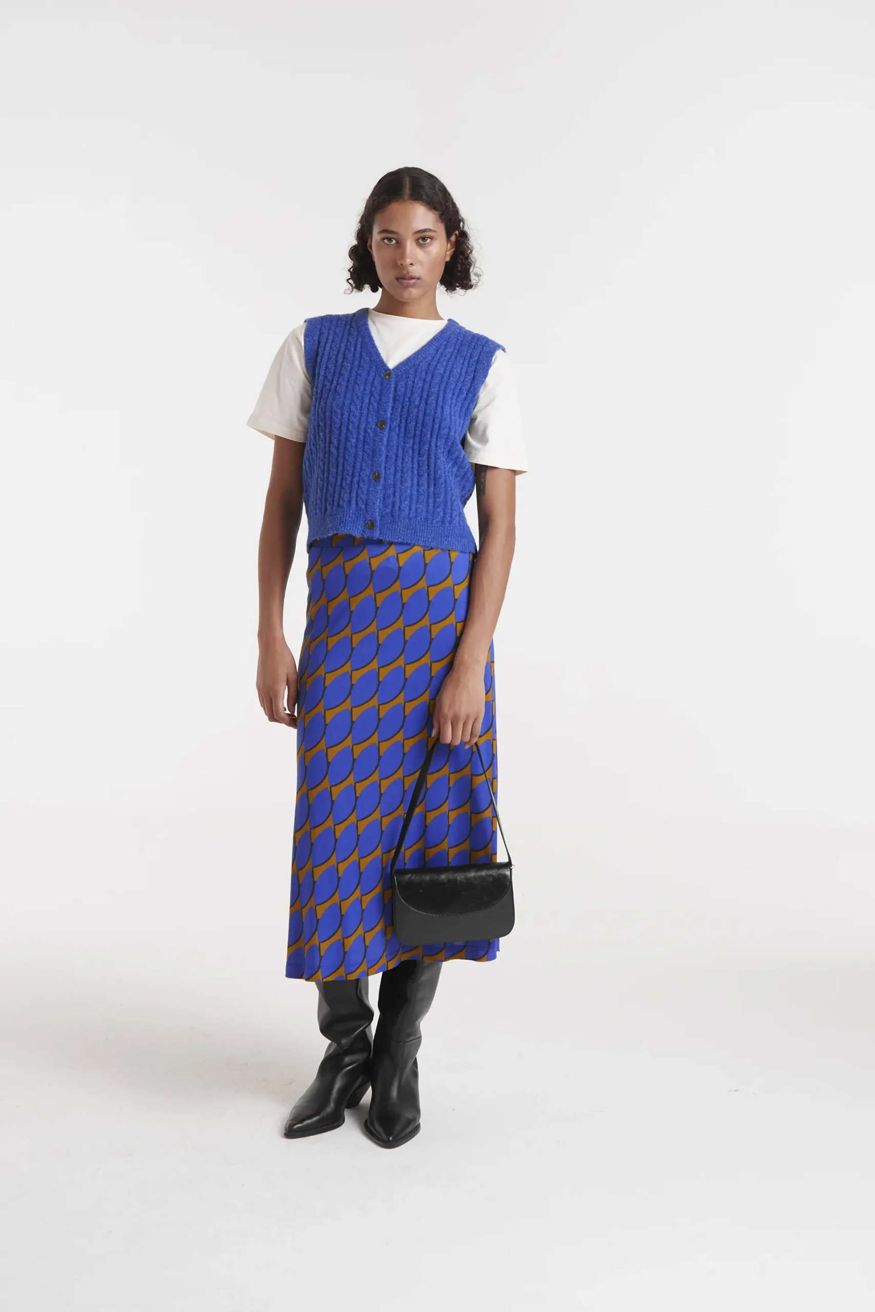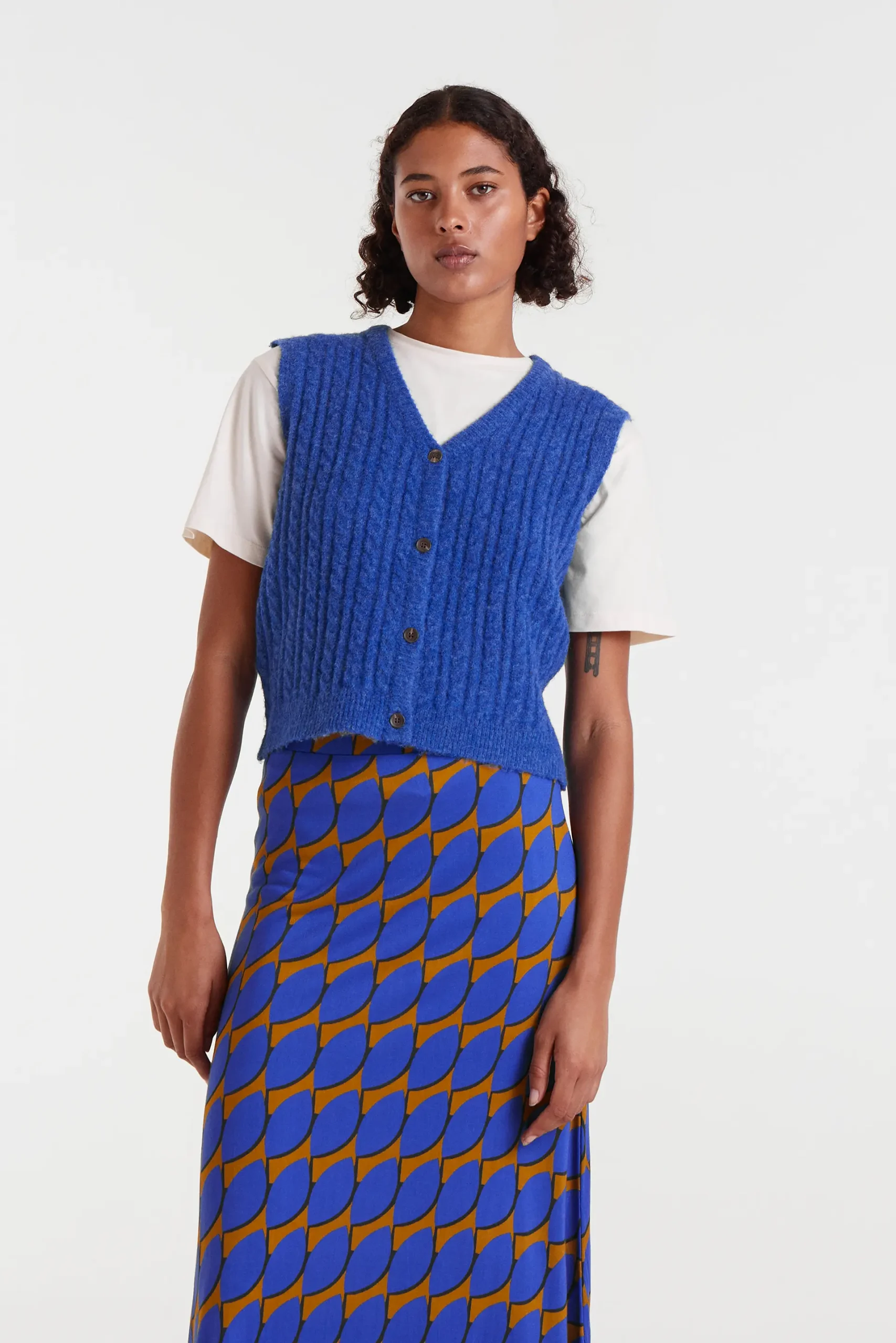 Chaleco de punto de color azul. Con cuello pico y sin mangas. Cierre frontal con botones. Detalles en rib. La modelo mide 178 cm y lleva la talla S.