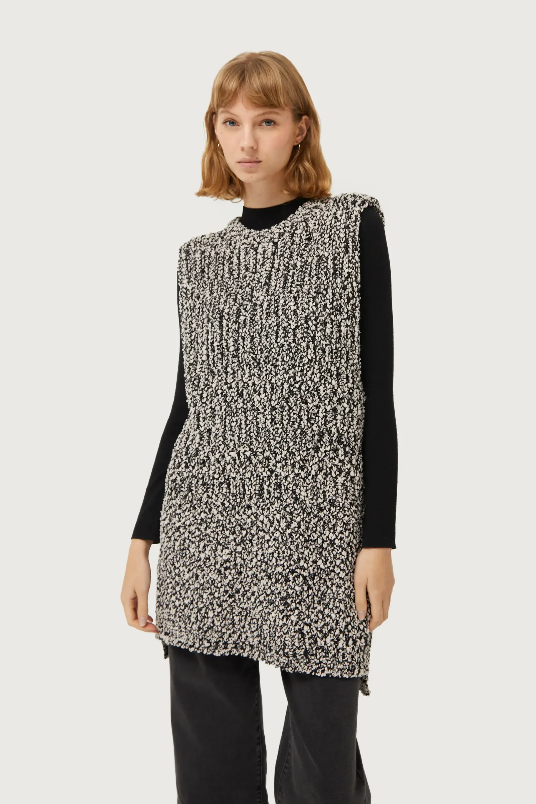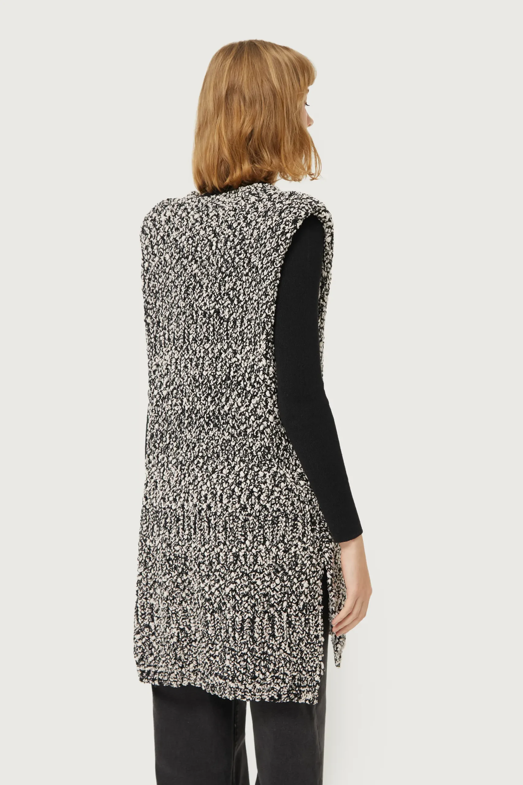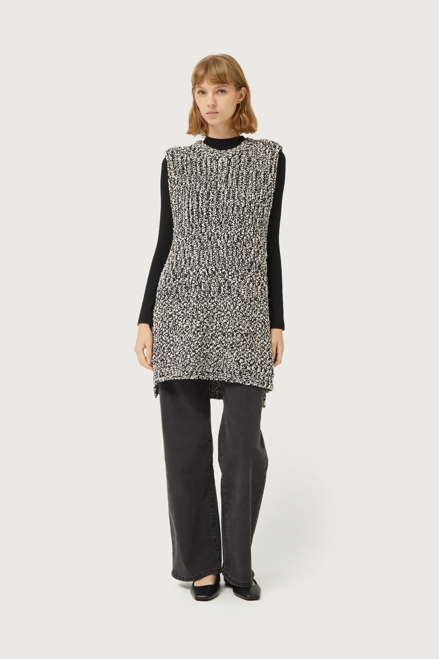 Chaleco largo de punto grueso de color blanco y negro. Con cuello redondo y sin mangas. Detalle de aberturas laterales. La modelo mide 176 cm y lleva la talla S.