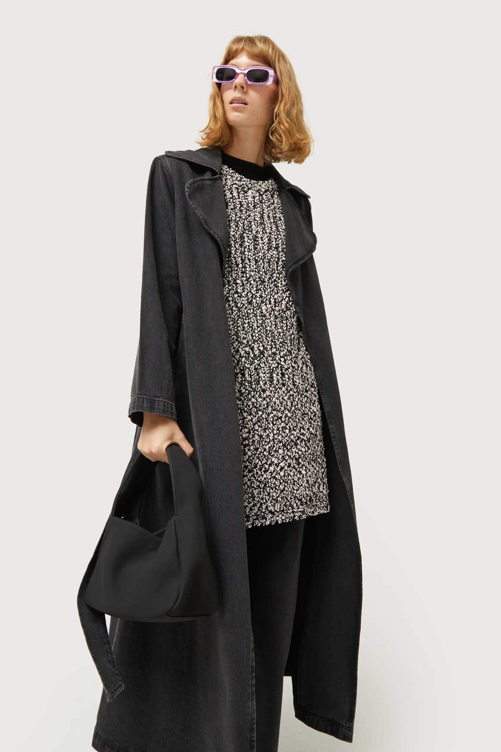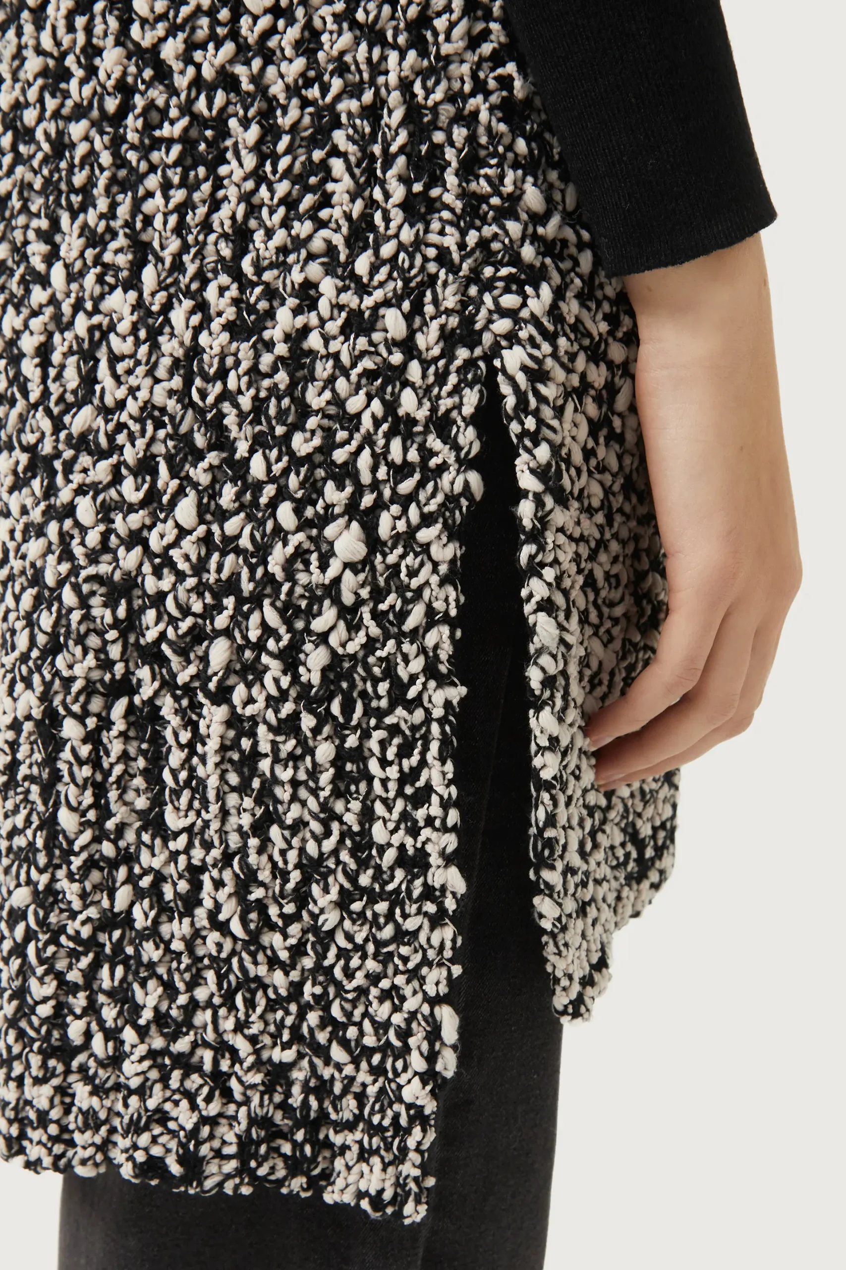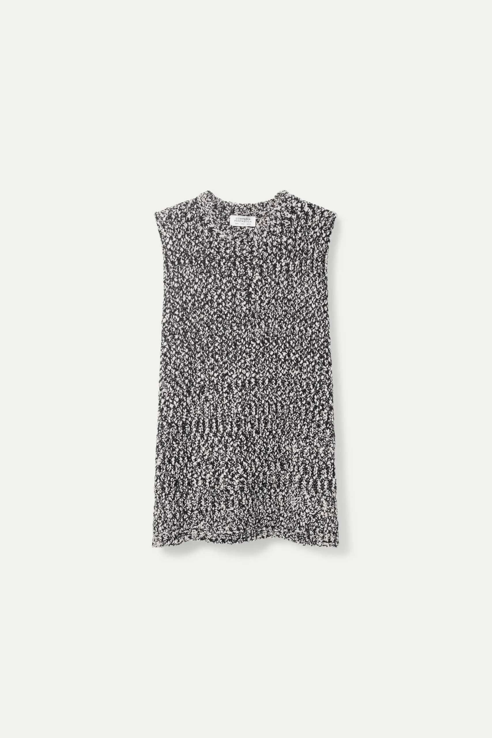 Chaleco largo de punto grueso de color blanco y negro. Con cuello redondo y sin mangas. Detalle de aberturas laterales. La modelo mide 176 cm y lleva la talla S.