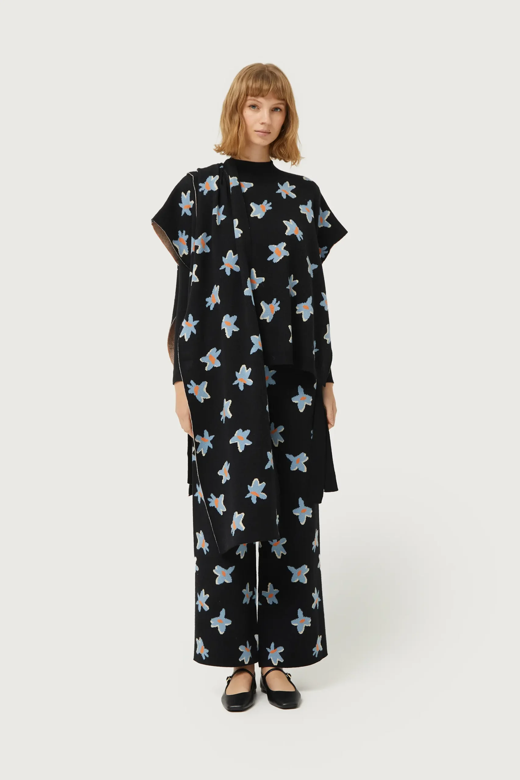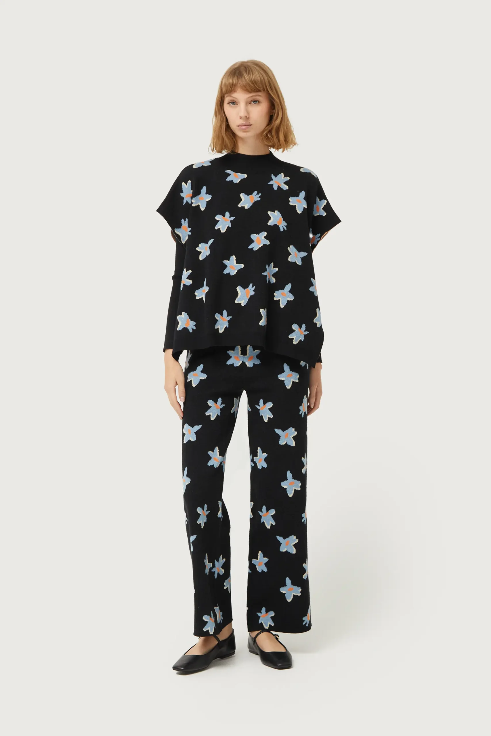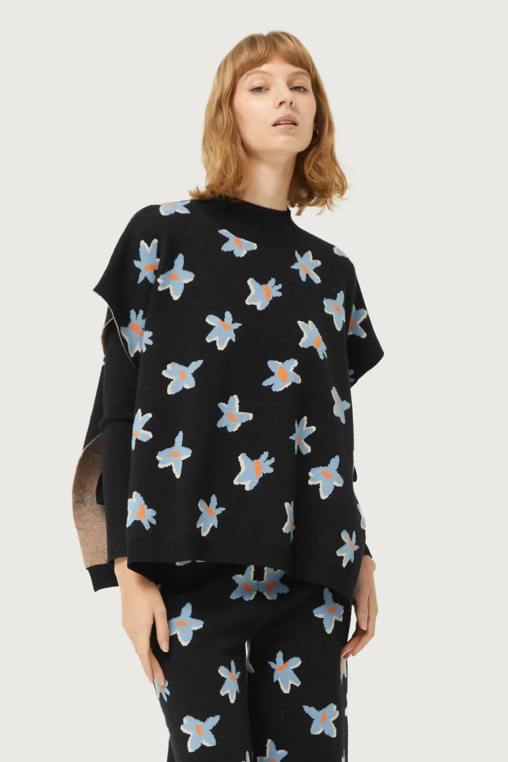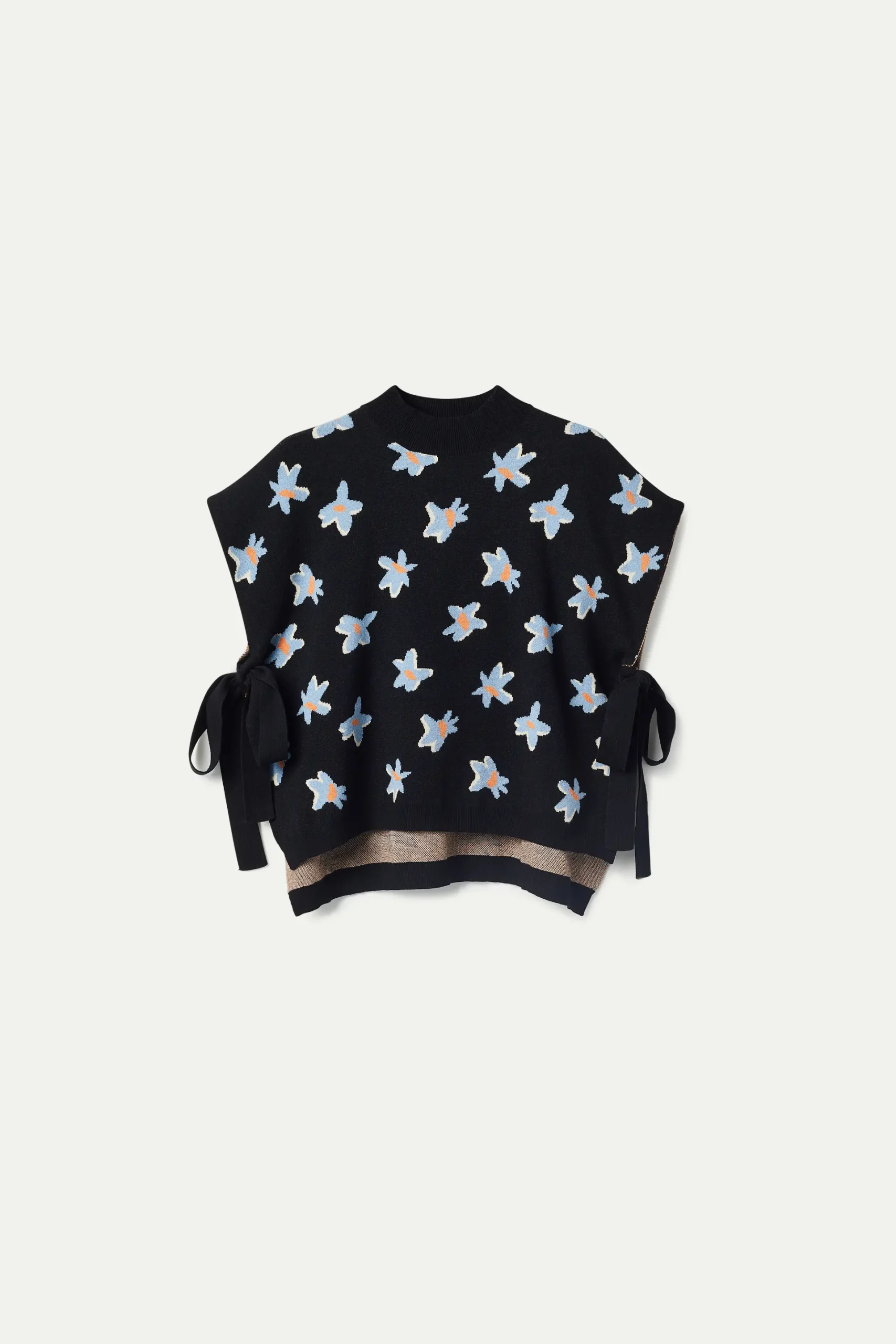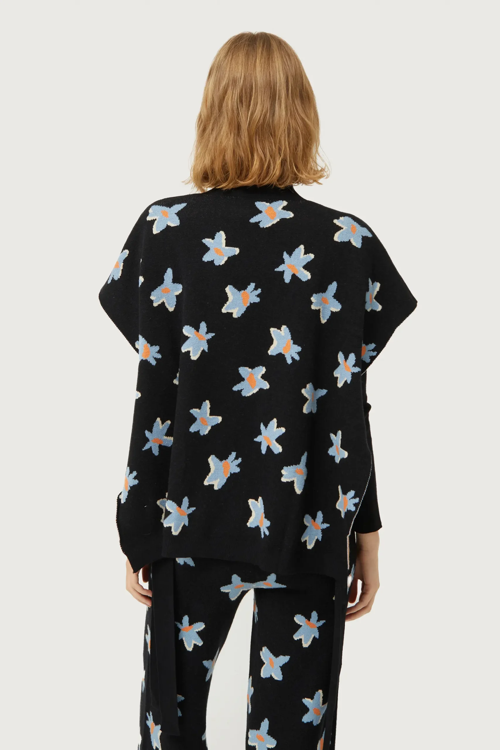 Chaleco de punto jacquard de color negro con estampado de flores azules y amarillas. Con cuello redondo y manga corta. Detalle de aberturas laterales. La modelo mide 176 cm y lleva la talla S.