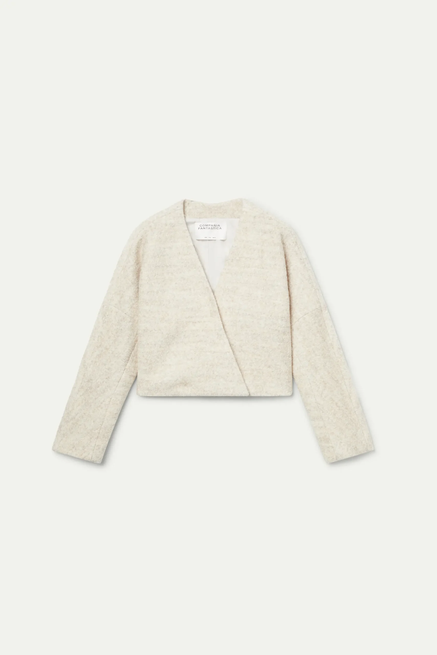 Chaqueta de bouclé de color beige. Con cuello pico y manga larga. Cierre cruzado con botones. Forro interior. La modelo mide 175 cm y lleva la talla S.