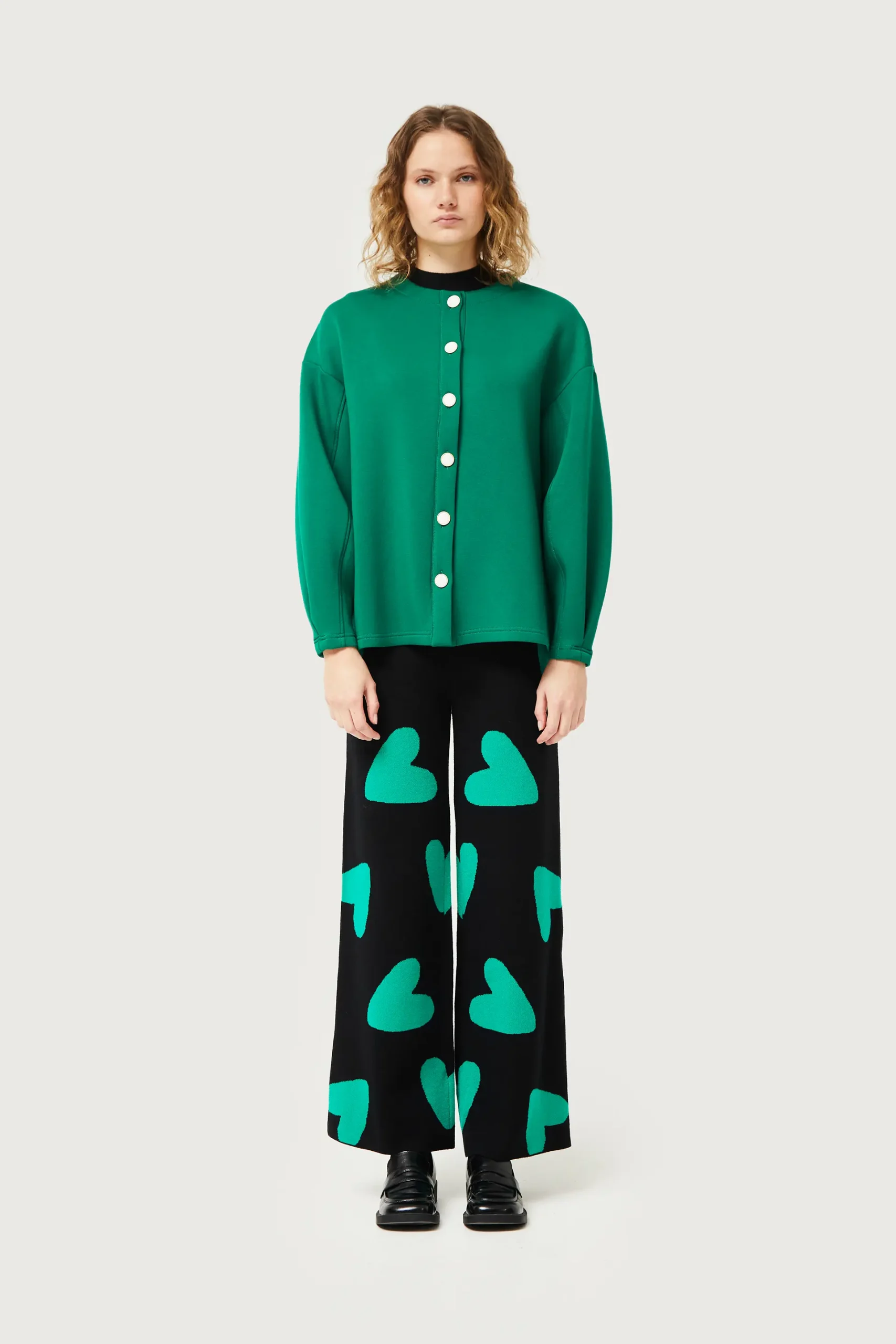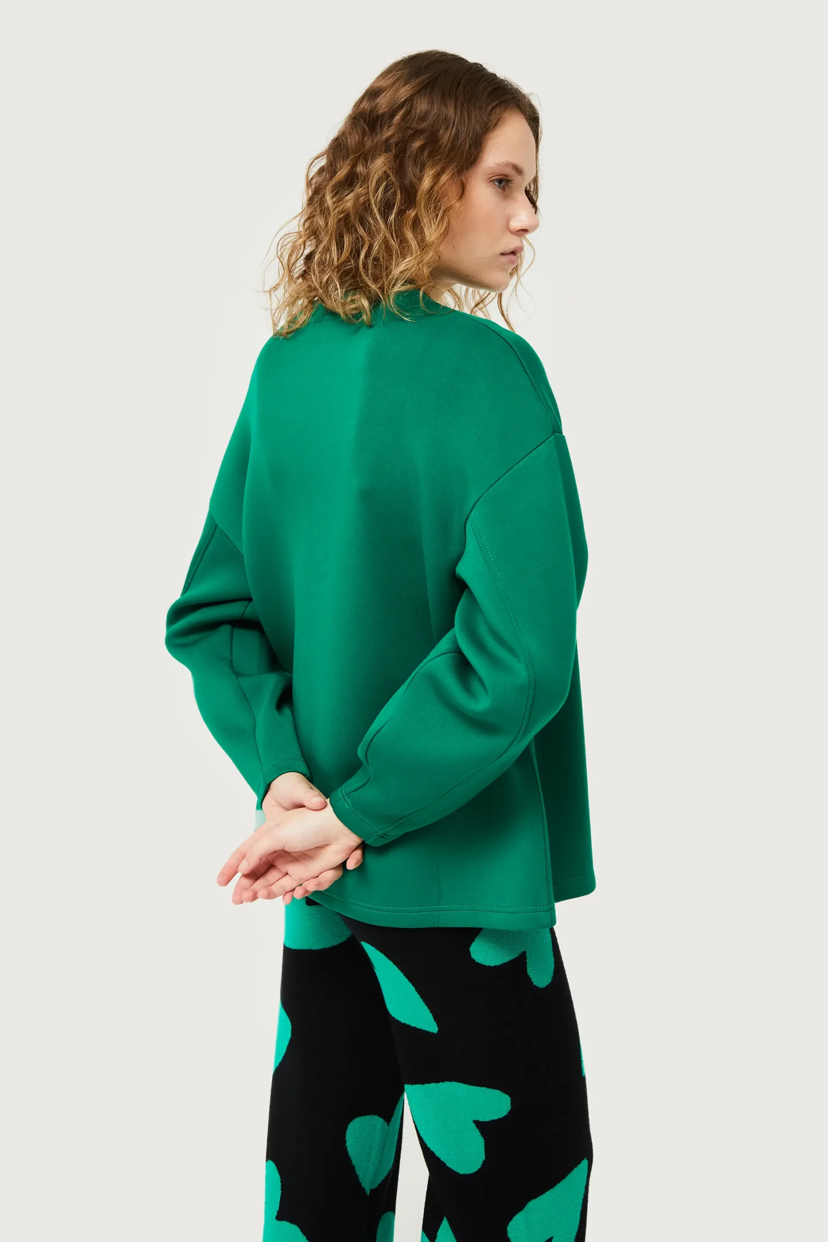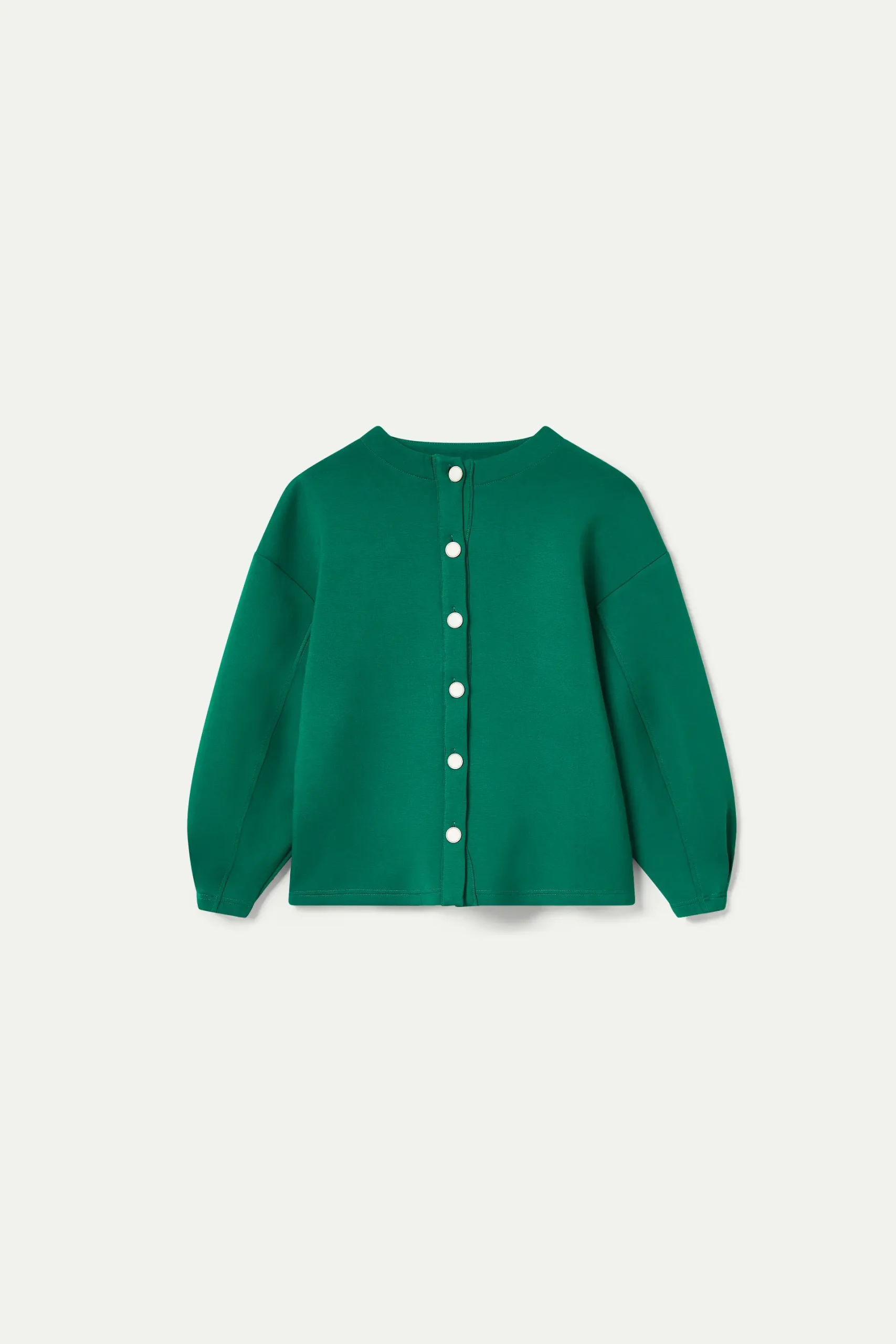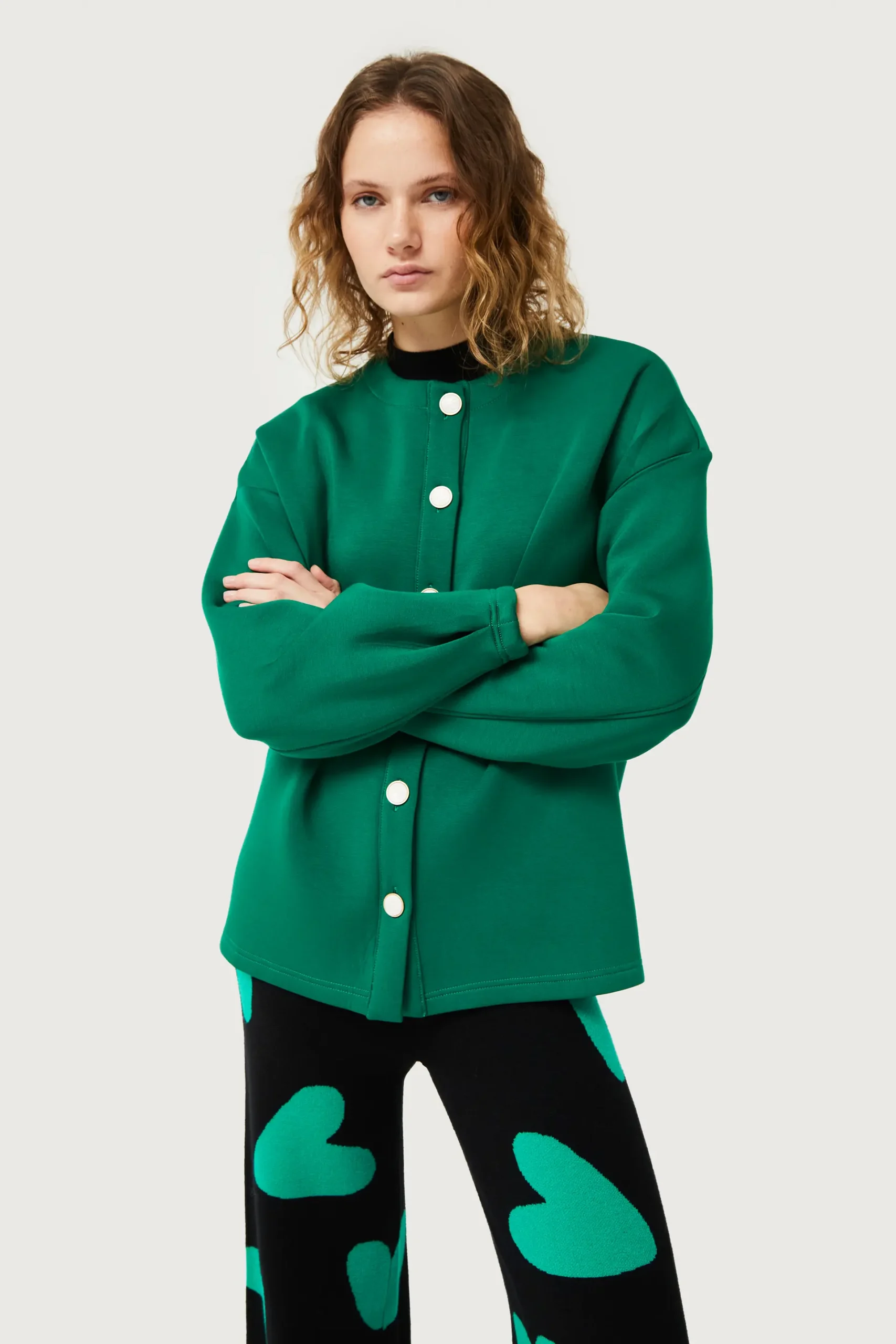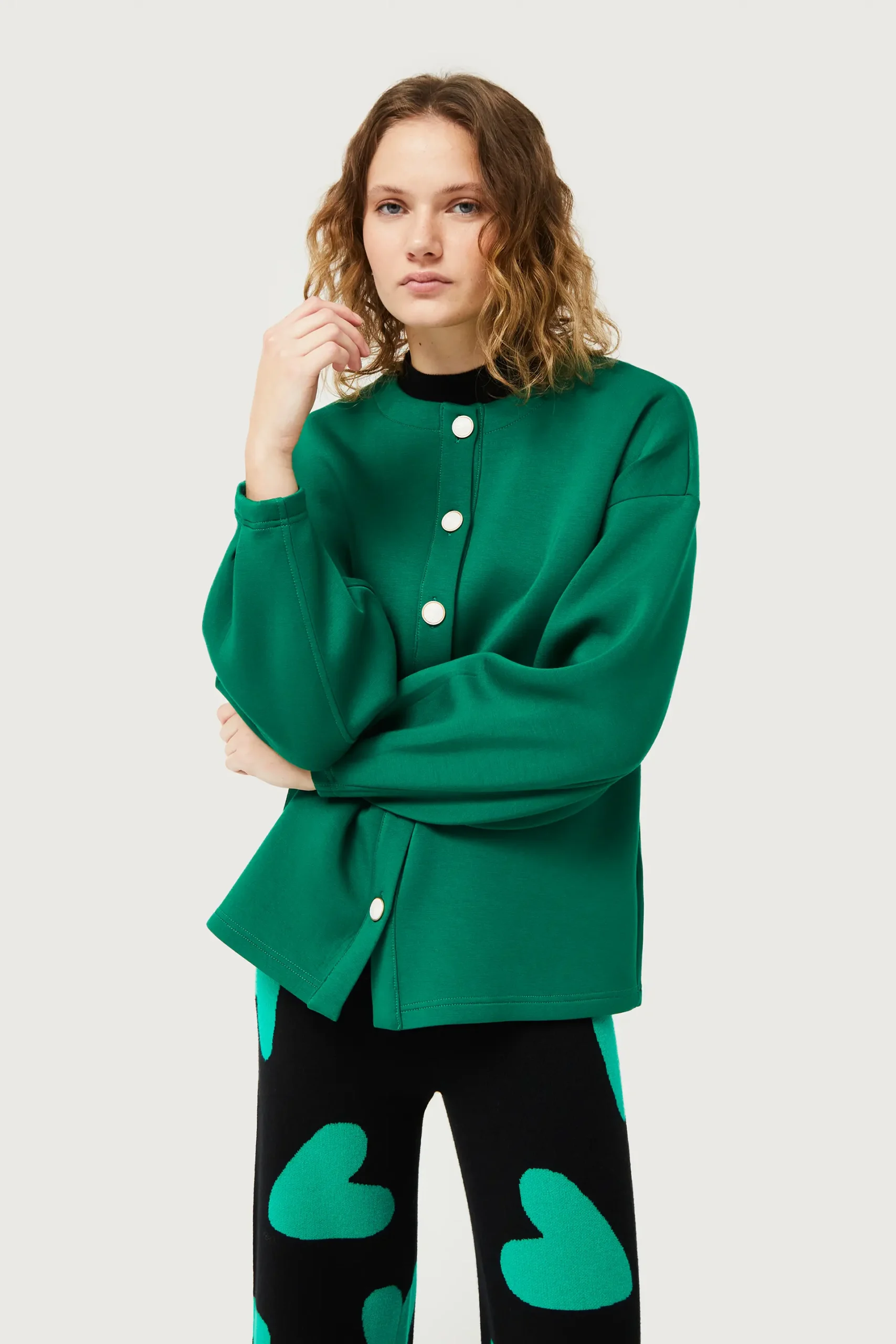 Chaqueta de neopreno de color verde. Con cuello redondo y manga larga. Cierre frontal con botones. La modelo mide 175 cm y lleva la talla S.