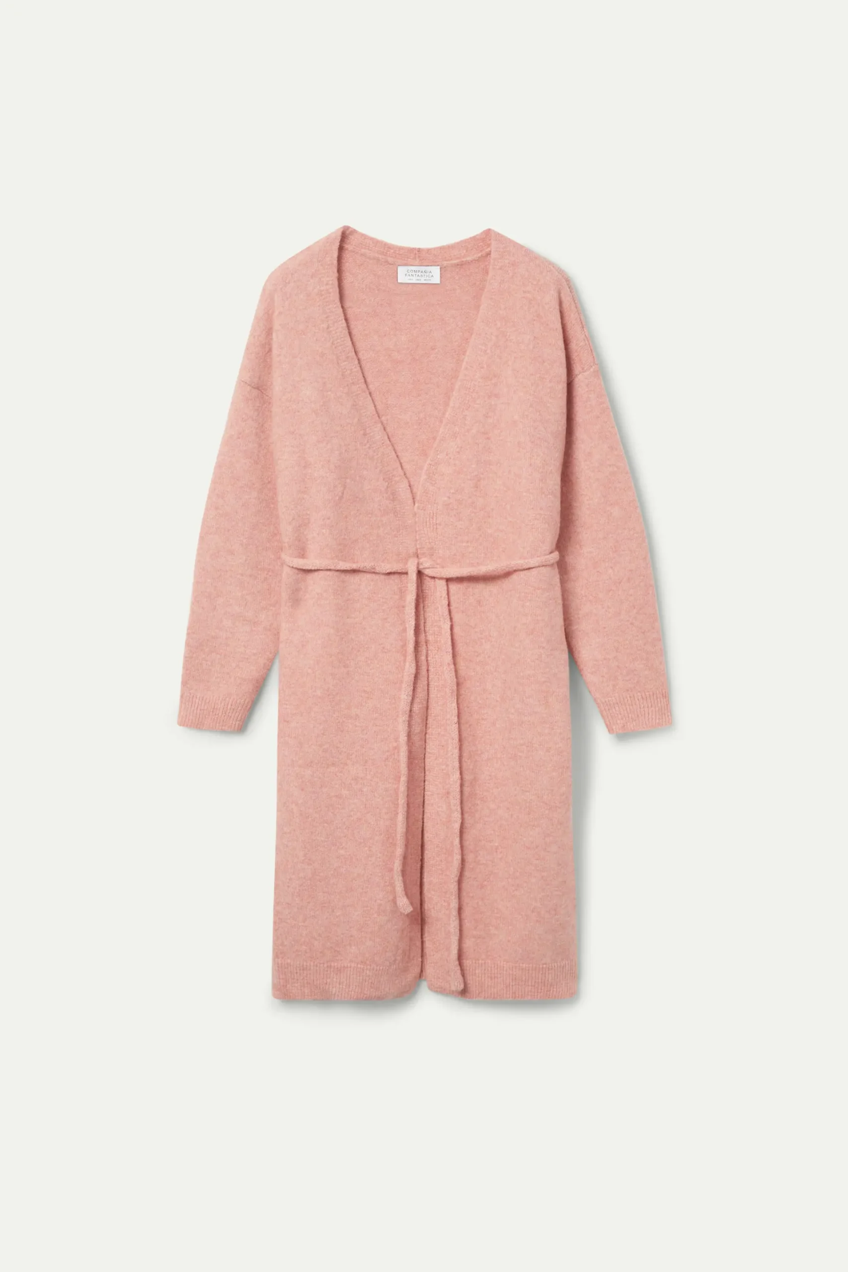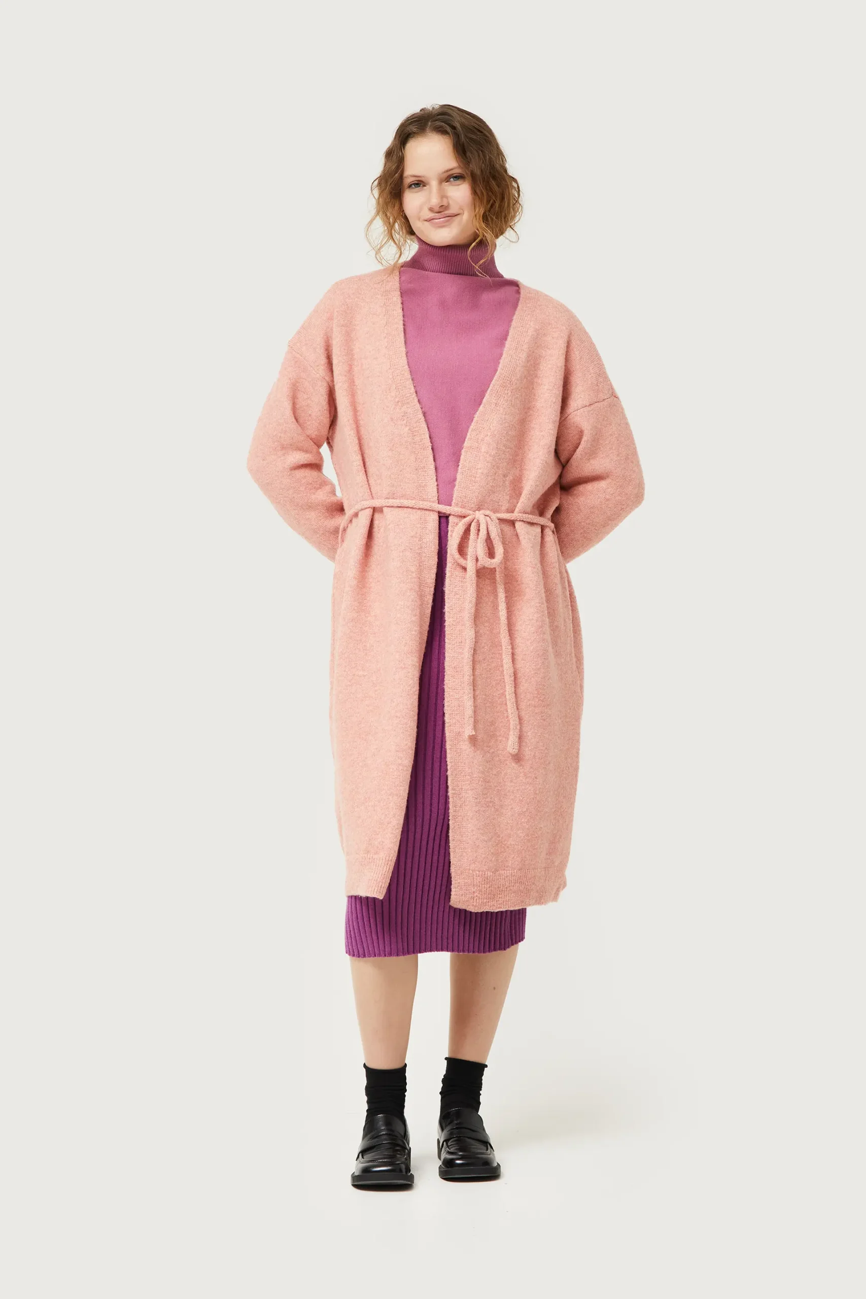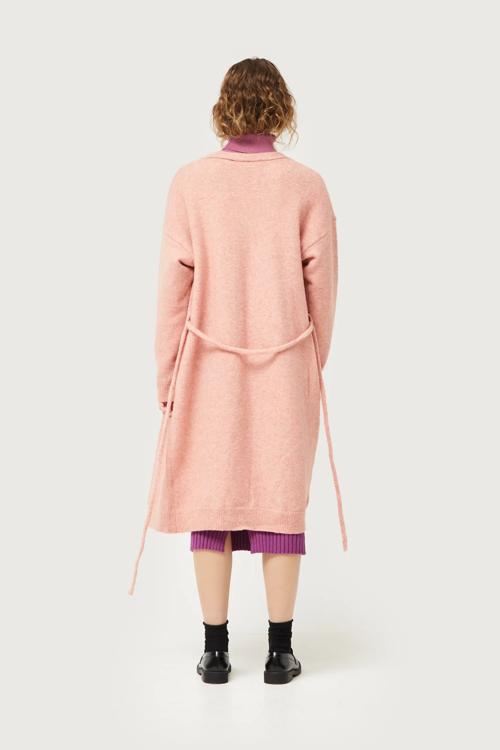 Chaqueta midi de punto de color rosa. Con escote abierto y manga larga. Cierre con cinturón. La modelo mide 175 cm y lleva la talla S.