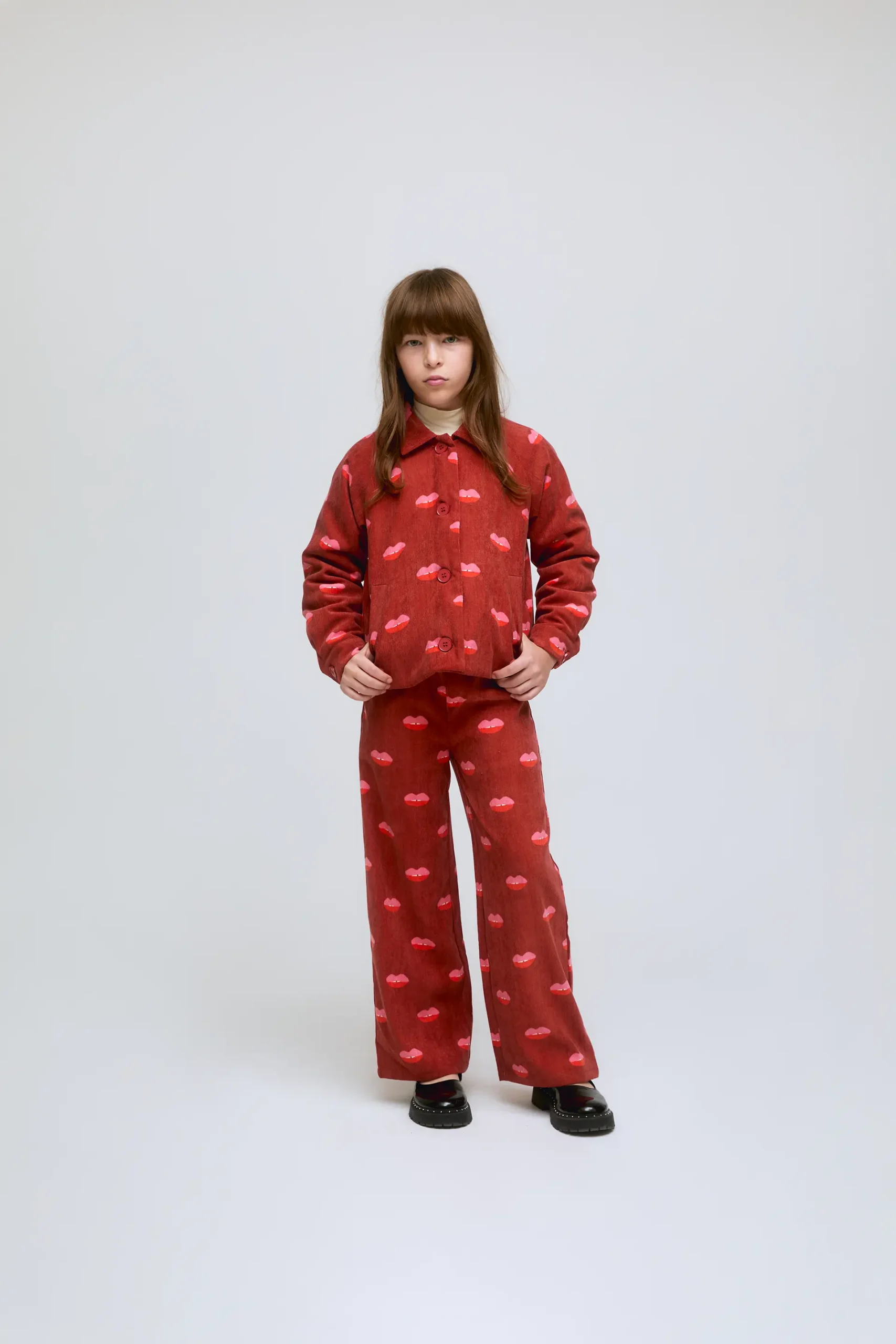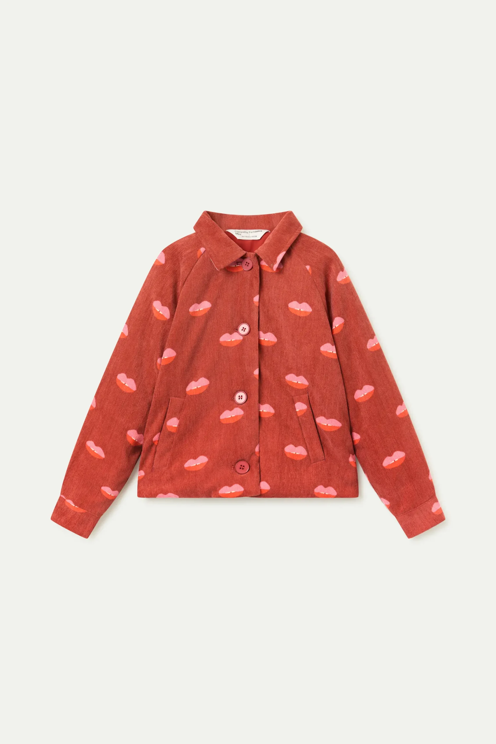 Chaqueta de niña en pana suave de color teja estampado Lips. Con cuello camisero, manga larga y cierre frontal con botones a contraste. Bolsillos laterales y bajo ligeramente elástico para mayor comodidad.