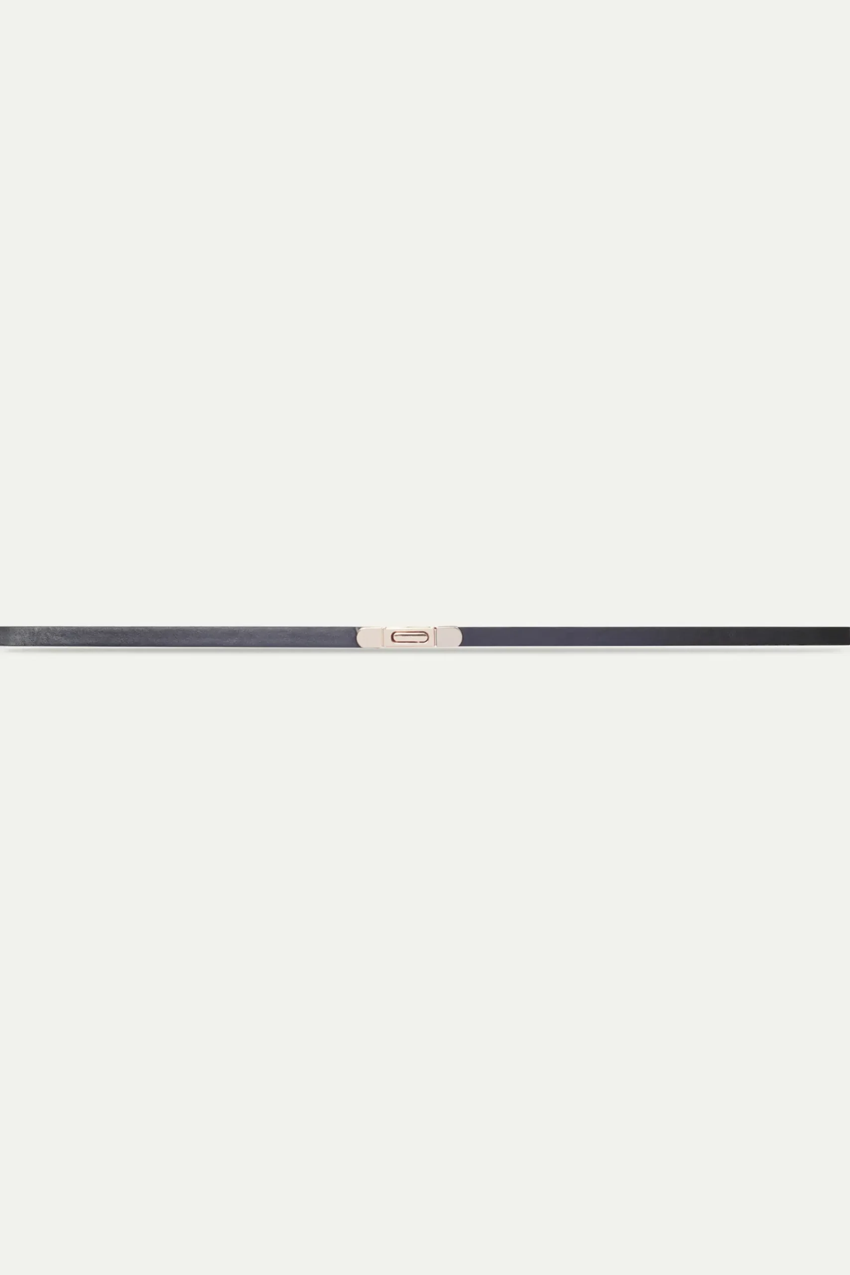 Cinturón fino de piel sintética de color negro. Con hebilla alargada en dorado.