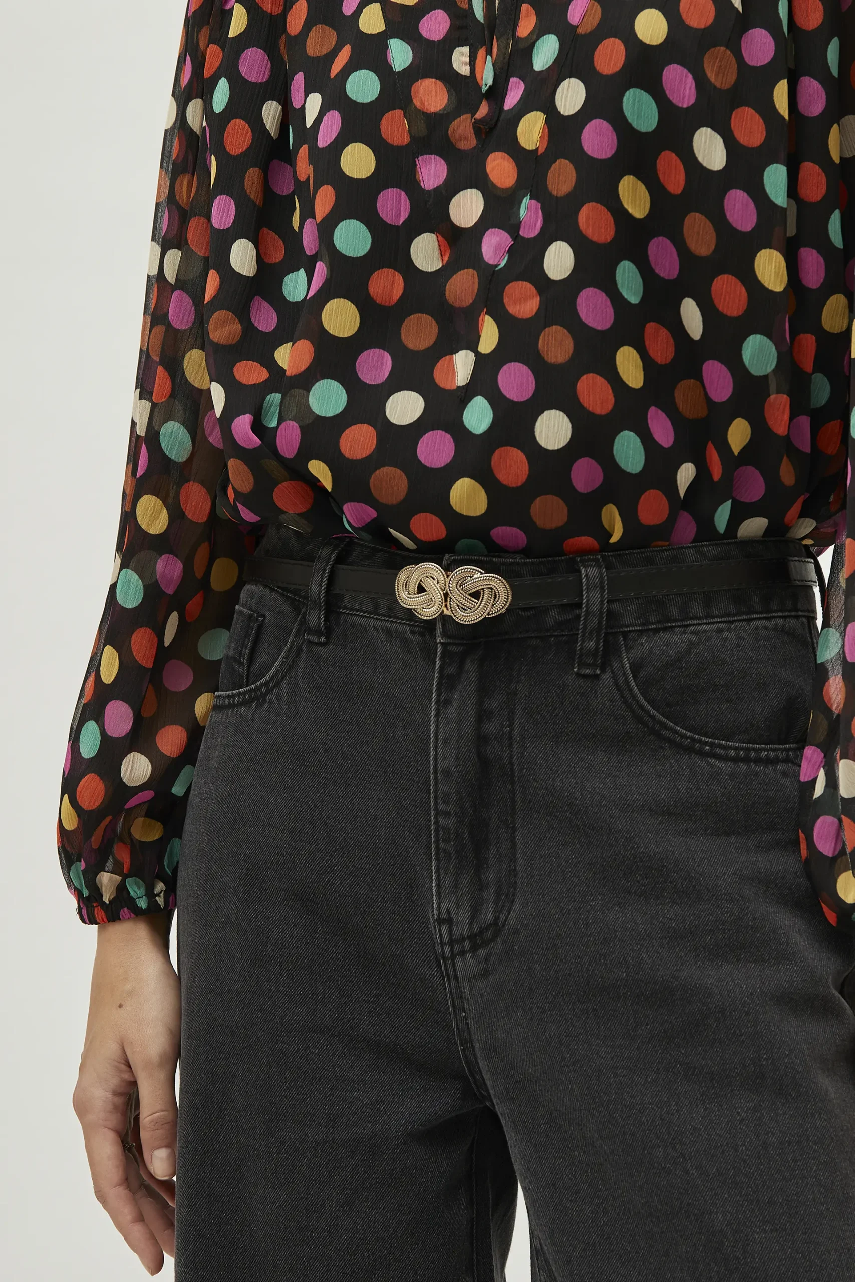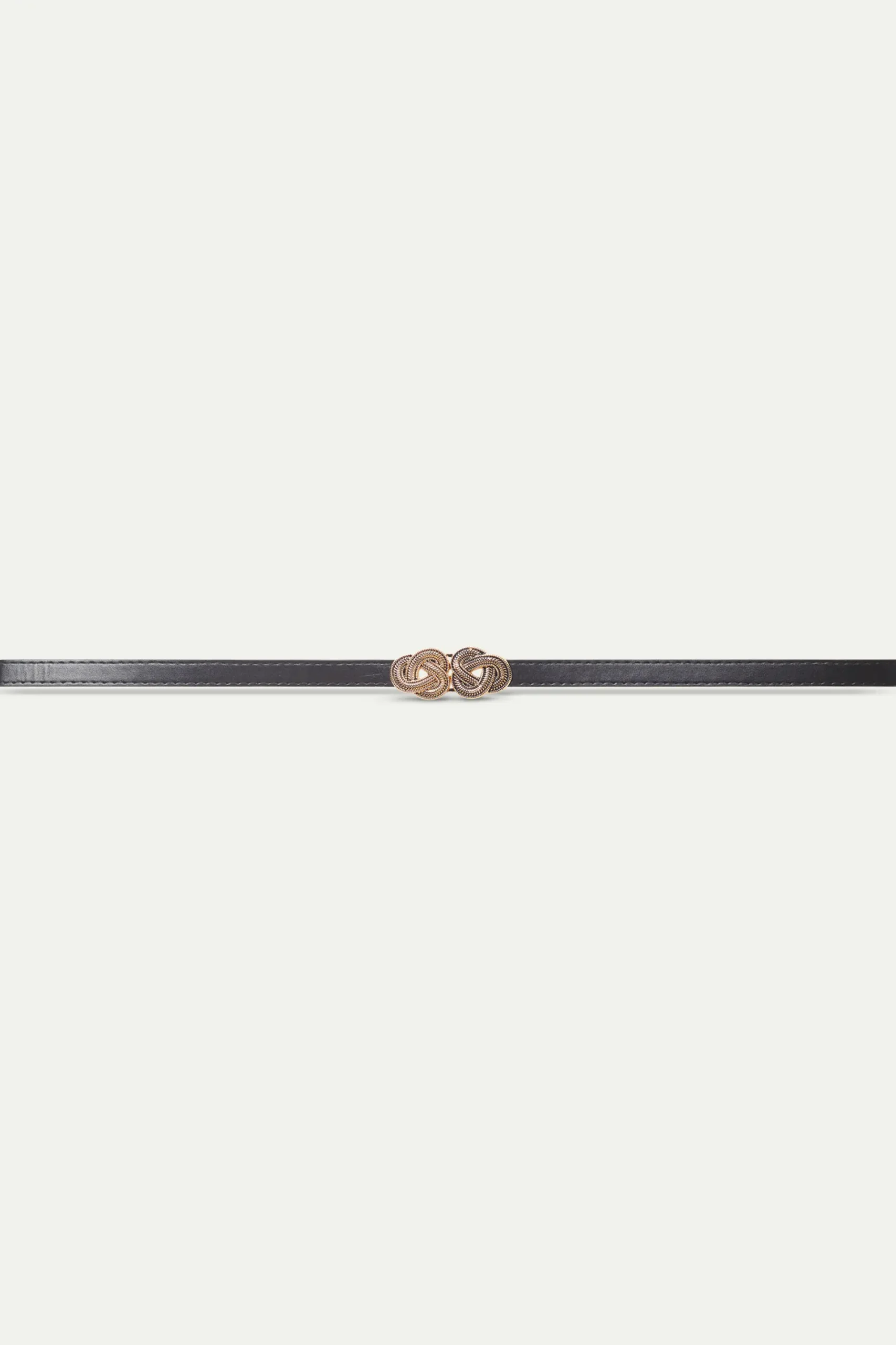 Cinturón fino de piel sintética de color negro. Con hebilla en forma de nudo de color dorado.