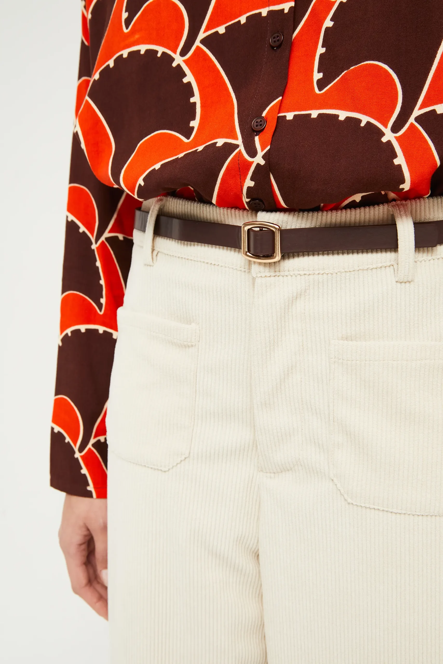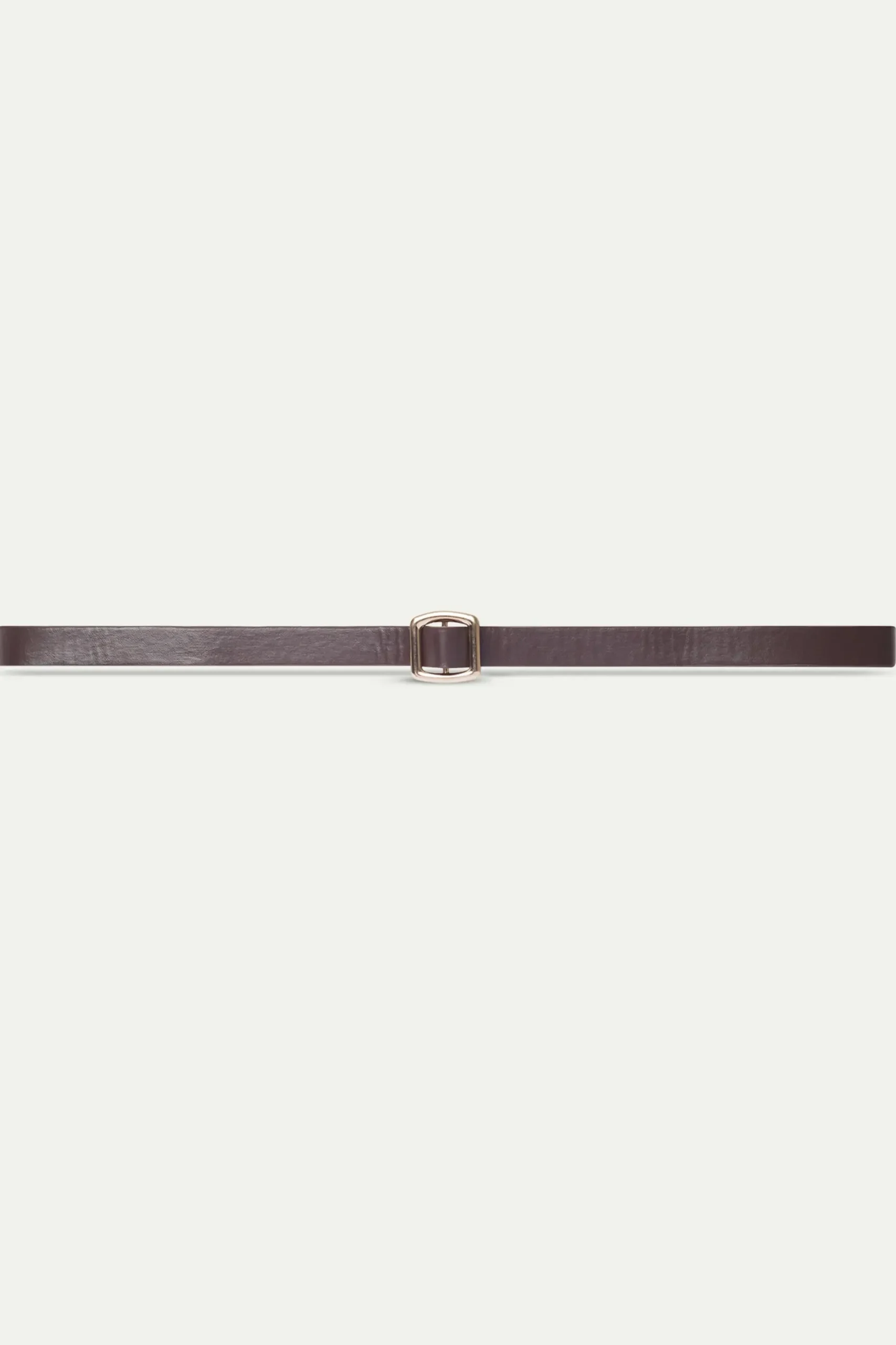 Cinturón de piel sintética de color marrón. Con hebilla cuadrada en dorado.