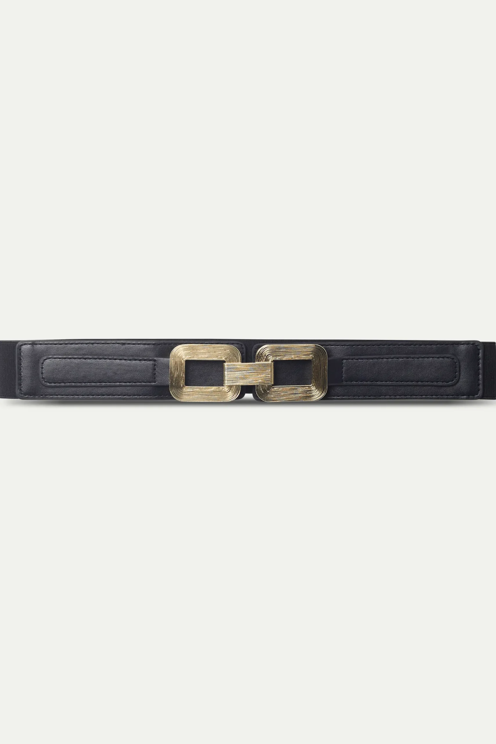 Cinturón ancho de piel sintética de color negro. Con hebilla geométrica en dorado.