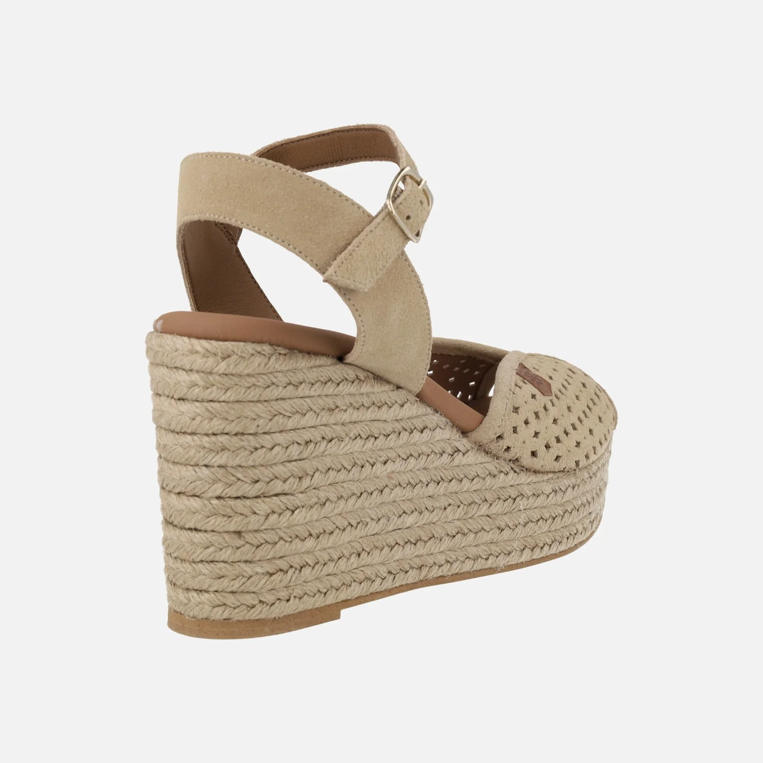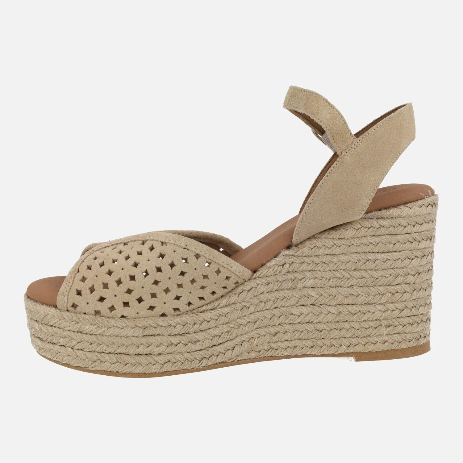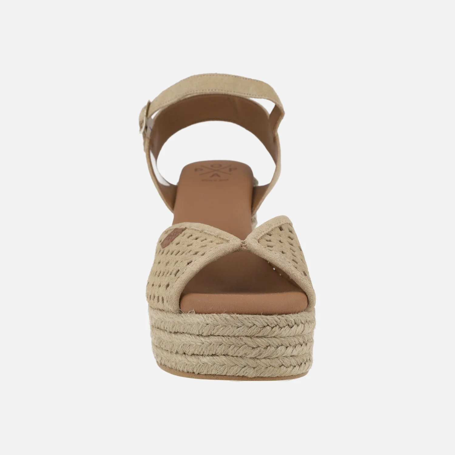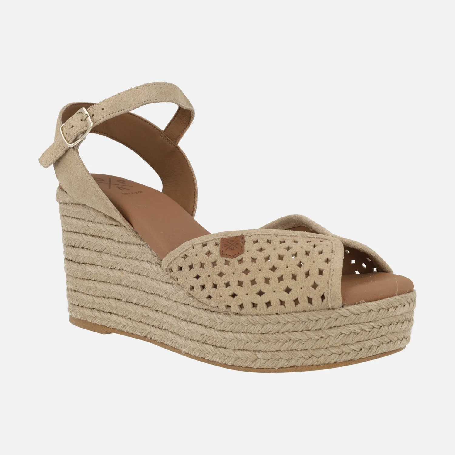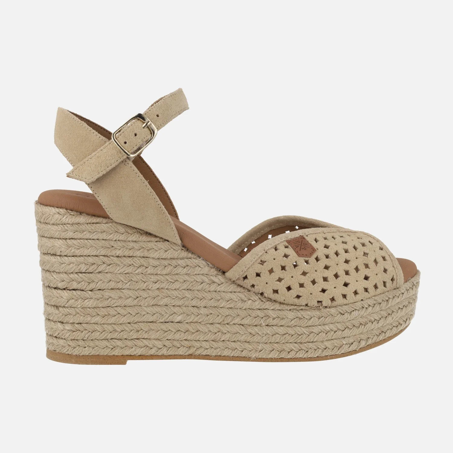 Preciosas alpargatas de la marca Popa modelo Benisa picado beige. Zapatillas de esparto elaboradas en piel serraje beige con detalle de picados. Pulsera al tobillo con cierre de hebilla. Interiores en sintéticos. Cuña alta de yute natural, con casi 10cms de altura trasera y 3,5 cms en la parte delantera.