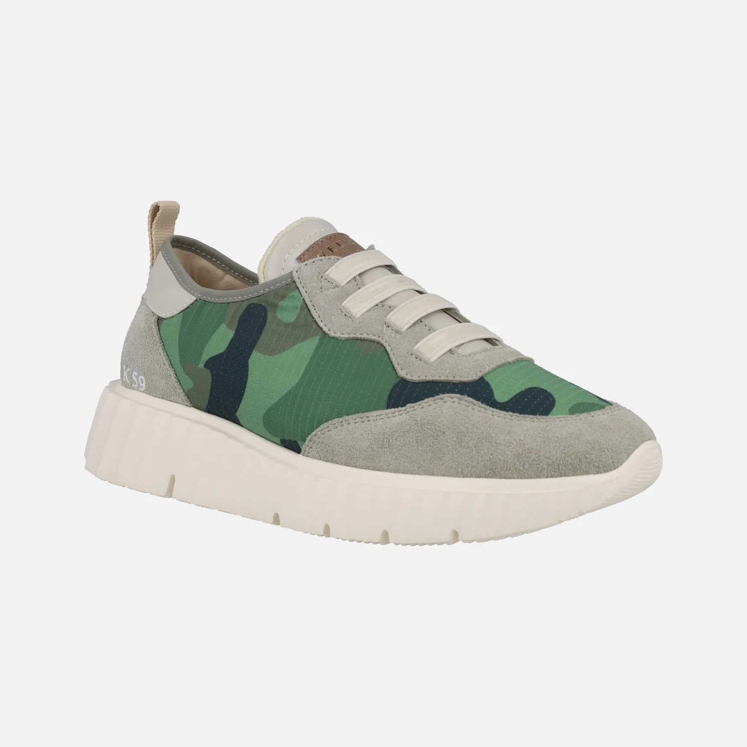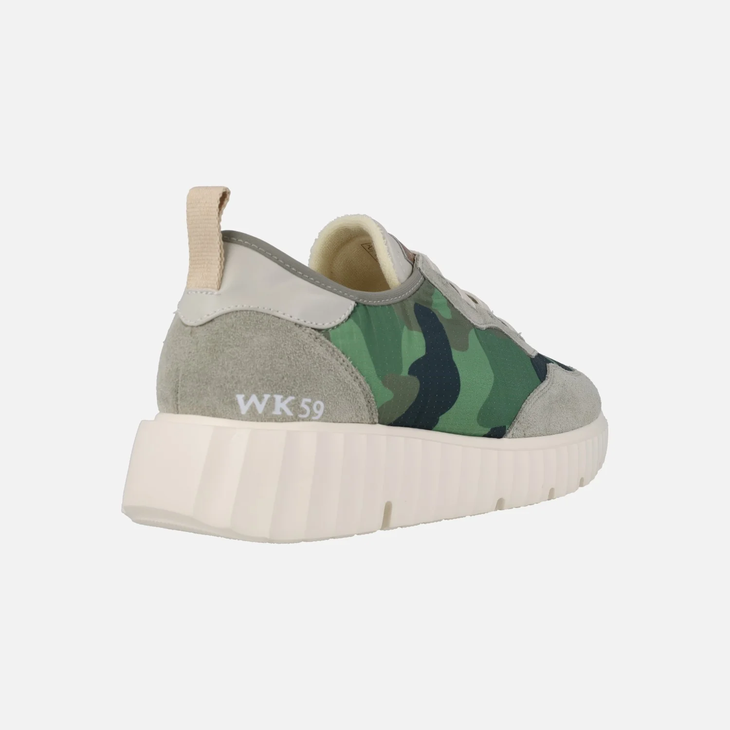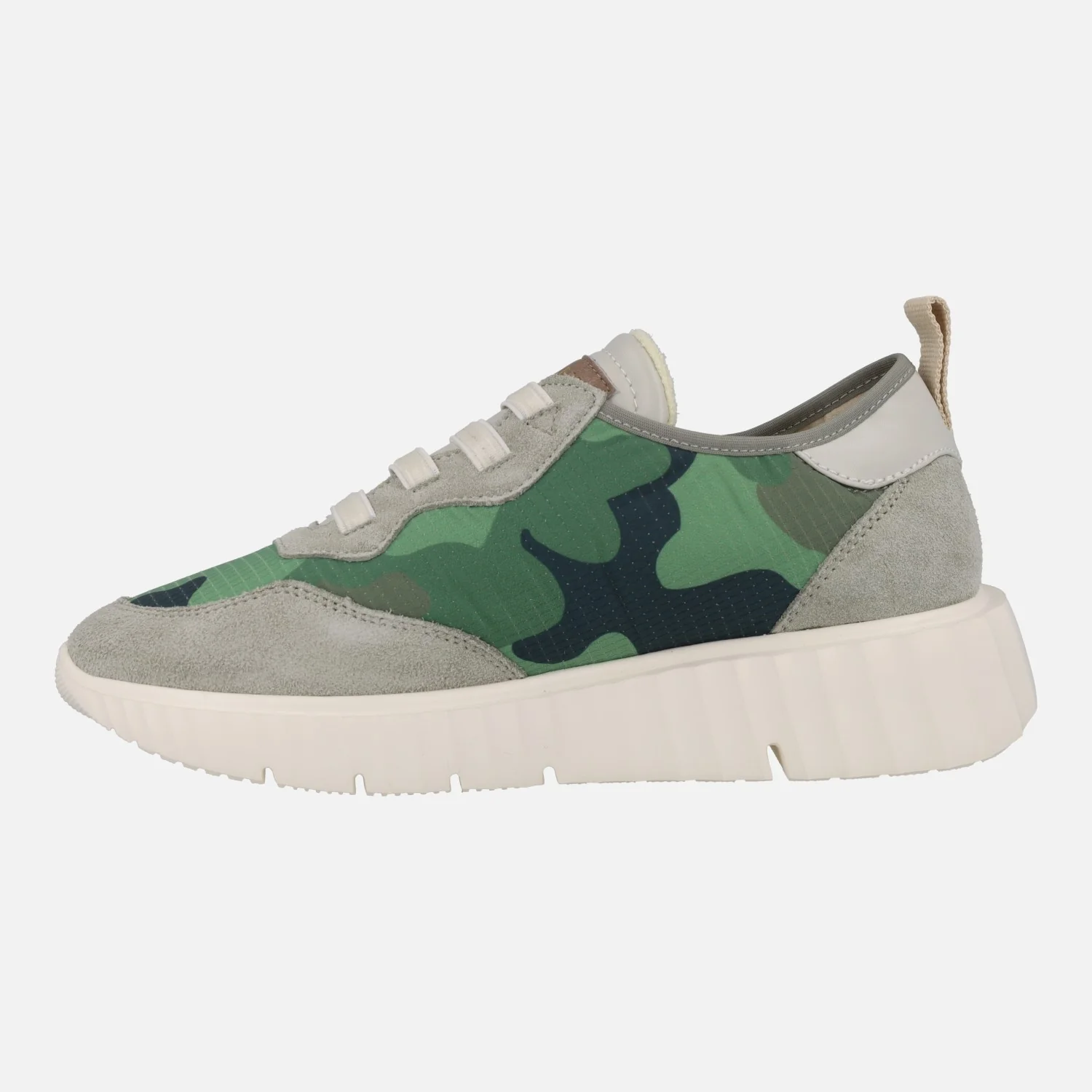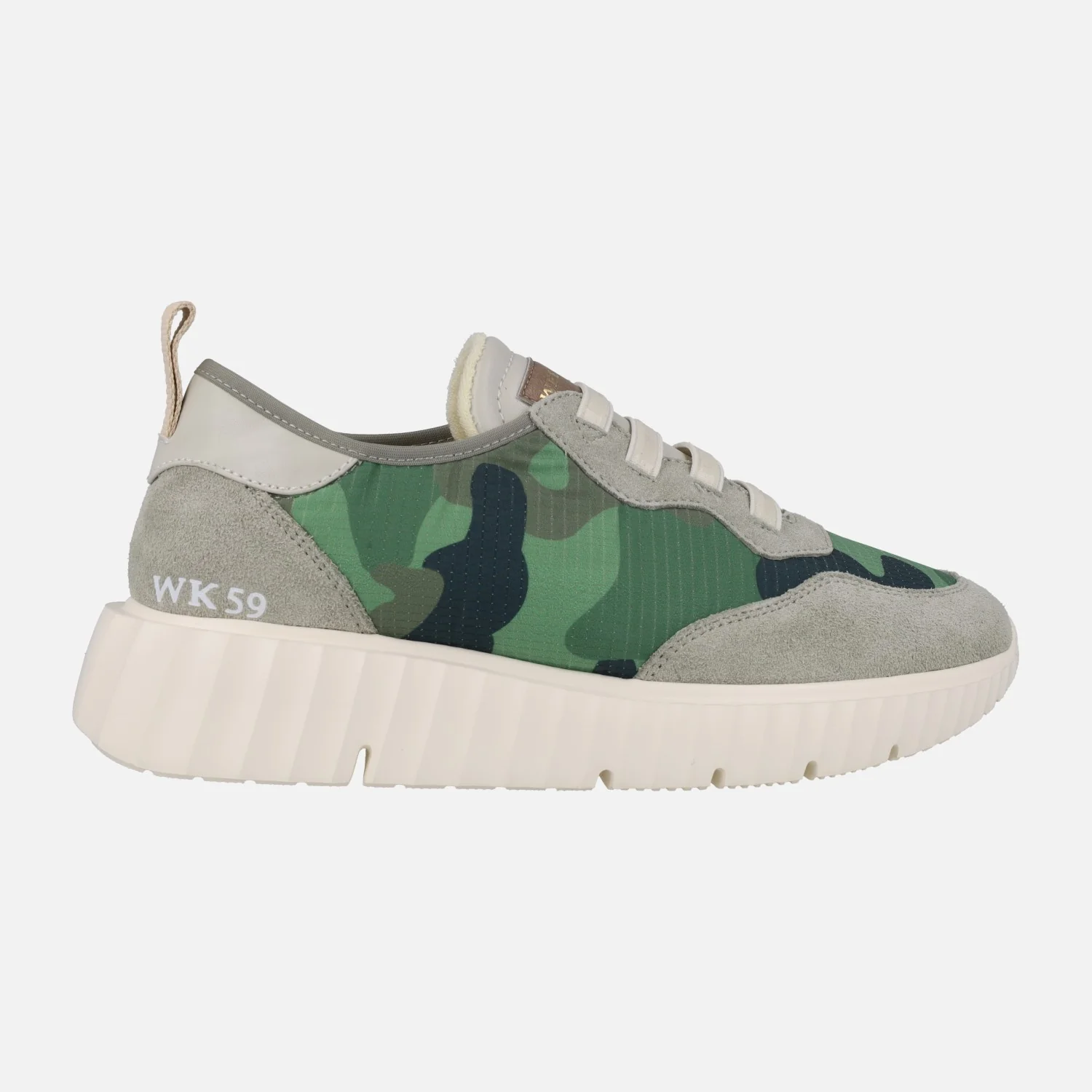 Zapatillas deportivas para mujer modelo Concordia 12075 Mimetico Kaki de la linea Weekend de Pedro Miralles. Deportivas elaboradas en tejido estampado camuflaje verde con cordones elásticos. Piezas en piel y serraje en tonos grises. Interior textil con plantillas extraíbles. Piso de goma muy ligero, con 4 cms de altura trasera (2,5 cms en la parte delantera).