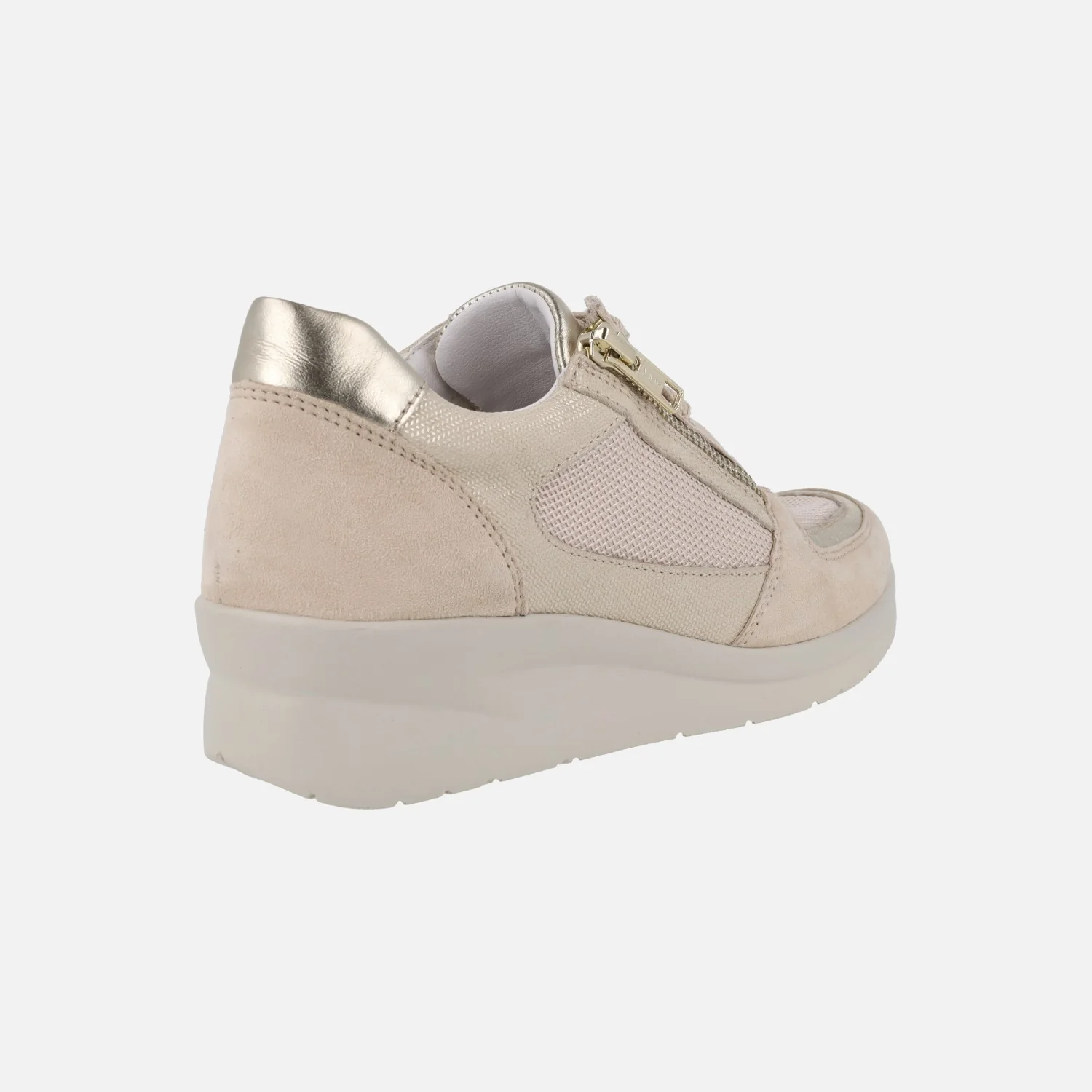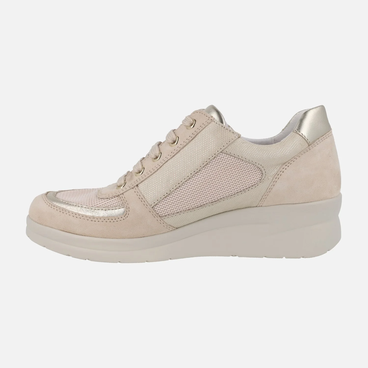 Zapatos deportivos en piel y tejido para mujer modelo 80104 de la marca RIPOSELLA. Deportivos con cierre de cordones y además cremallera lateral para ponerlos con mayor facilidad. Elaborados en piel metalizada, serraje y tejido, en combinado beige. Interior textil con plantillas extraíbles forradas de piel. Piso de goma, con 4 cm de altura trasera (1,5 cm parte delantera).