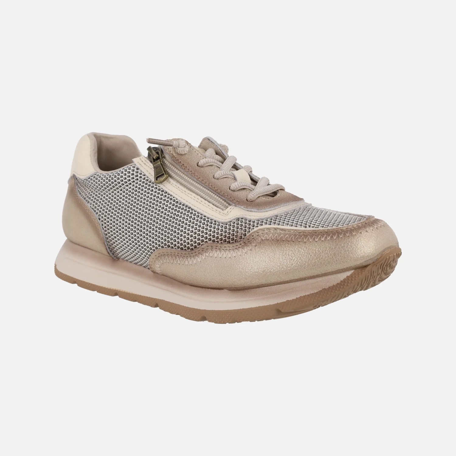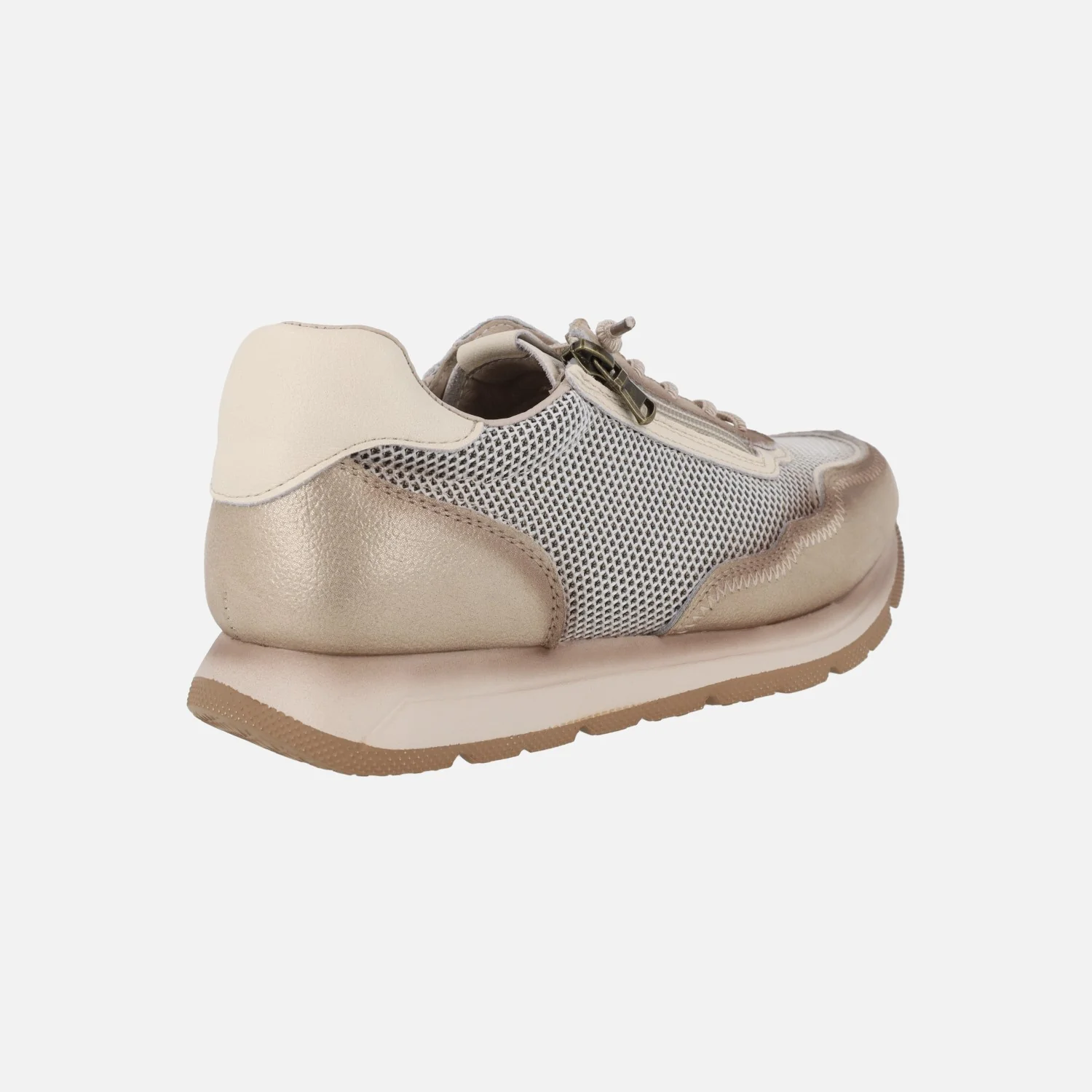 Zapatillas deportivas para mujer de la marca Calzazul modelo 381 Oro. Zapatillas elaboradas en piel y tejido rejilla, en combinado oro. Cierre con cordones elásticos además de cremallera en el lateral exterior. Interior textil con plantillas extraíbles. Piso de goma, con 3 cms de altura trasera (2 cms parte delantera).