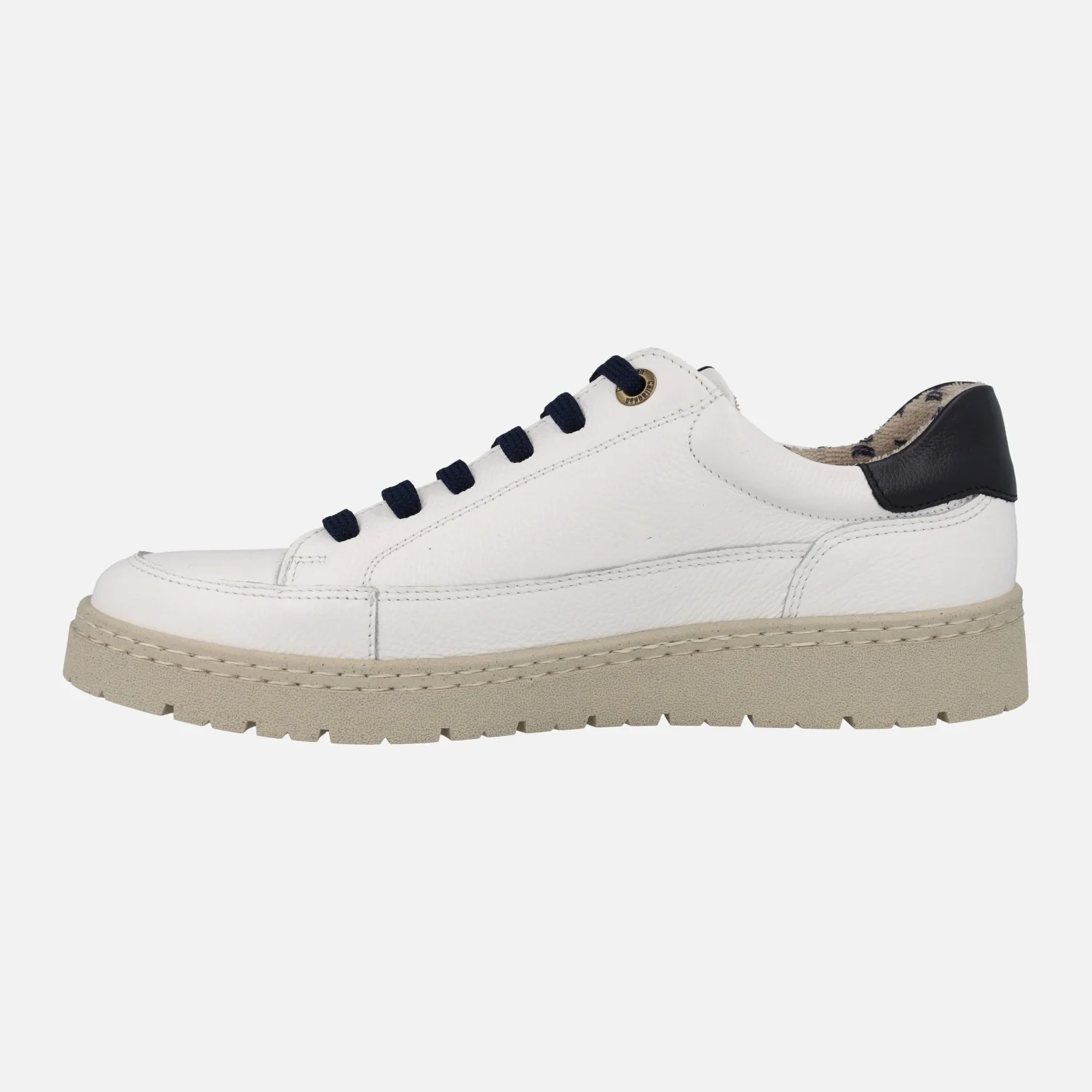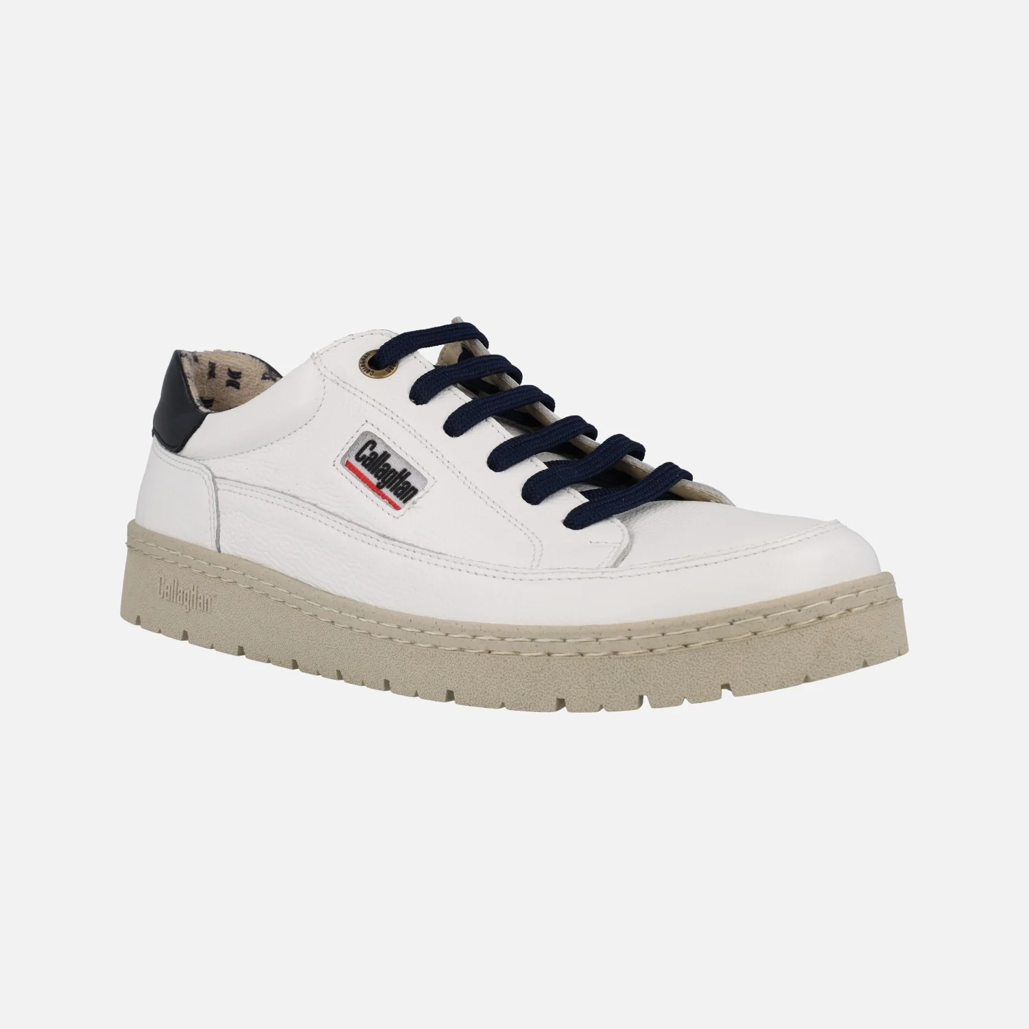 Zapatos deportivos para hombre de la marca española Callaghan modelo 55210, realizado en piel Blanca con cordones y talonera en Azul. El forro es textil y transpirable y las plantillas extraíbles son también en material textil. Este deportivo lleva incorporada la tecnología Adaptaction, que hace que se adapte al pie al caminar y aumente unos milímetros con la pisada. Piso de Goma.